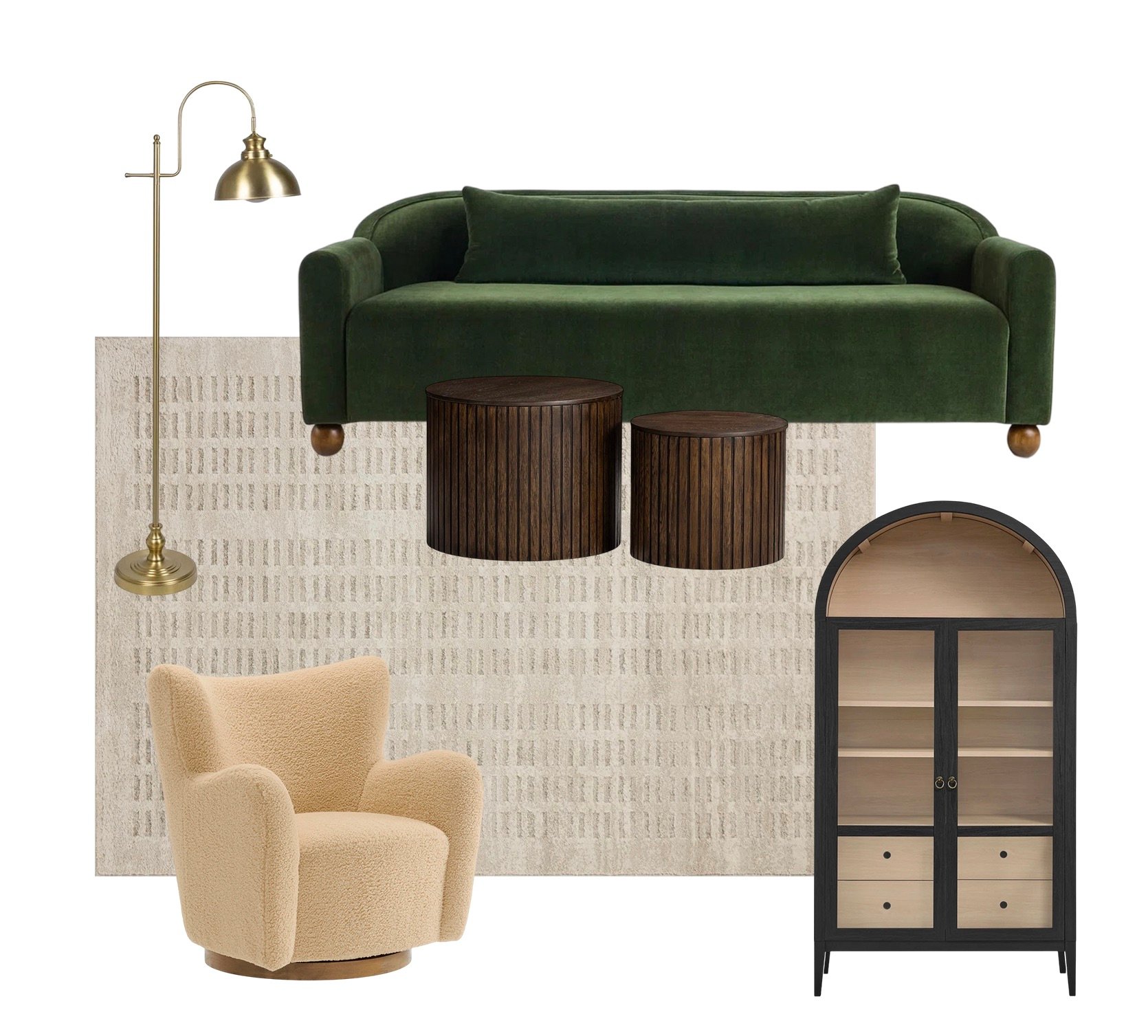 Same colors as the one before, but a very different vibe! You may recognize this elegant (and comfortable) sofa from the opening photo since two of them are now living in Emily’s own living room! With this design, I went a little more refined, traditional, but still cozy. To offset the visible weight and contrast the style of the sofa, I chose these two coffee tables. Then, to talk to the shape of the sofa and the curves of the swivel chair, I chose that beautiful cabinet. The two-tone is really pretty, and I love that there is both open and closed storage for all pieces you may have picked up in your travels?? Just saying:) The pattern in the rug speaks to the lines in the coffee tables as well. Finally, to drive home the traditional style, I chose that very comfy-looking swivel wingback chair (also good for being able to face the sofa and then turn to the TV, if applicable:)) and that great gold lamp.