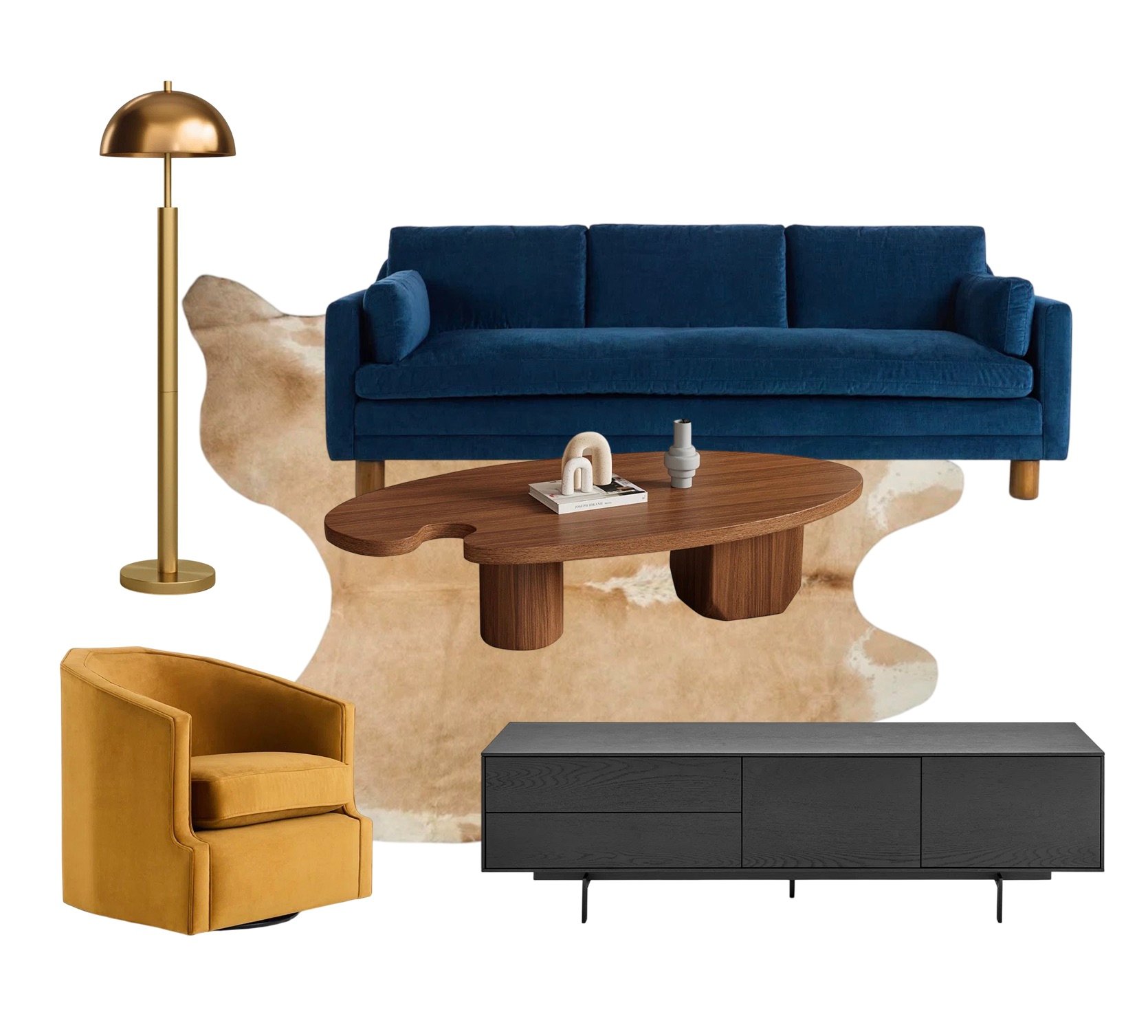 Here is the final design with the crowd favorite sofa…Oscar. Emily has coined it as “the most sinkable” in the collection, and she is right. All of the sofas are comfortable (we wouldn’t design/sell ones that weren’t), but this is the one you actually sink into. It’s pretty amazing, and that blue velvet is stunning. This living room design was also inspired by an Emily room from way back when. The blue sofa and cowhide rug are the major callbacks, IYKYK. She also says that cowhides are extremely easy to clean and was the best rug when her kids were little. Midcentury modern style is a heavy influence here with that beautiful media console, brass lamp, and color of the swivel chair! There’s a little less of a balance of the top and bottom visual weight I’ve been talking about this whole post, but the coffee table is so chunky that it’s a perfect in-between.