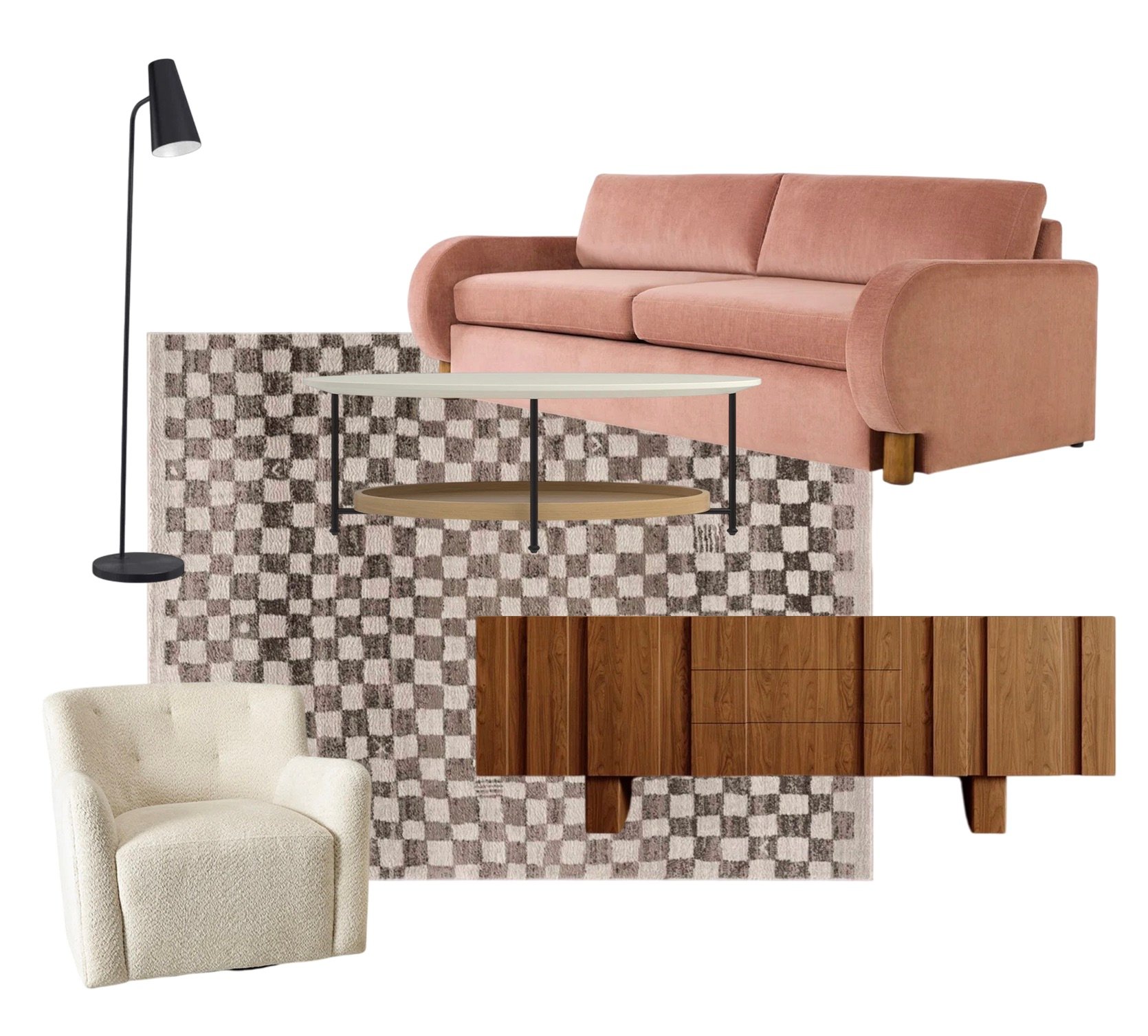 What’s happier and more fun than a pink sofa?? This one is actually even a little softer, dustier pink in person. We were very specific in picking the prettiest and most versatile tone. Then, with this living room design, there’s a nice balance of curves and offset linear geometry. The sofa, oval coffee table, and swivel chairs (yes, it’s a set of two!) fall in the curve category, while the rug, media console, and lamp (in a way) are very linear. I love that both the rug and console have this “not perfect” geometric pattern. It feels very fresh to me. There’s also that nice balance of top and bottom visual weight distribution, don’t you think? It’s a little modern with a hint of traditional, and neutral, but with an exciting yet calm pop of color.