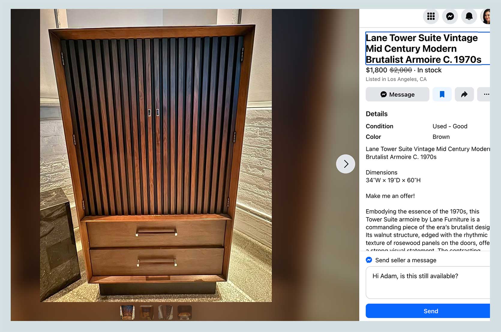 Lane pieces from the mid-century are incredibly popular, so supply and demand come into play here on pricing. You definitely want to go see something of this price in person if you can, both to check the condition of the piece but also to make sure the scale feels right. This one is likely not overly large, at about 5 feet tall by 3 feet wide.