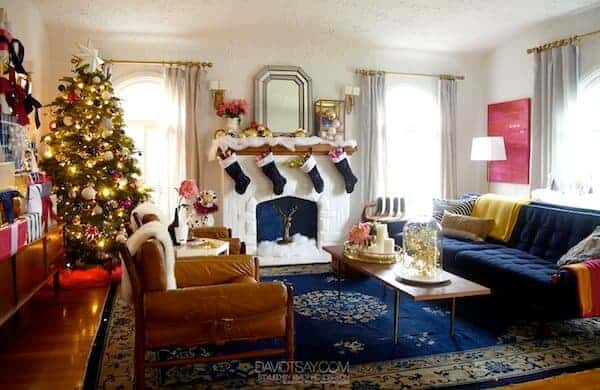 I decked my mantel out, but in a super easy way. For stockings i found these navy blue classic guys at Moskatels in downtown LA for $3.99 each. I love how classic they are but in an updated, less traditional color. They aren’t terribly high quality and I’m sure will only last if we don’t use them. Poor Brian is getting bubble wrap and empty boxes in his stockings since that is what we styled in them. But hell, he loves bubble wrap! I mean, the unexpected yet totally expected pop really gets you every time. For my mantel styling tips watch this video.