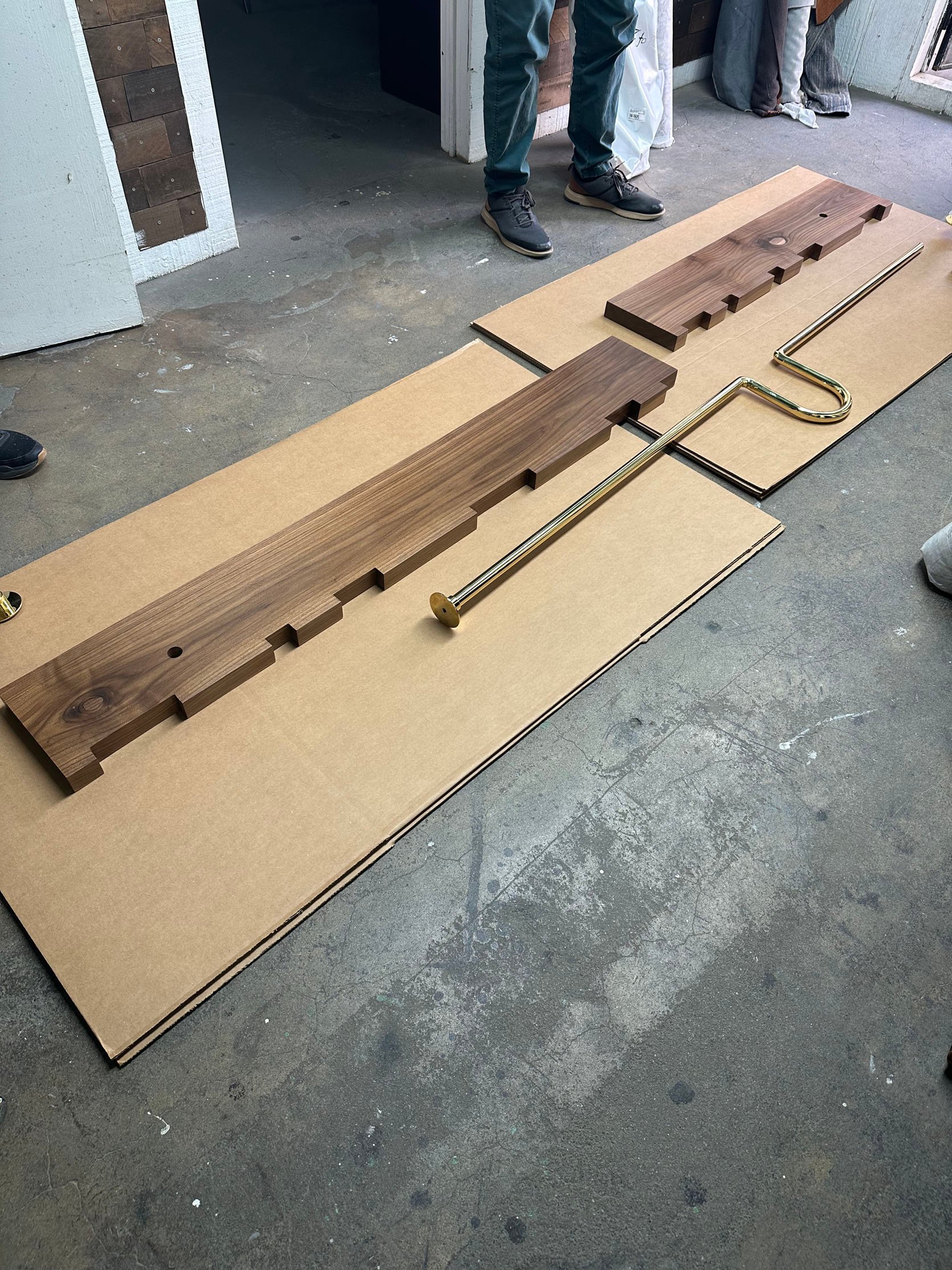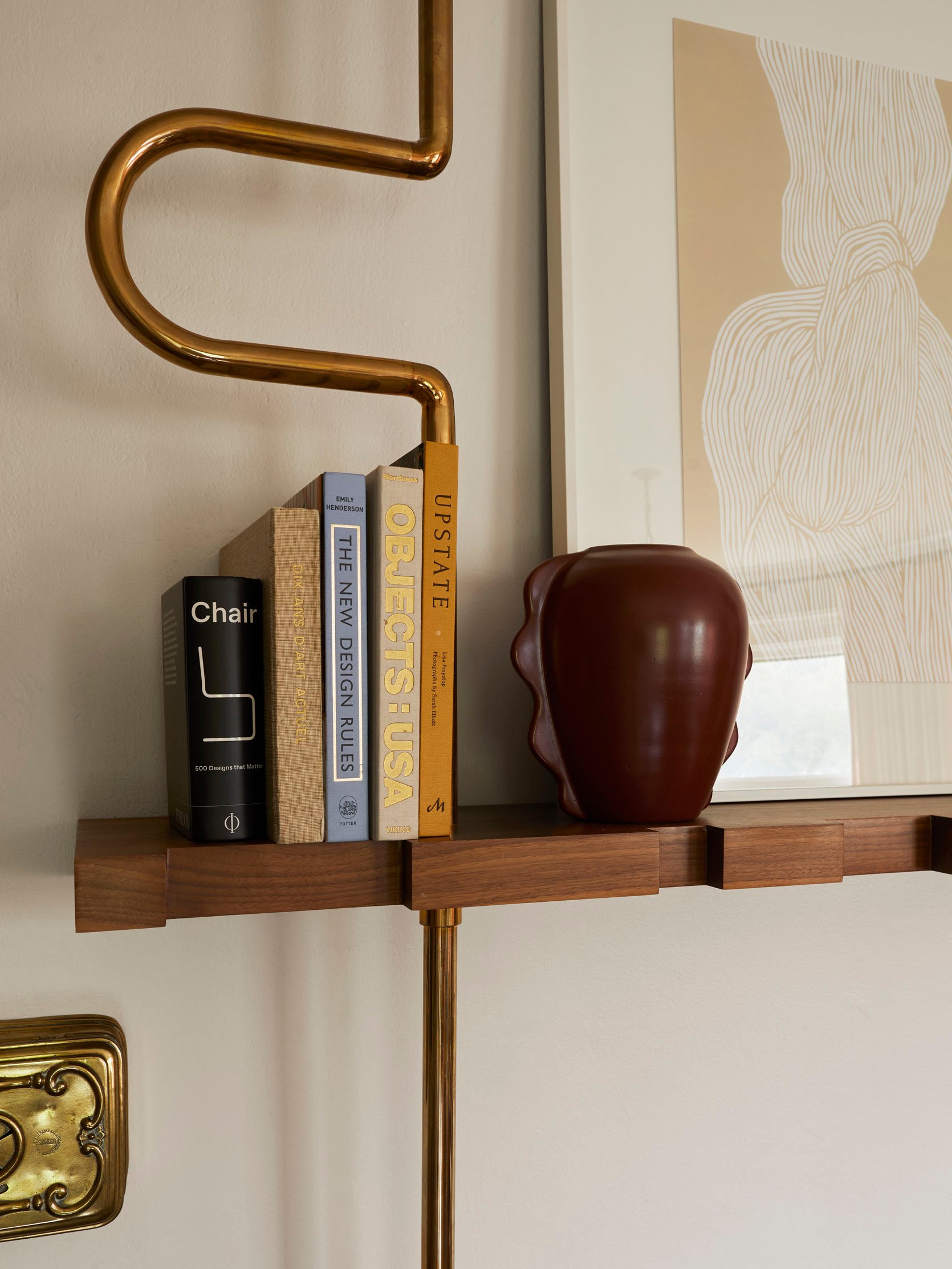 Speaking of the shelves, take a look at the details. The unlaquared brass finish and the finish on the wood are perfect. The cutouts on the front were an idea I had from a bench I saw in a New York hotel lobby. The bench’s divits weren’t different widths, but I wanted to mix it up to give a more “organic brutalist” look. It wasn’t in the initial design, so I was so grateful that BuildLane was happy to edit that detail so easily. I mean, if you’re going custom, make it count, right?