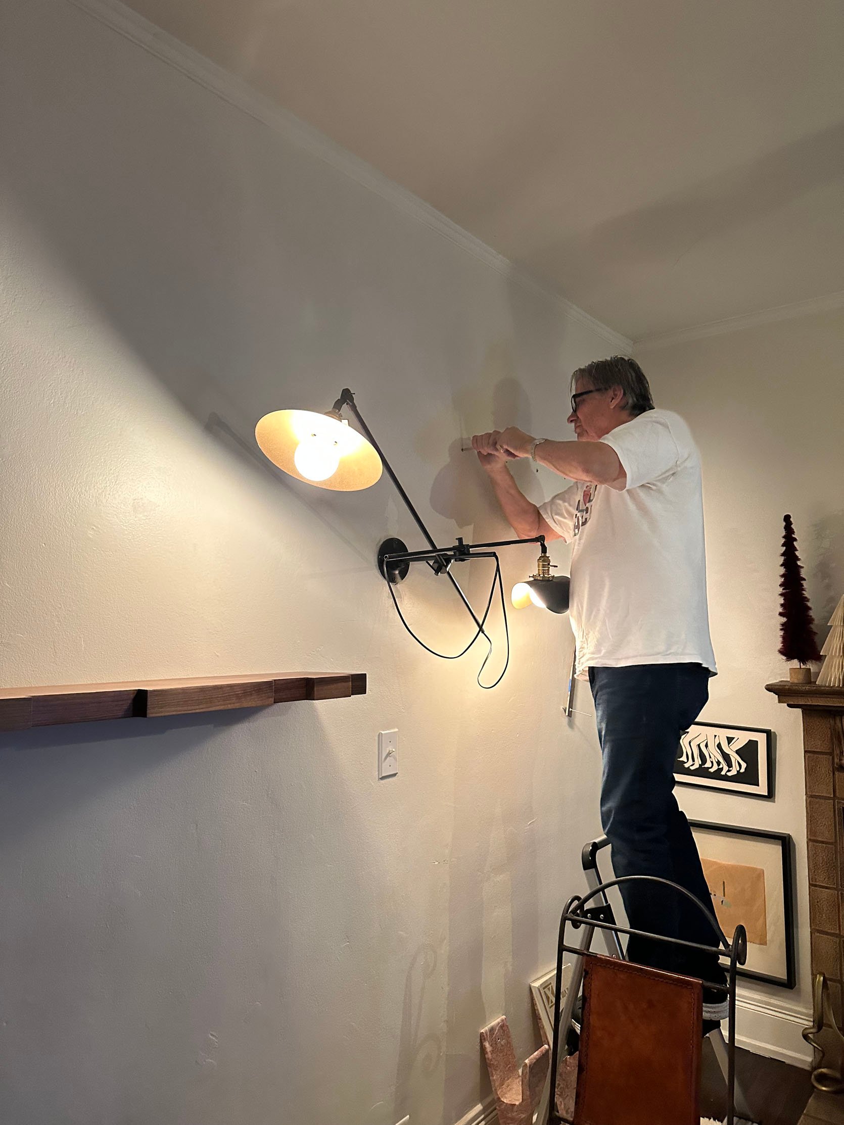 Ah, it’s hard to know where to start, but since I promised to talk about the sconce, let’s begin there. I have a love affair with lighting, and at the top of my “non-vintage” wishlist was a wall light by WO&WÉ. I feel like I first saw their work when I started working here almost 10 years ago. To me, they are modern classics. Knowing how in love I was with the light, my dad offered to get it for me as a wildly generous Christmas gift (I DO NOT deserve him). They are not inexpensive lamps, but given that they are all handmade in France, if they are within your budget, the quality and beauty are phenomenal. I would have absolutely saved up had I not been given this wonderful surprise. What is also a sweet addition to this company is that the designer, Oliver, has been joined by his daughter, Juliette, making it a father-daughter family business. Makes me love it even more. I was able to customize as well. In the standard design, the arm that extends from the wall came out further than I ideally wanted. Since everything is handmade, they were easily able to shorten it. Now it extends just a few inches beyond the depth of the shelves. It’s perfect.