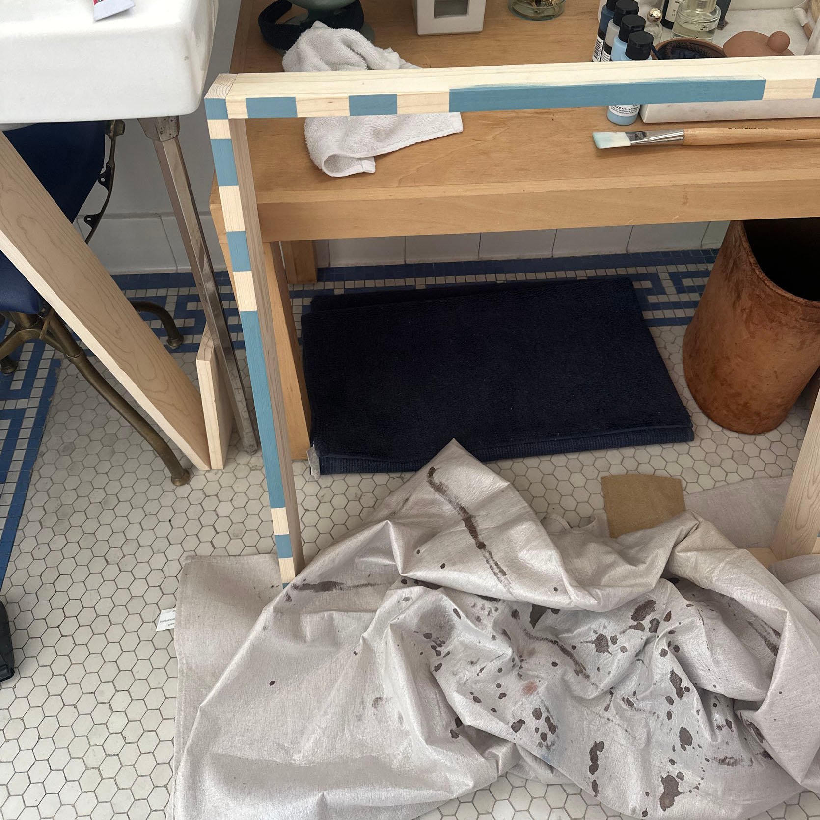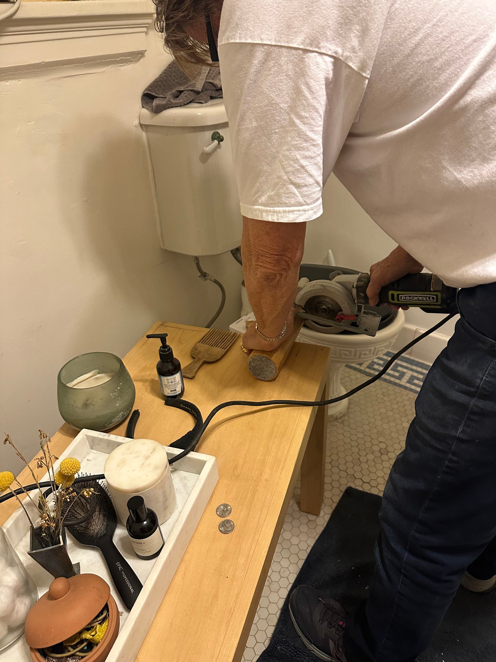 Then last year, I saw this ottoman on Target’s website and thought it could work. I knew it was too tall from the online description, so I went to potentially buy it in person and check to see if dear ole dad (or me) could chop off a few inches from the wooden legs. Well, as you can see from the workshop in my bathroom, it was a success.