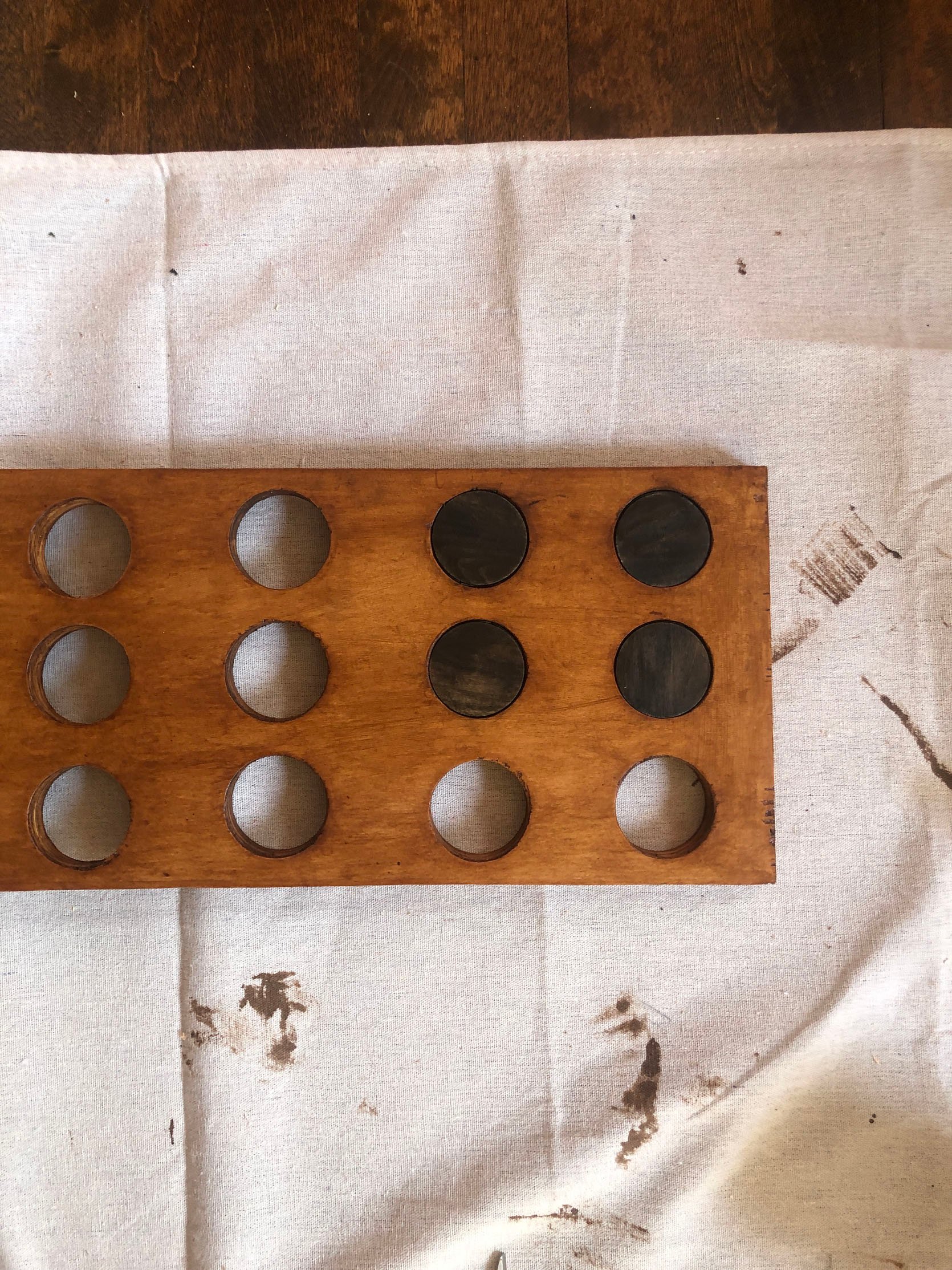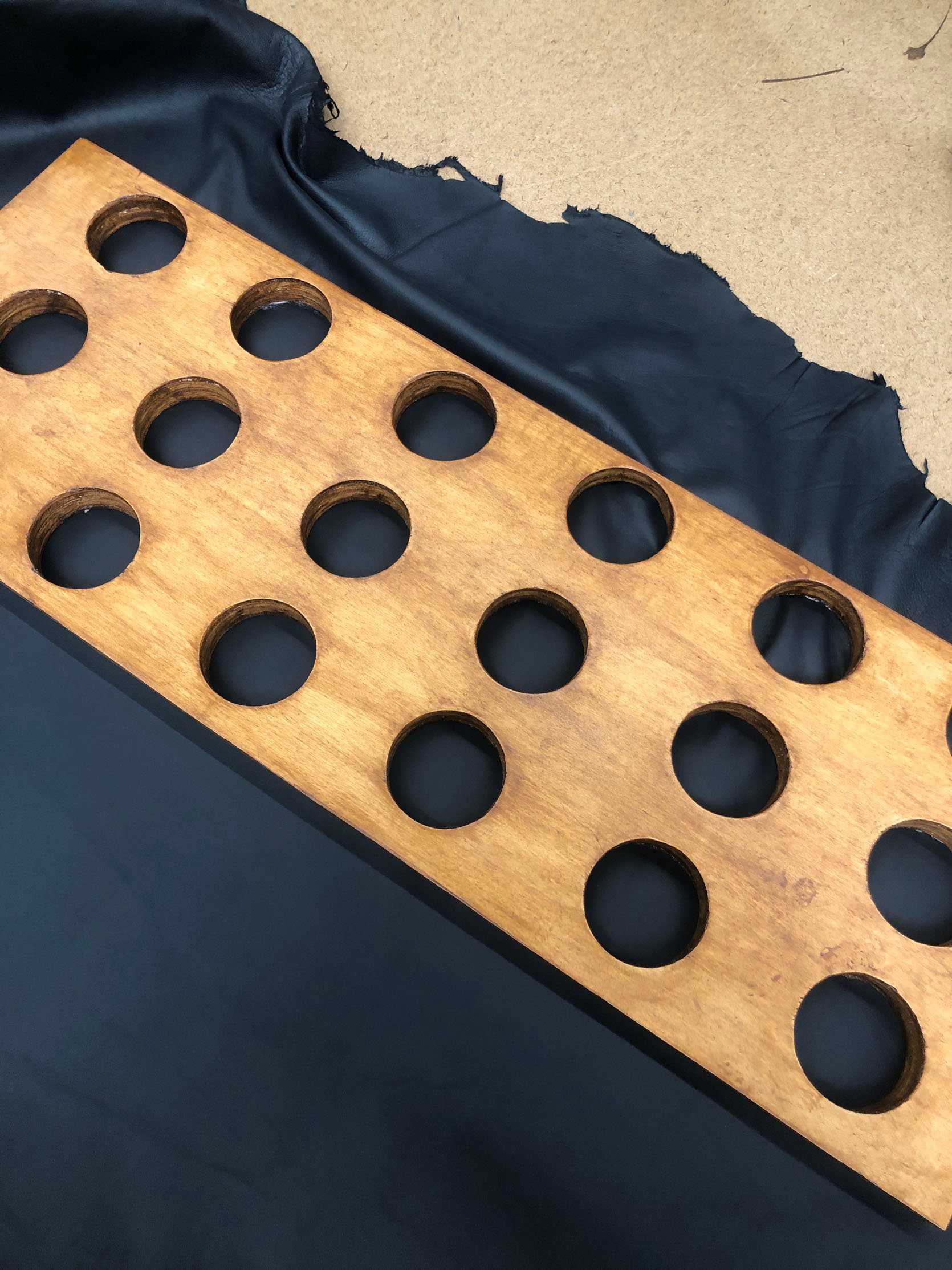 Then, after all of the holes were cut out and everything stained, I thought it would look better/more high-end if I stained wooden circle discs a darker color to have an inlayed look. It wasn’t a full success, so I pivoted and went to Mood Fabrics because I’m a millennial who grew up on Project Runway and bought a couple of pieces of black leather to stretch and then staple-gunned it to the back of the doors. I think I spent a little over $100 on the leather, which I was happy to do just to be done. Now I look at it every day and love it because I put so much into it, and it’s a piece that I did with my dad.