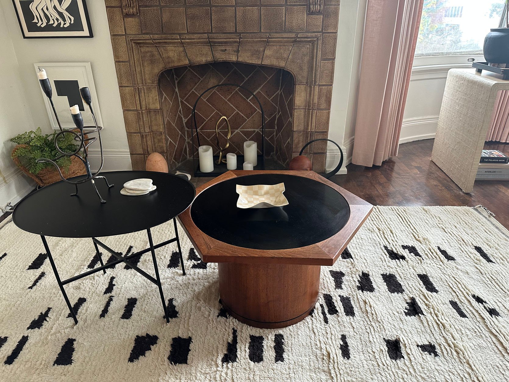 Since we’re on the topic of DIYs. Here’s a little story about my mismatched nesting coffee tables. That black one is from my last living room, and while I love it, it didn’t look right. But I had already purchased that incredible vintage one that I’m fairly certain I got a great deal on. I bought it for $375 (with Caitlin as my “travel/pickup in an unfamiliar area buddy”), but then saw the same one for at least $600 online. A win is a win! But that meant I needed a shorter nesting friend because just the vintage one would have been too small for the sofa on its own.