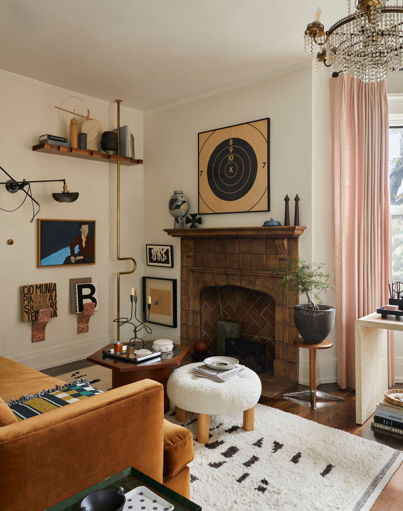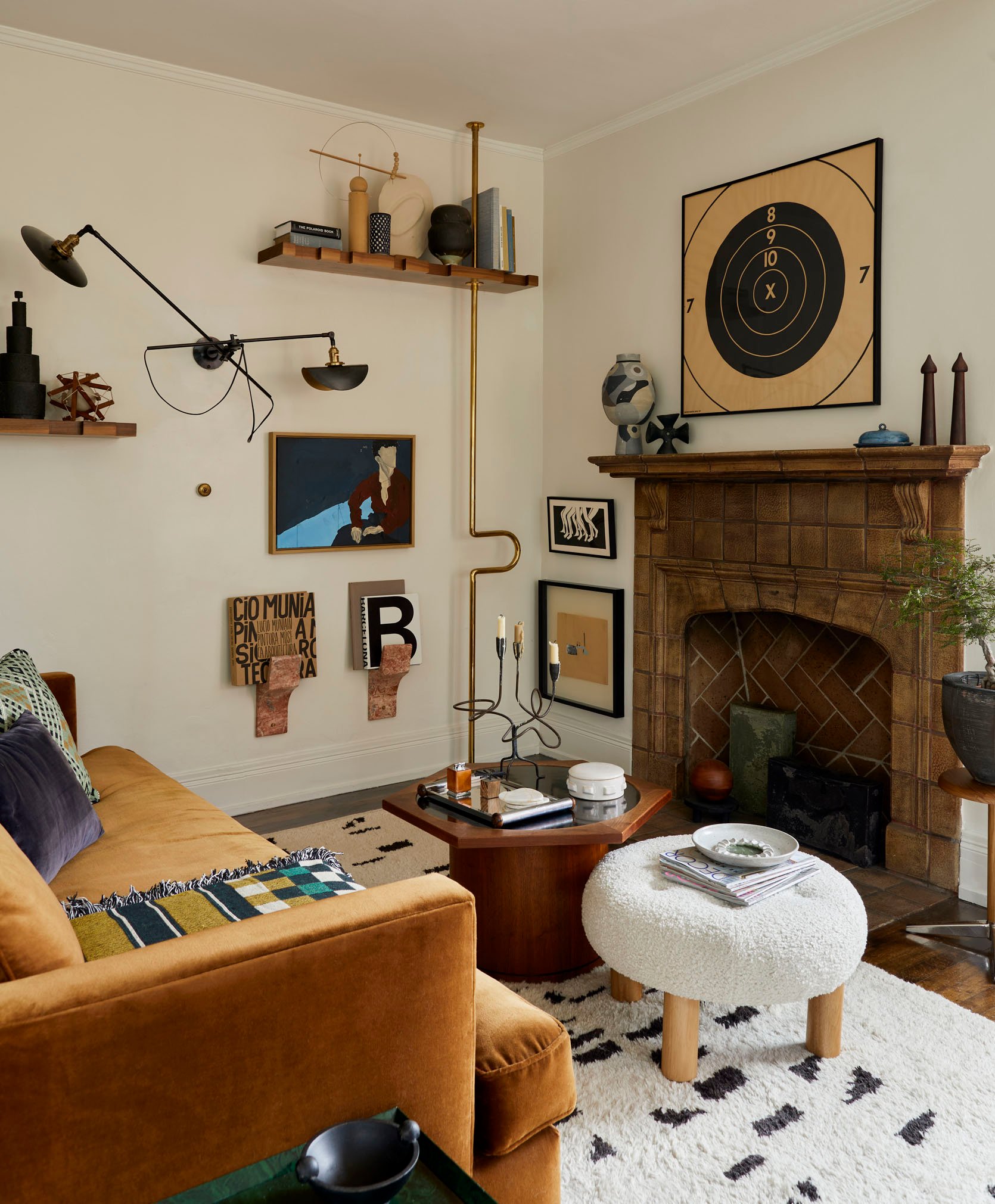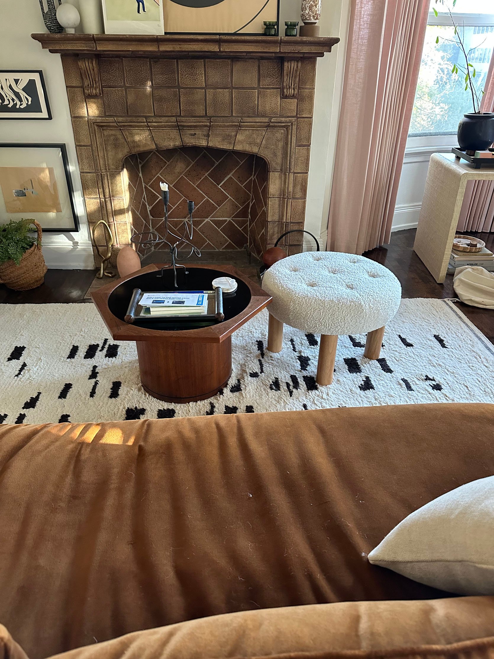 Then came the new sofa. For those of you who might not know the entire EHD alum team, this sofa is part of a collaboration with Lulu and Georgia with one of Emily’s first employees, Ginny Macdonald. She’s an incredible designer, so it was no surprise that her collection was and is so special. I only got to work with Ginny for about a year before Em made the decision to close the client side of the business, and she then started her own firm. Needless to say, she’s as fun and kind as she is talented, so getting to have a sofa of hers was a dream. So aside from it having an extra special meaning, being beautiful, and very comfortable, that delicious cognac velvet totally balanced the room visually with the brown fireplace. I don’t think I had quite experienced that kind of immediate transformation before. All of a sudden, I didn’t feel the need to “figure something out” with the fireplace.