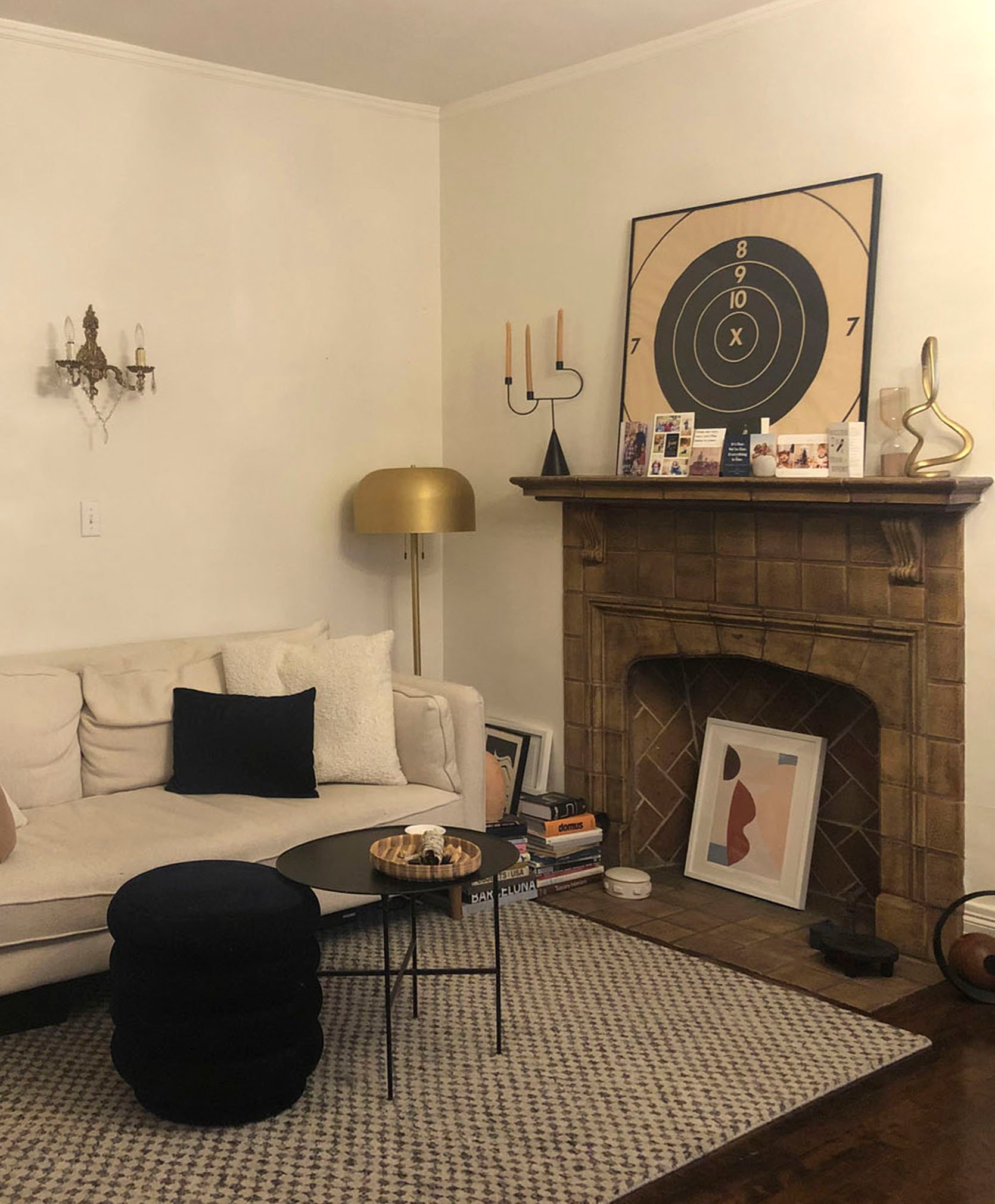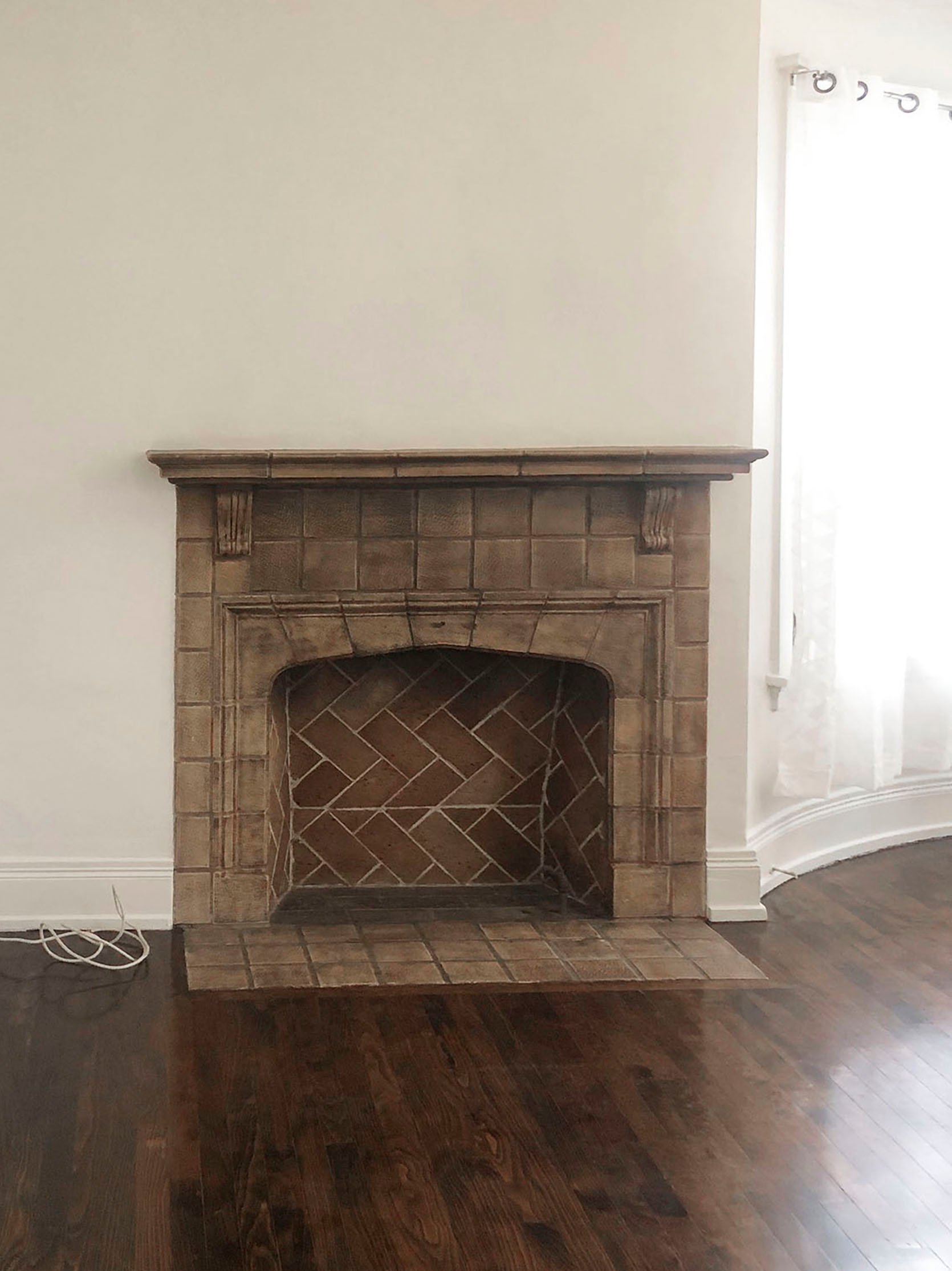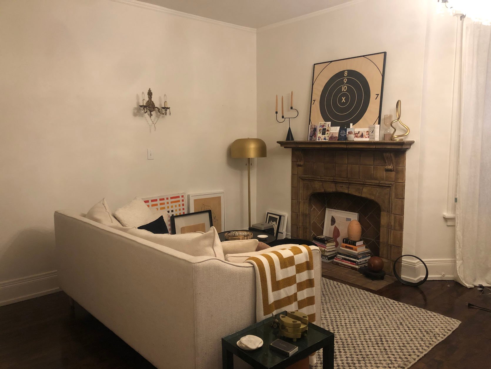 My first major issue, or so I thought, was the fireplace. When I toured the apartment before I moved in, I was beyond excited about this fireplace, working or not (it doesn’t work, FYI). But then I moved in, plopped that light cream colored sofa down, and design mental chaos took over my brain. “This looks bad. I have to make a DIY cover!” I said to myself and anyone who would listen. All of a sudden, the gray undertone of the tiles haunted my dreams, the red(?) spots on the grout mocked me every time I looked their way. Naturally, I called my dad and asked if he could help build something. And because he’s the best, he said, “Draw it up and I’ll see what I can do.”