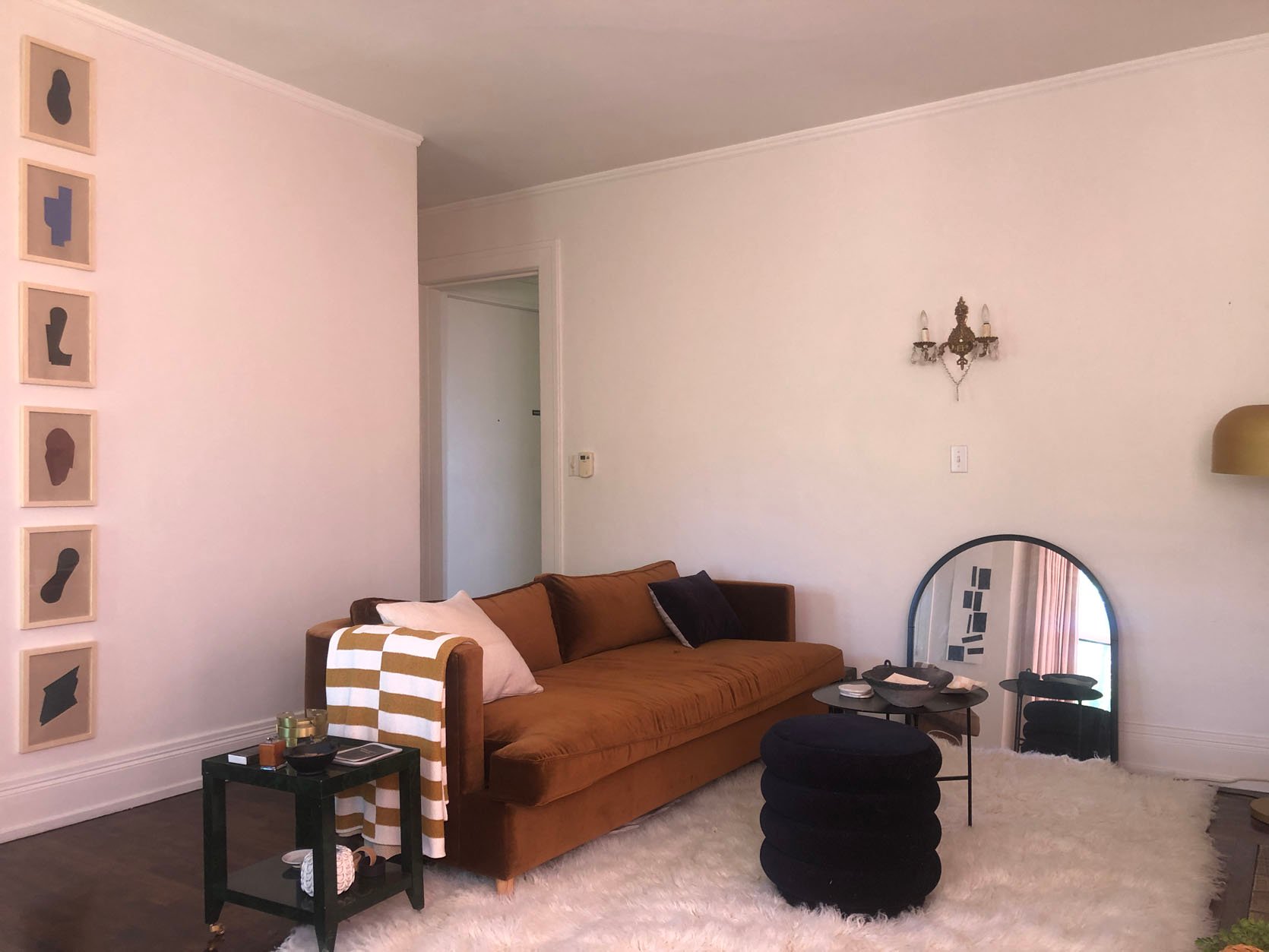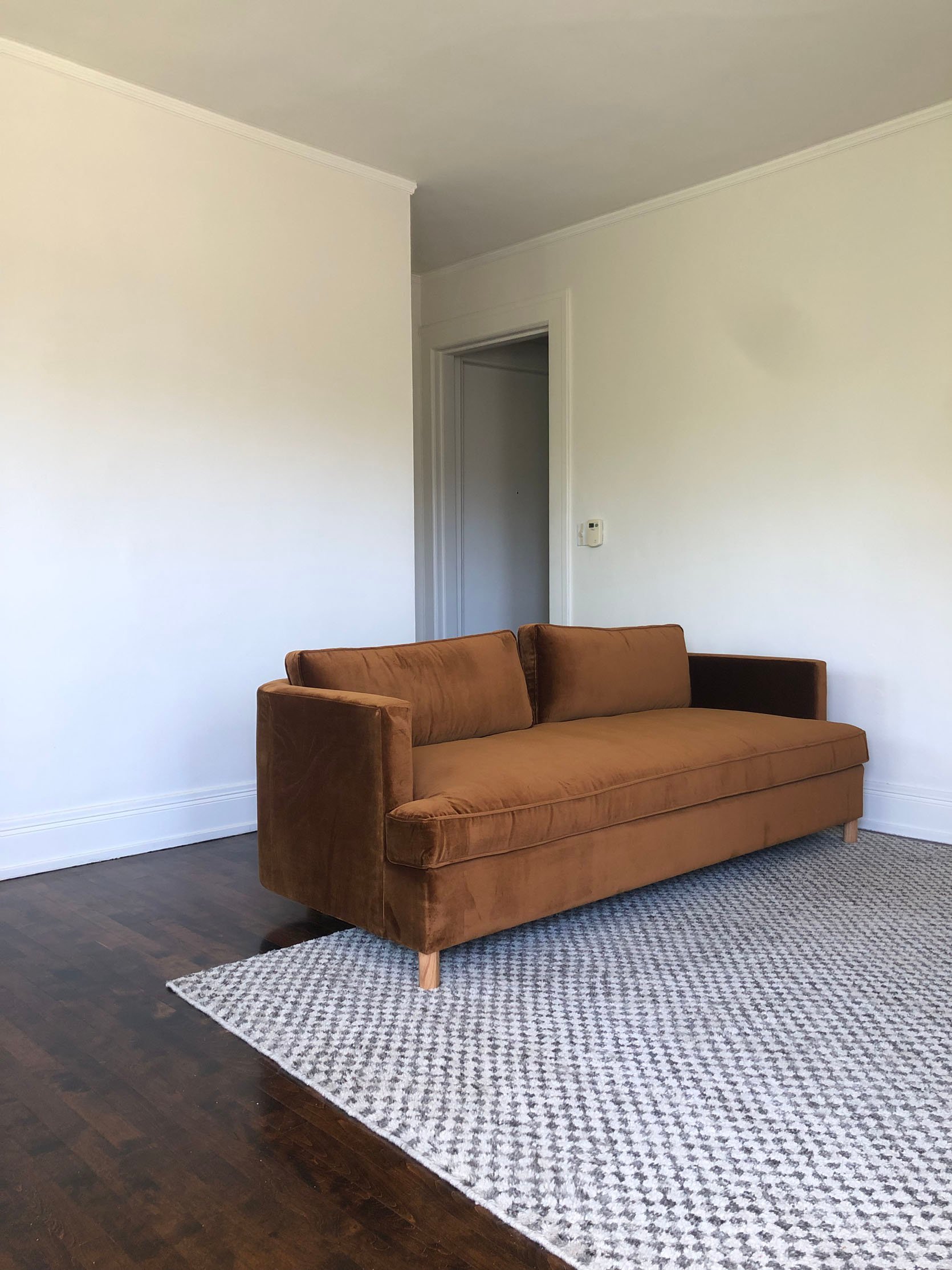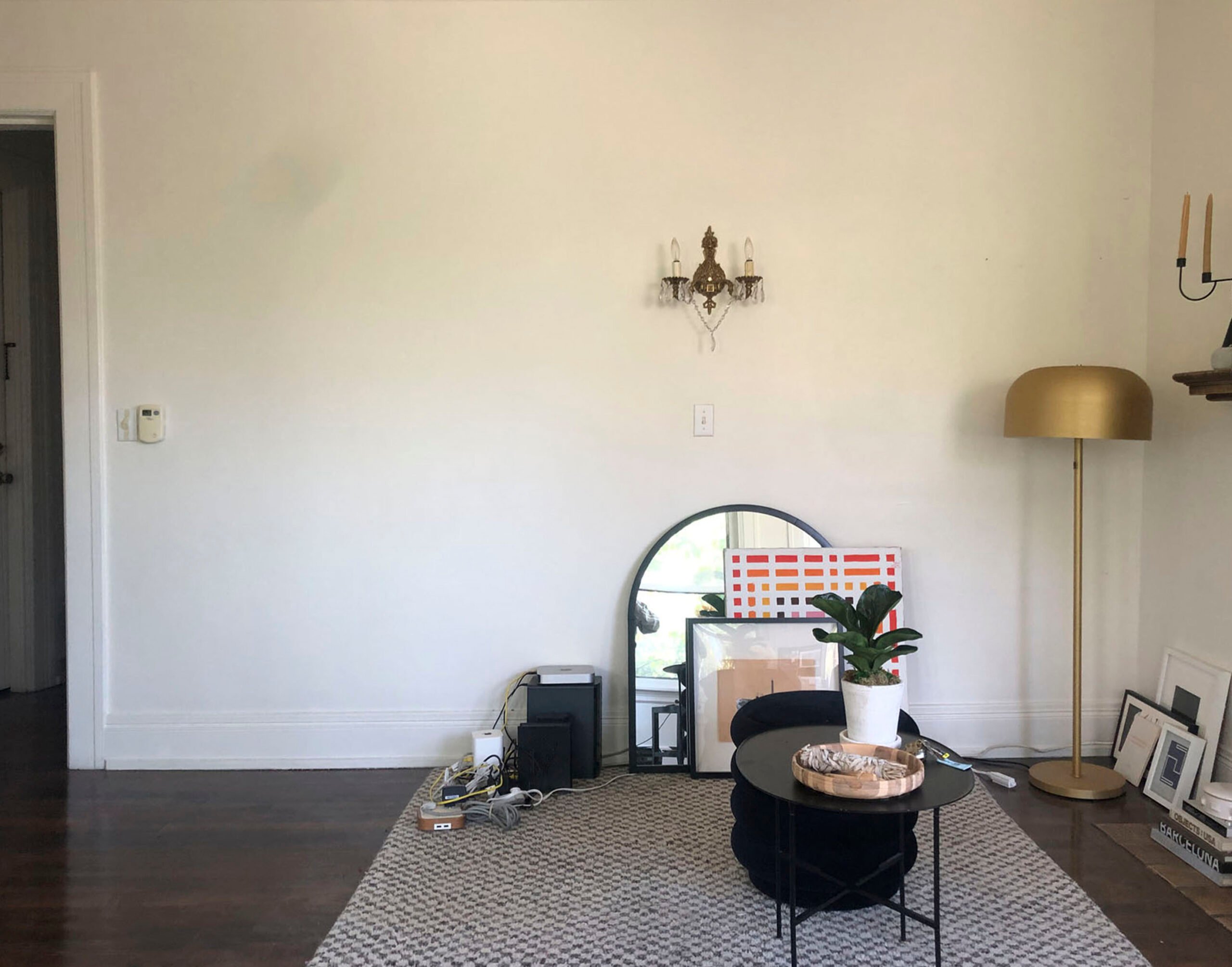 This is more or less where I started when I first moved in. Everything here is from my last apartment, which I used a good amount of in the final design. I tried the furniture layout a few different ways, which I talk about here in this post, but ultimately this one worked the best and made me feel like I had a “living room area” and an “office area” despite them being in the same room.