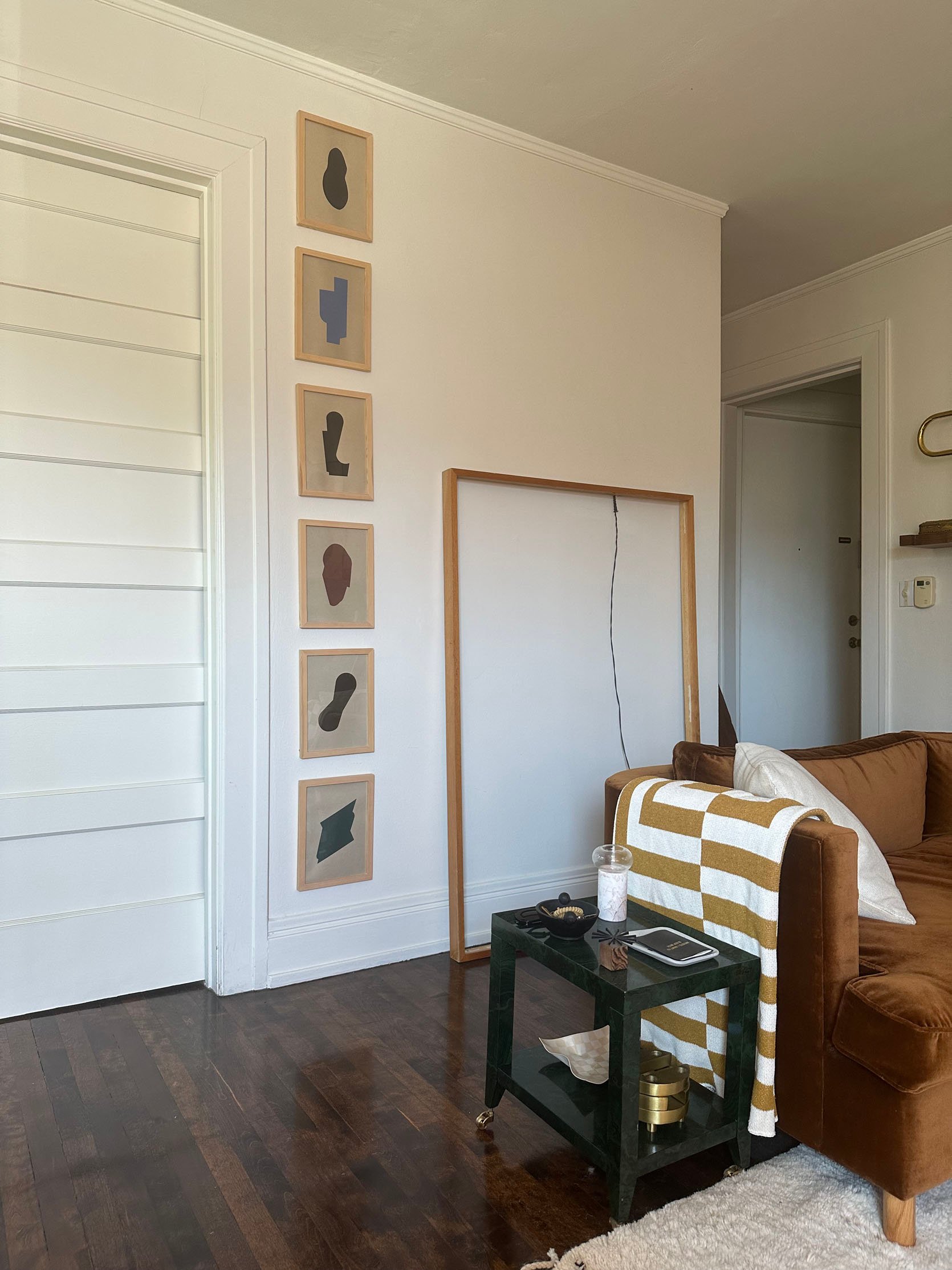 My goal with this piece of art was to add more color to the space. Almost all of my art is black, white, tan, brown, gray, you get it. However, I have this amazing, boldly colored photo print by Arielle Bobb-Willis that I really wanted to display. I bought the paint for the frame, taped out my pattern, and planned to mix the perfect blue. Let’s just say I couldn’t really get the color I wanted, and as I was looking at the frame and even the photo print, it just didn’t feel like a perfect fit for this room. I waited to fully scrap the idea until I found the right piece, and boy, did I. I can’t wait to tell you that story. That gorgeous photo print will find a home in the future.
