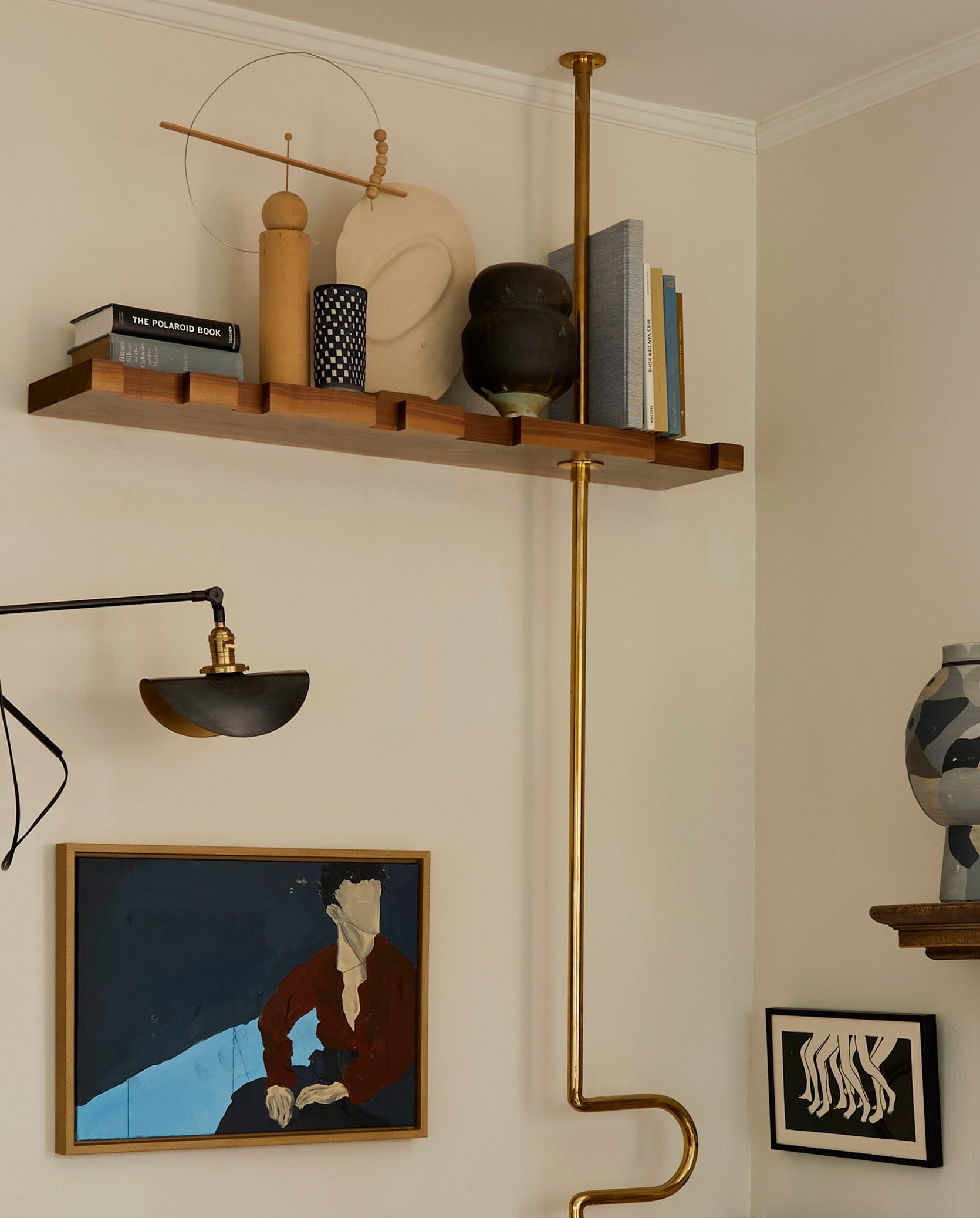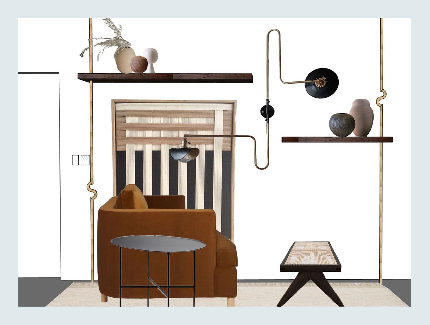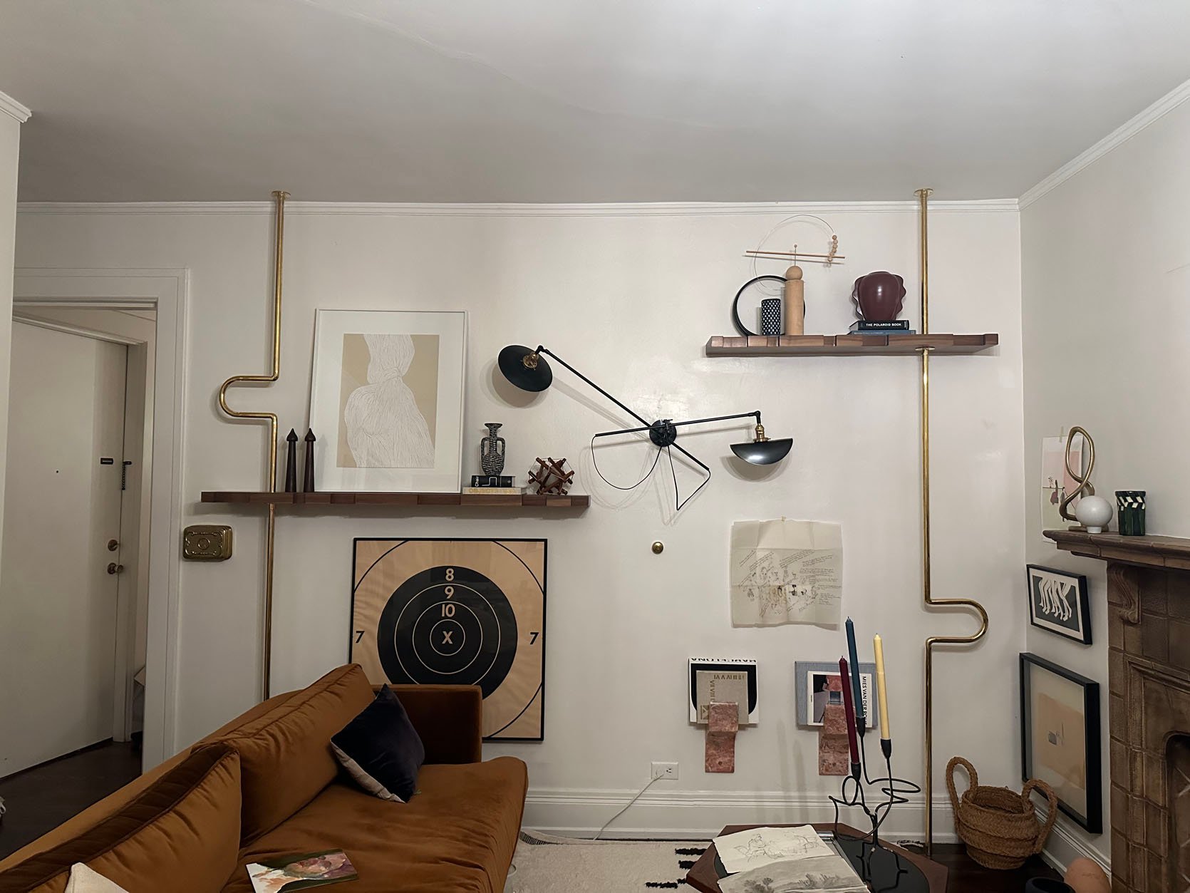 Of course, I thought of maybe doing a gallery wall, but since that was the main feature of my last living room, I wanted to do something different. My next thought was shelves. I looked at some vintage-looking wall-mounted readymade units, but none of them felt right. Now, I knew I wanted an architectural sconce (replacing the one that came with the apartment). So it was then that I thought of doing two asymmetrical shelves with floor-to-ceiling brass bars. There was another detail I was kinda obsessed with, and of course, it was never going to be a copy, because that’s stealing and wrong, but I’d had Flack Studio’s curved utensil bar on my mind since the first time I saw it in Troye Sivan’s AD tour. I wanted/was deserapte to do some kind of curve in the bars. The wonderful and talented Julie Rose was at my place for dinner when I told her my ideas, she gave me some great feedback, and then, without me even asking, made that render above! Naturally, it turned out a bit different in the final design, but this was so helpful to get the initial idea visualized. Thank you, Julie, for always being the best design buddy!!