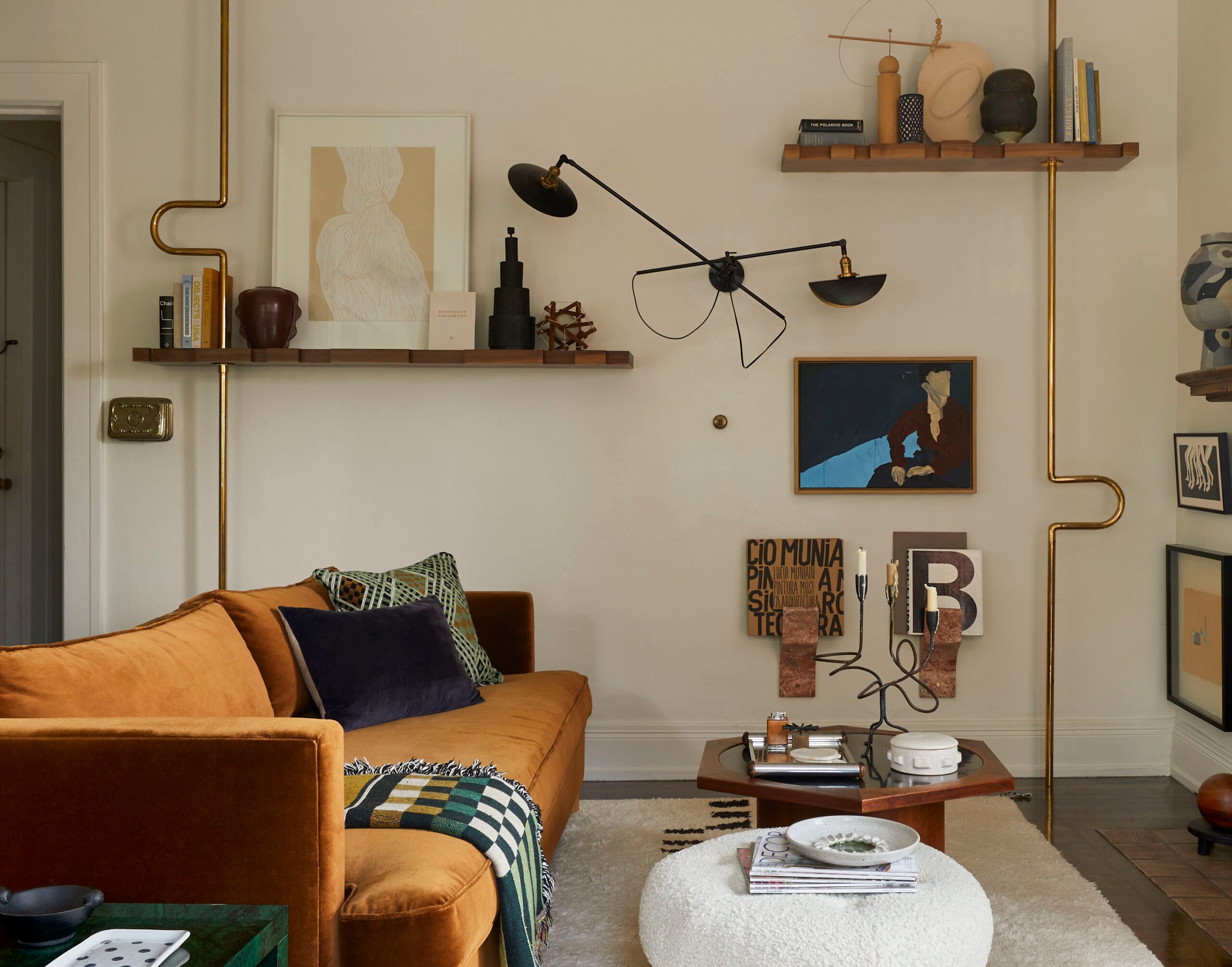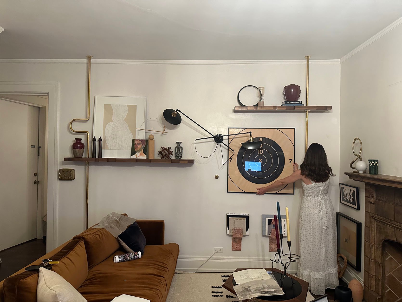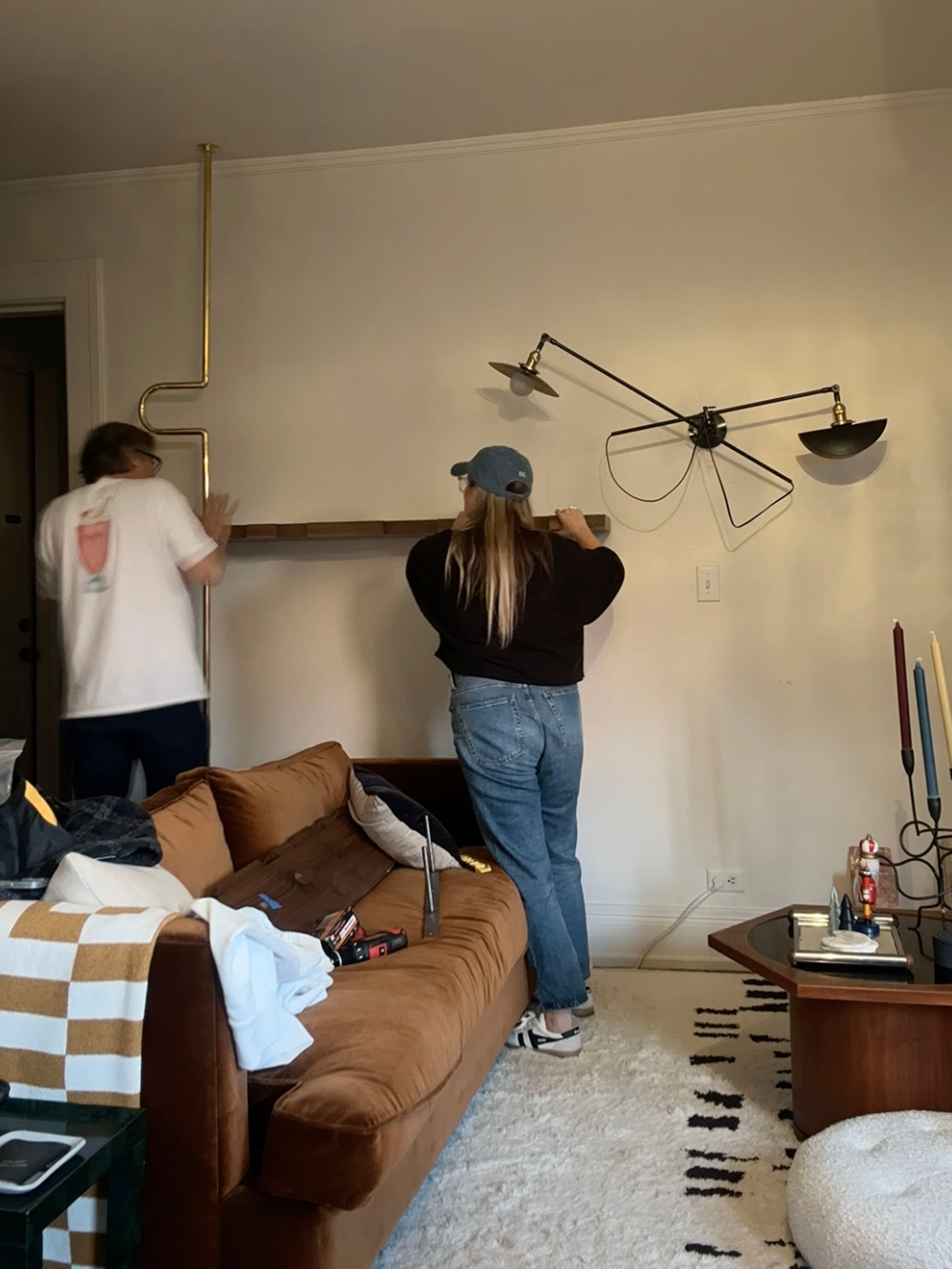 Of course, I thought of maybe doing a gallery wall, but since that was the main feature of my last living room, I wanted to do something different. My next thought was shelves. I looked at some vintage-looking wall-mounted readymade units, but none of them felt right. Now, I knew I wanted an architectural sconce (replacing the one that came with the apartment). So it was then that I thought of doing two asymmetrical shelves with floor-to-ceiling brass bars. There was another detail I was kinda obsessed with, and of course, it was never going to be a copy, because that’s stealing and wrong, but I’d had Flack Studio’s curved utensil bar on my mind since the first time I saw it in Troye Sivan’s AD tour. I wanted/was deserapte to do some kind of curve in the bars. The wonderful and talented Julie Rose was at my place for dinner when I told her my ideas, she gave me some great feedback, and then, without me even asking, made that render above! Naturally, it turned out a bit different in the final design, but this was so helpful to get the initial idea visualized. Thank you, Julie, for always being the best design buddy!!