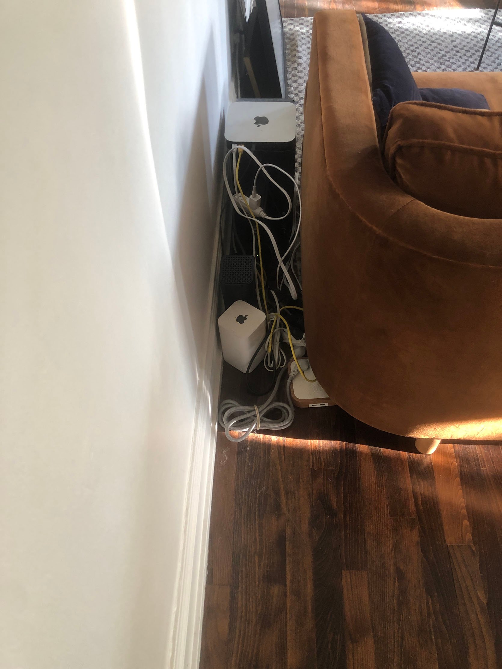 My main reason for the bench was to hide all of these unsightly electronics. I won’t bore you with the whole saga (like me realizing that after the bench was done, I FORGOT to consider that the internet access cable was on the opposite side of the room. Cool, cool, cool.) Don’t worry, there’s a happy ending.