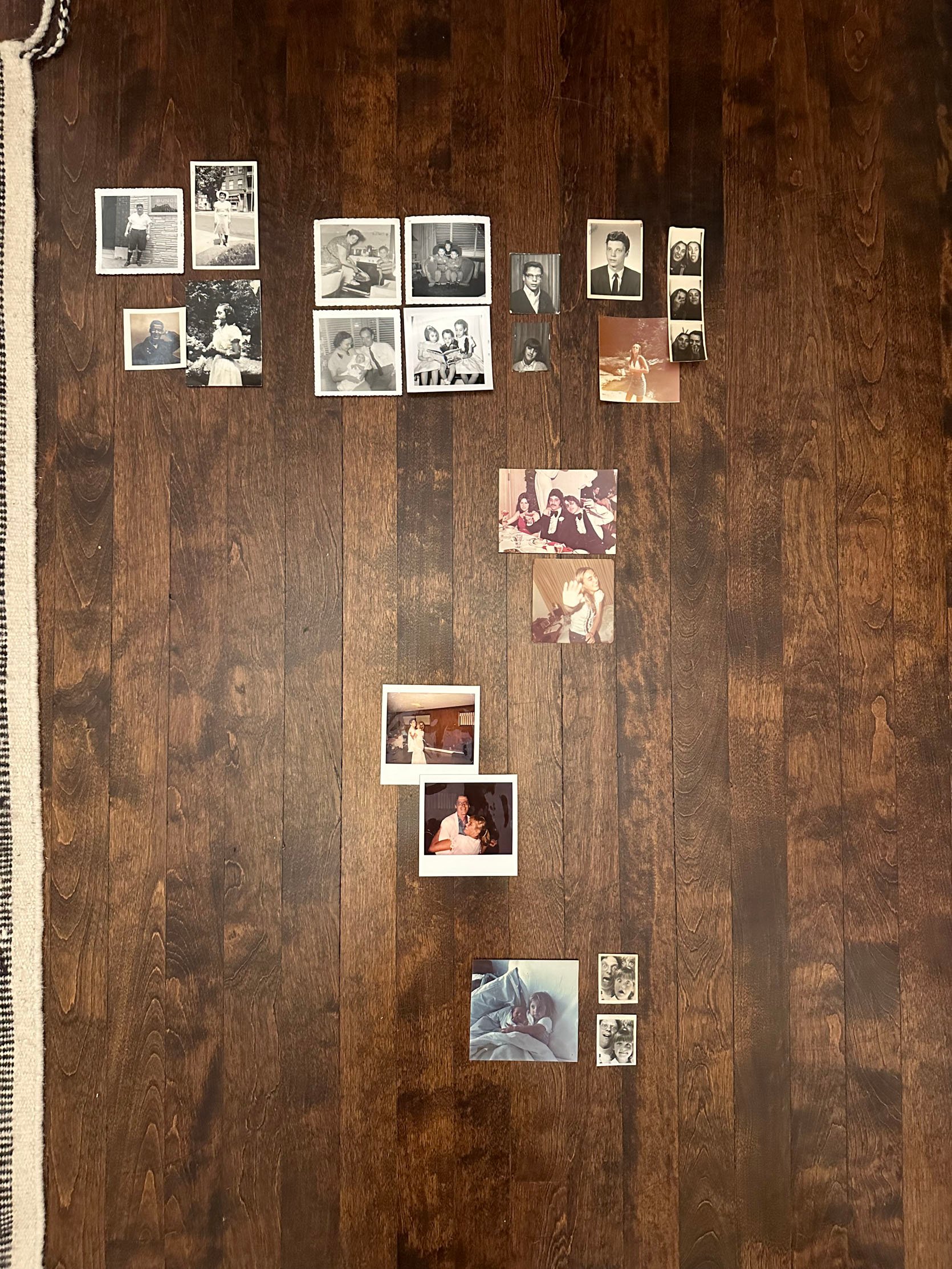 Next, I played with the configuration. For some context, my dad and his family are on the top row, and my mom and her side are under. They act as timelines, first just the grandparents, then photos with their parents, photos with siblings, young school photos, teenage photos, my parents “partying,” their wedding reception party (they eloped to Kauai), then finally my brother and me. I tried to match up the ages as best I could.