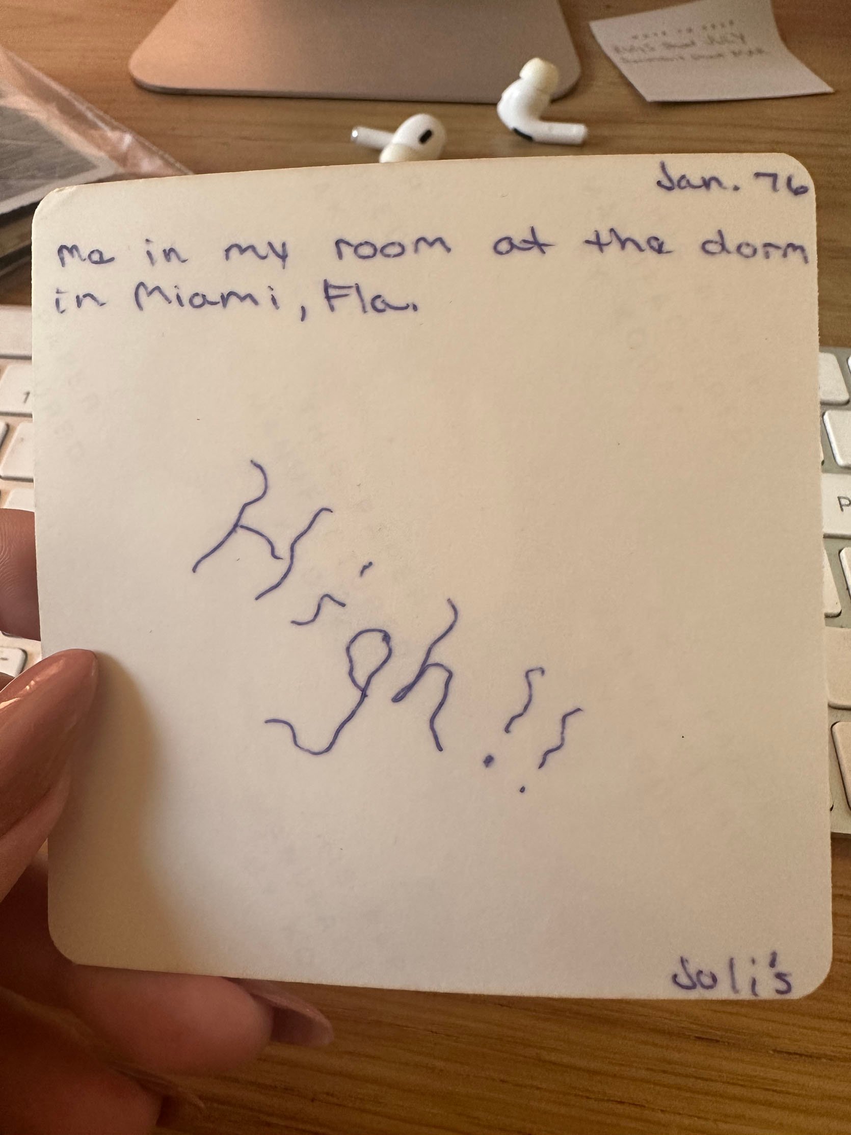 This was on the back of my mom’s “partying” photo, where her hand is up. I love the squiggly lines so much. What a dork:)