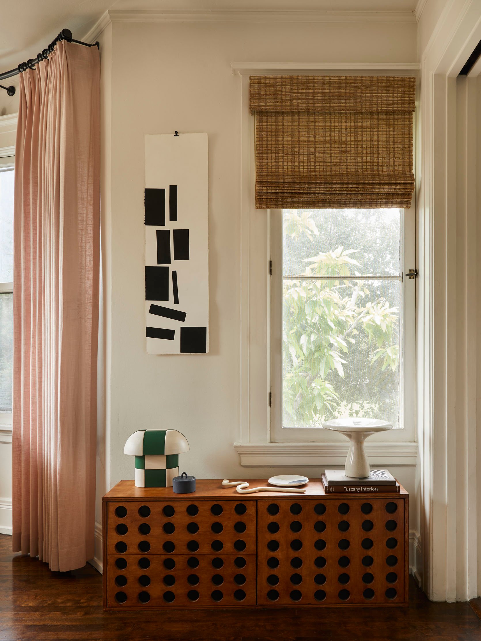 As a self-proclaimed shape lover, this photo nearly makes me emotional. Just kidding. But from the circles of the bench/cabinet, to that utterly perfect checkered lamp of which I don’t think I’ll ever forget receiving as a surprise from Jayson Home. I still can’t believe it’s in my house, and I am so sad that it’s no longer available! Oh, and that piece of art was also from the gallery wall in my last apartment. I love it so much. Lastly, let’s talk about this woven roman shade. It is just so beautiful and adds so much texture and warmth. It is, of course, from Decorview as well. I really have to say that if you are able to afford custom window treatments (and check to see because you may be surprised), they simply provide the absolutely best customer service with the most beautiful products.