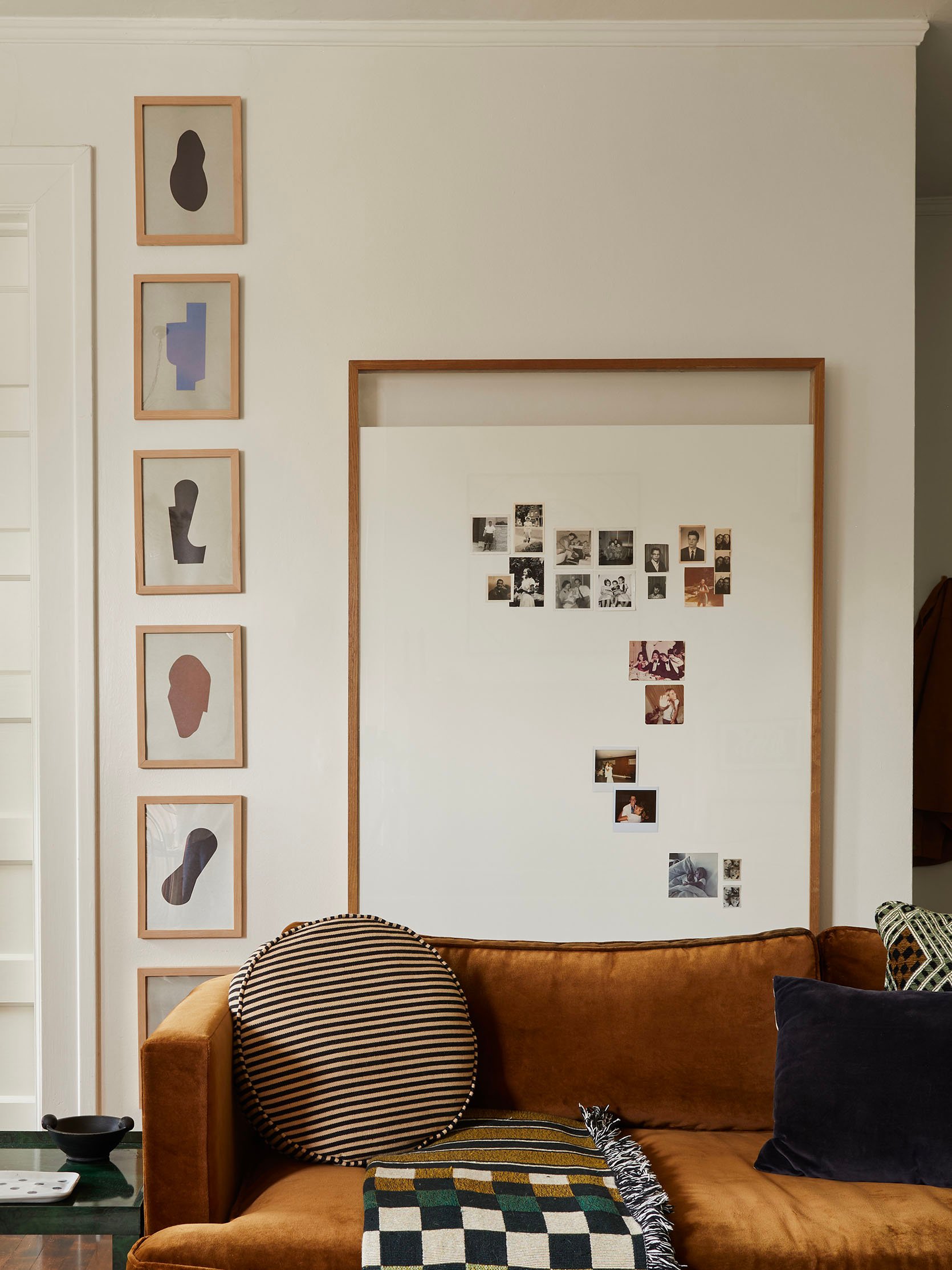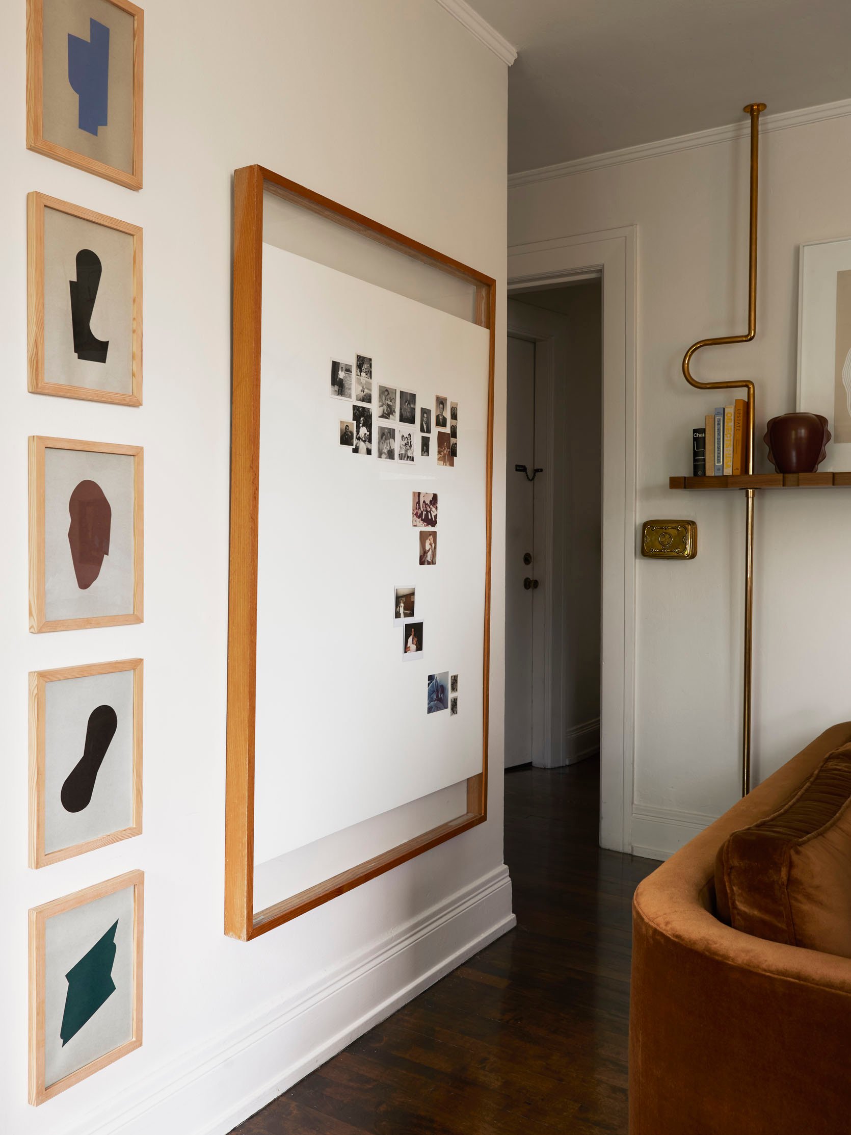 Rust Vase | Neutral Vertical Art | White Frame | Ceramic Art | Black Stash Box Tower (unavailable) | Wood Sculpture (vintage) | Vintage Light Switch (similar) | Painting (unavailable) | The Polaroid Book | Wood Sculpture (vintage) | Checkered Vase (unavailable) | Cream Plate Sculpture | Dark Blue Vase (unavailable)