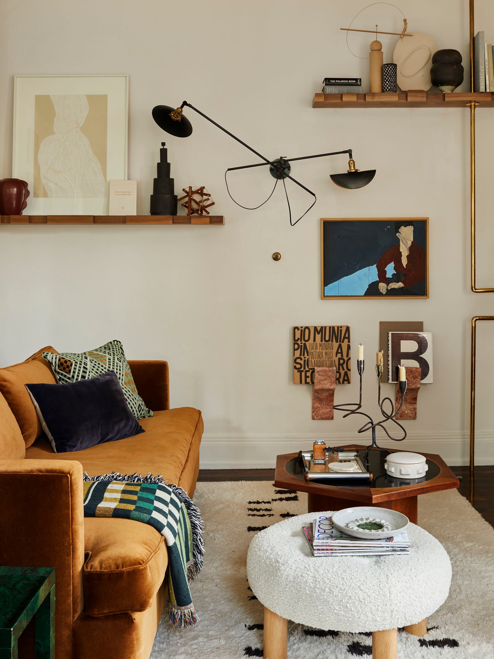 Shelves (custom) | Sconce | Sofa | Rug | Green Side Table (unavailble) | Wood Side Table (vintage)