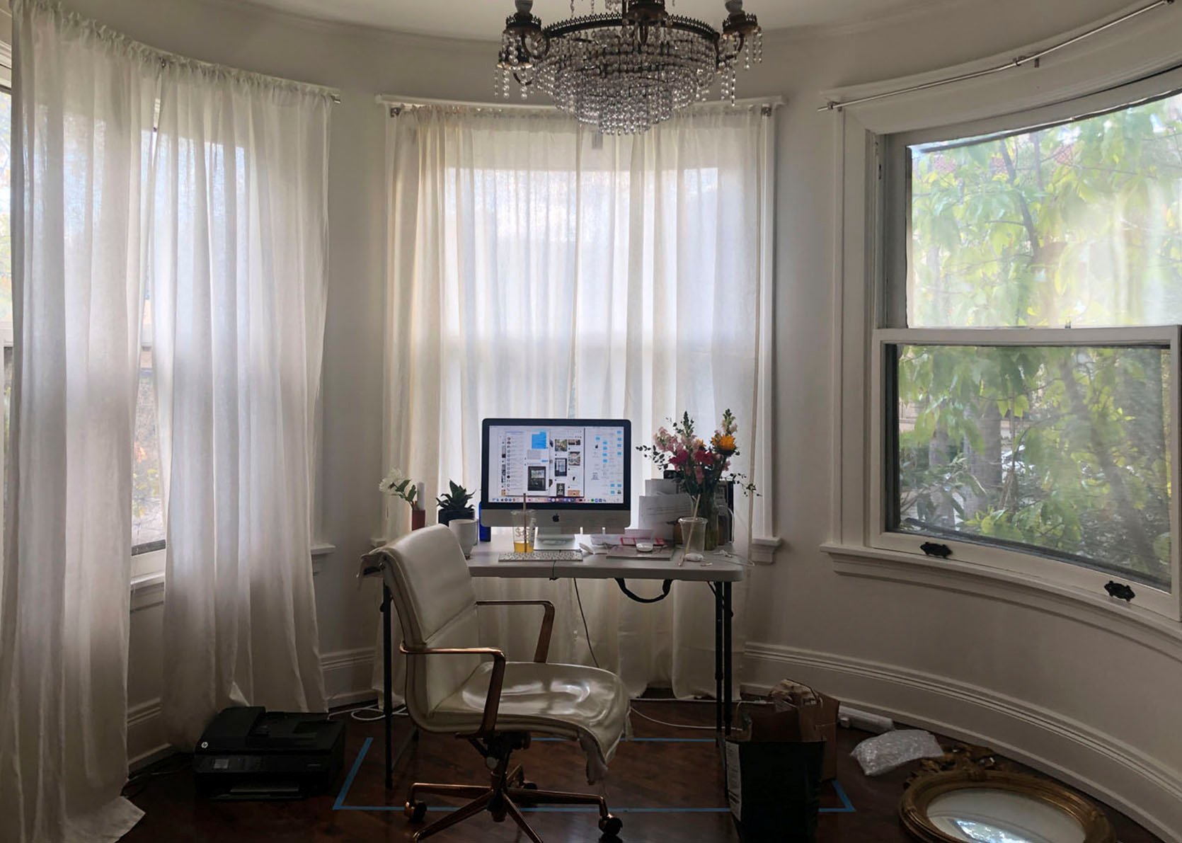Desk (similar) | Chair | Tray | Tape Dispener | Pencil Holder | Lamp (vintge) | Metal Bookend | Little Sculpture | Drapes | Black and White Ceramic Rock