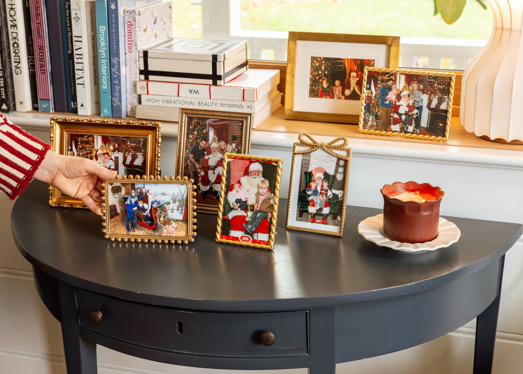 The first few years, I just had these in a box, but once I framed them, I realized how much joy it brought to the kids and me to relive them and pull them out on display. This year, I culled them down (I had a bunch of repeats – the same horizontal and vertical, with us, without us, with grandparents, without grandparents, etc) with just one per kid per year. I also framed them in ready-made gold frames which fit this house better than the simple white ones.