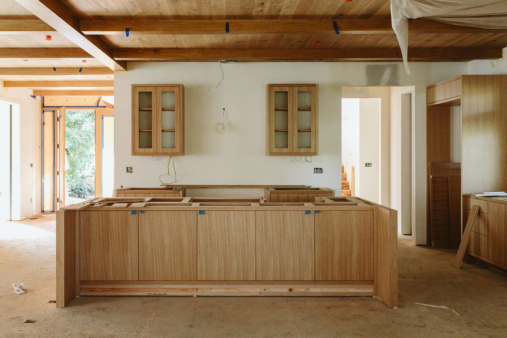 As you can see, we chose unlacquered brass hardware from Rejuvenation, in handles, knobs, latches, and appliance pulls. Once again, their selection and custom options can really make your project look special. We were hoping to reduce contrast here by choosing the brass, but I think black could have looked hot, too. I just love how the brass patinas, even in a contemporary house like this.