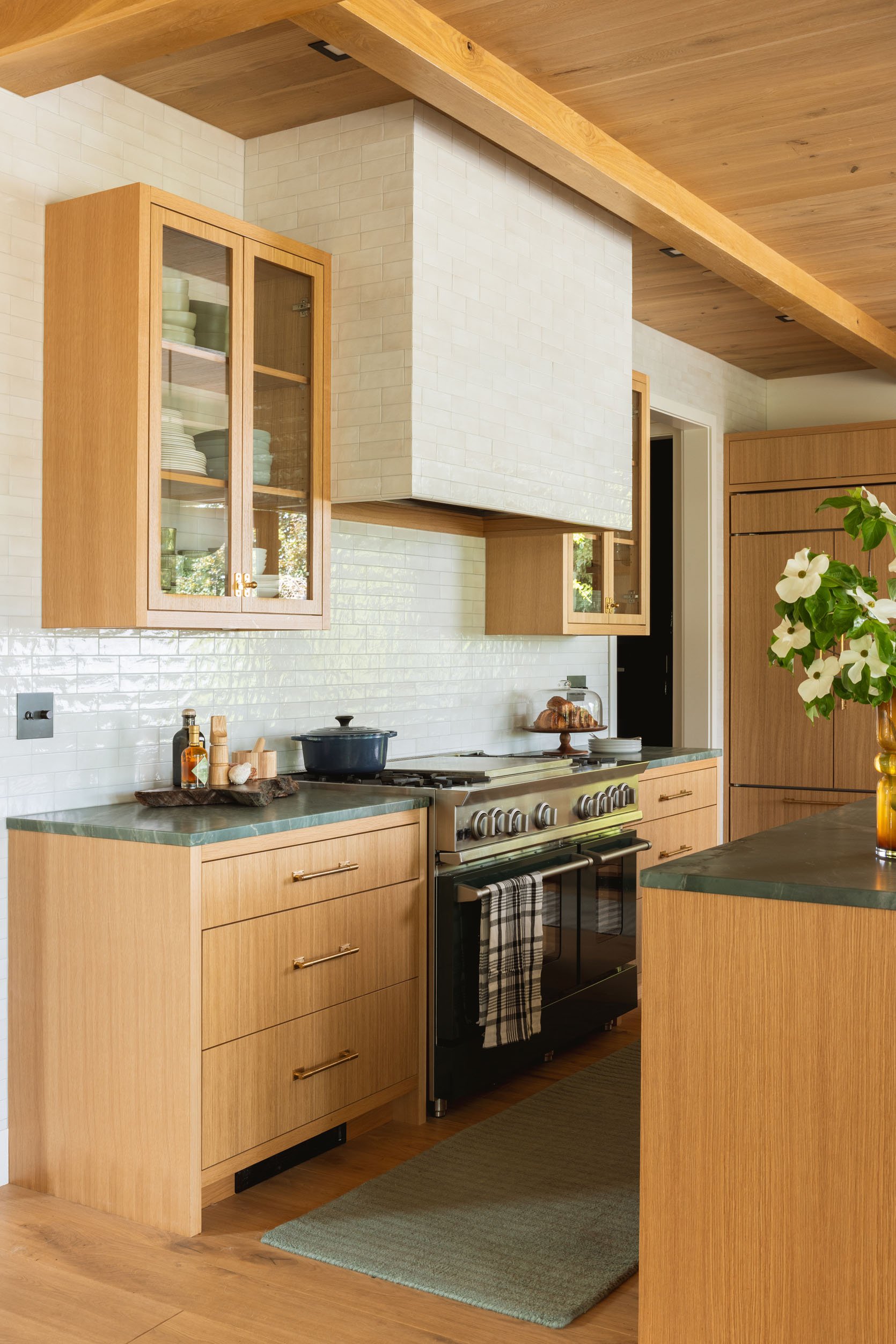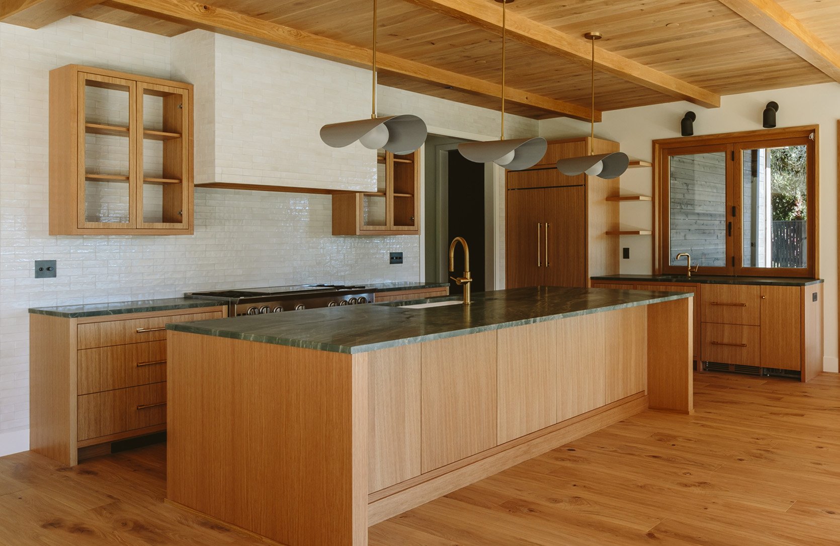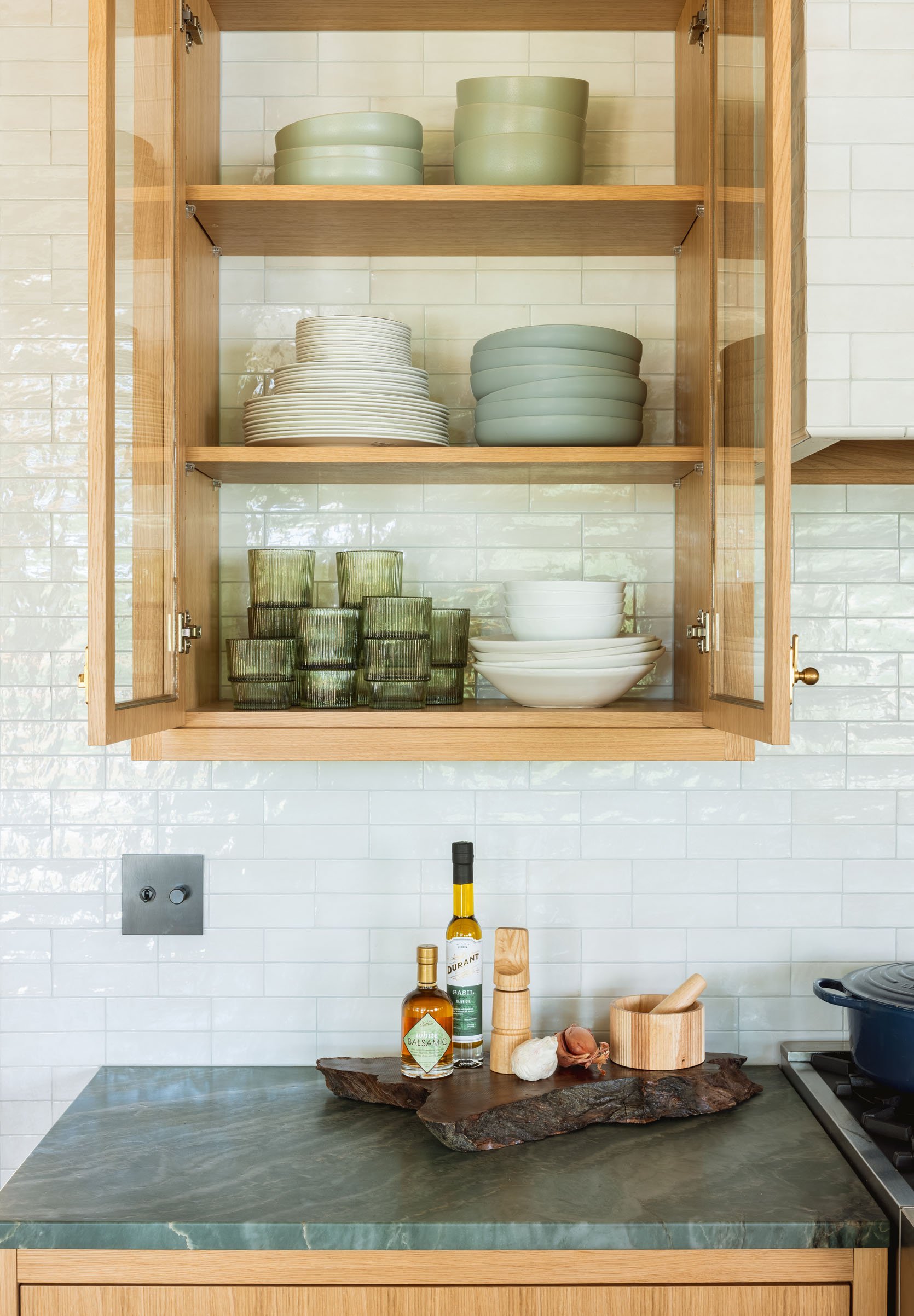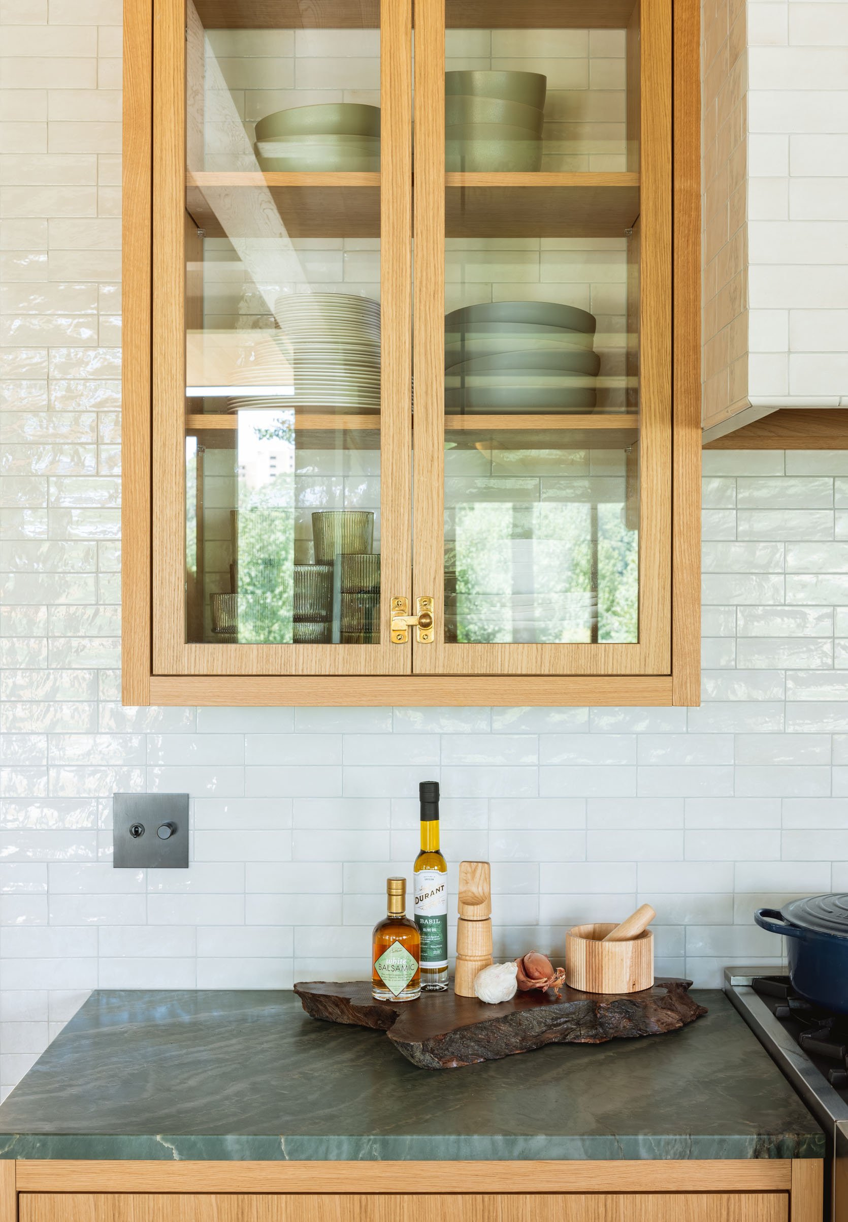I wrote about the process of choosing the stone here, but with the tile being a creamy white and the cabinets being wood, I was desperate to bring in some color and something punchy. We had Caesarstone on board to trade the countertops (which is a super durable choice that Ken and Katie were excited about), but I was just so worried that without color in here, this kitchen would simply put, look boring (and I told them that). So I found this green stone from Elmar, and thankfully, they were on board (nervous, but they trusted me). It felt so perfect since the green of all the trees outside was a huge part of the interior color palette.