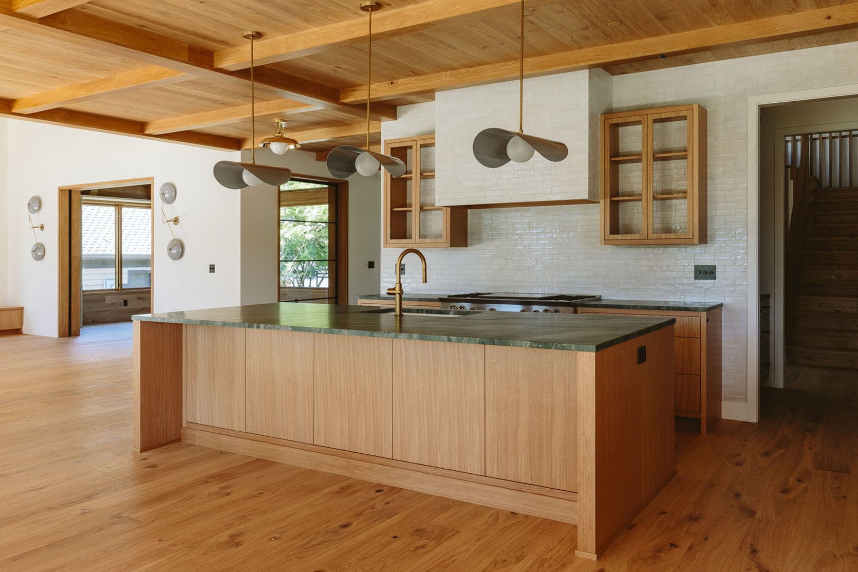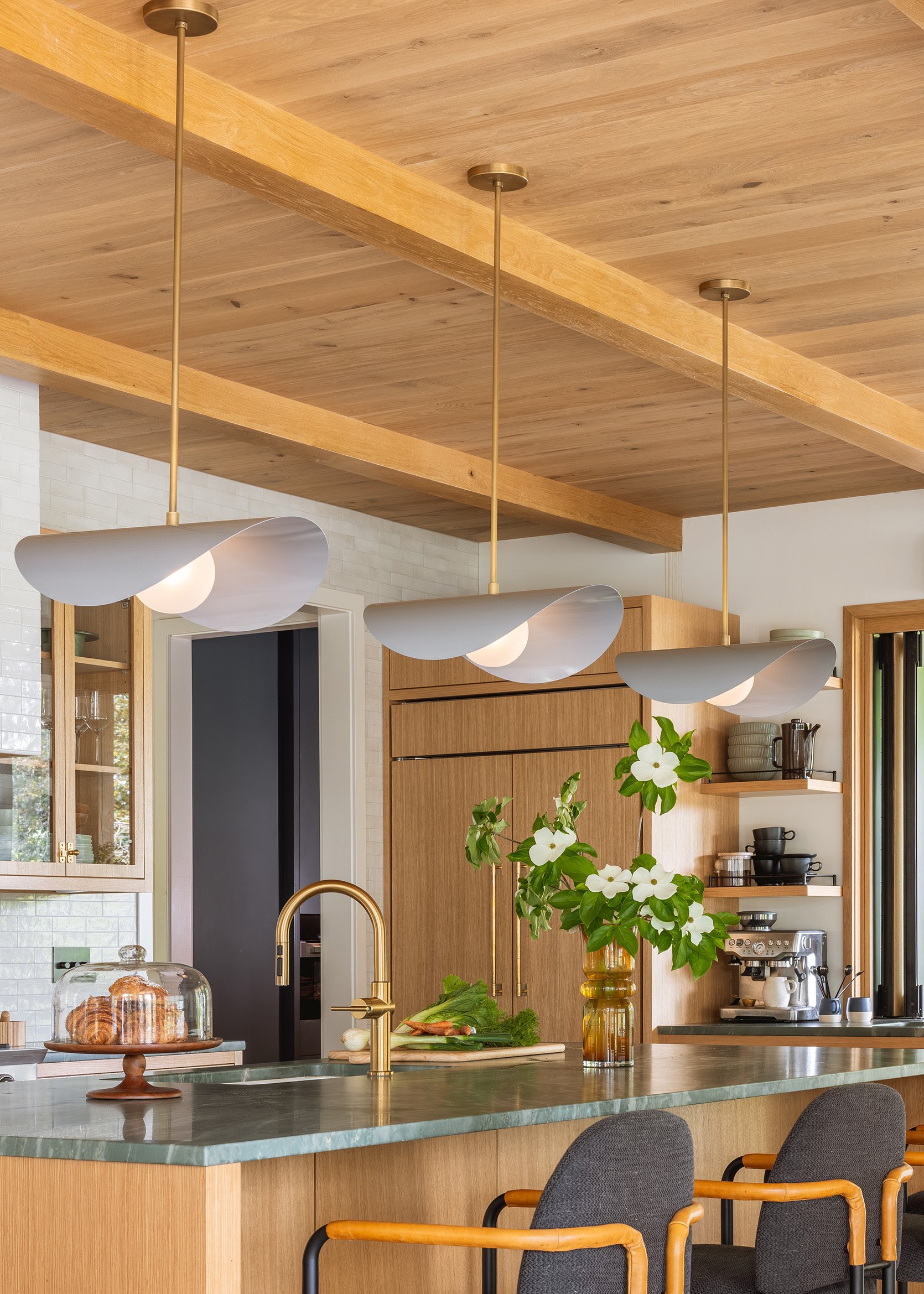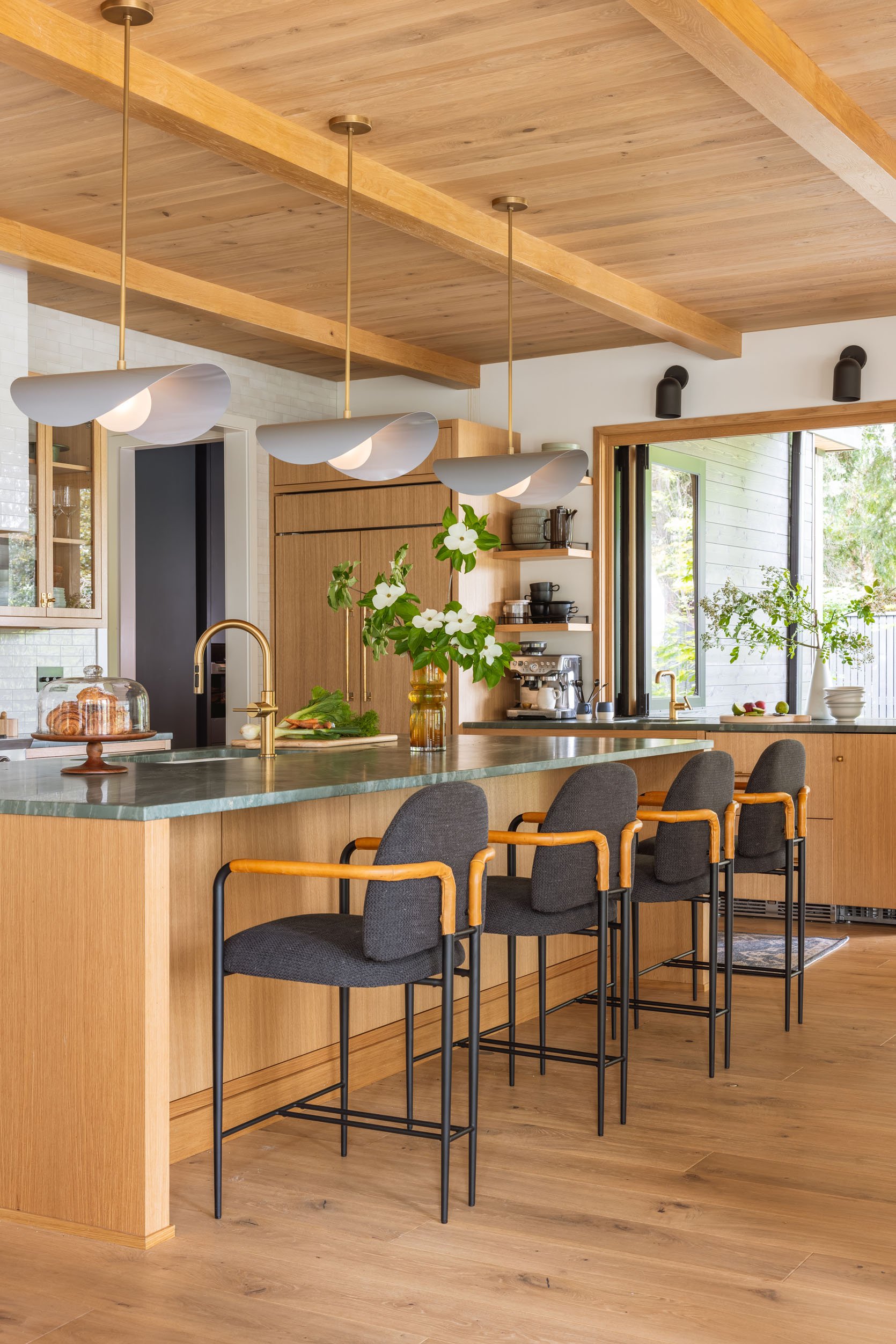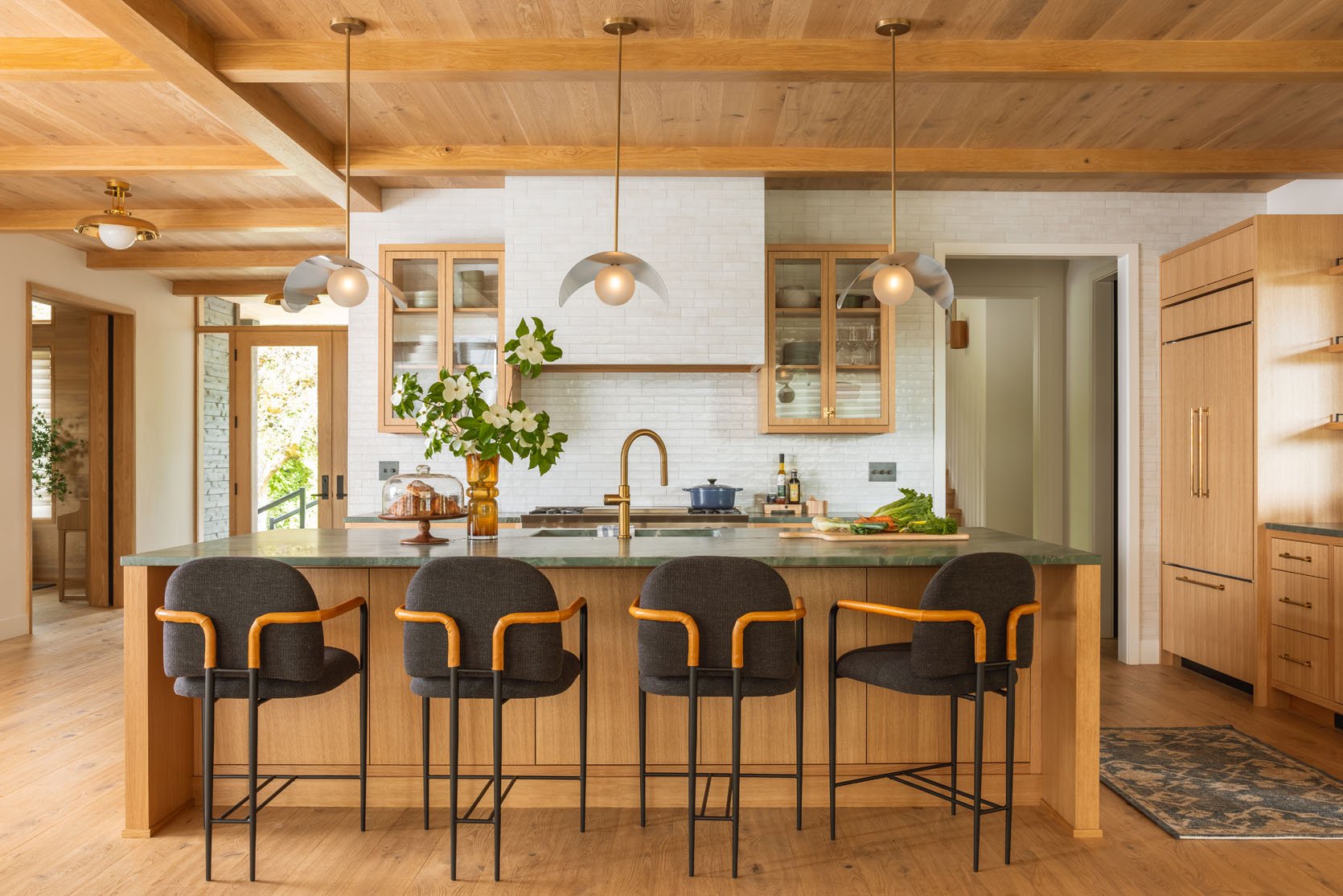 I wrote about the process of choosing the stone here, but with the tile being a creamy white and the cabinets being wood, I was desperate to bring in some color and something punchy. We had Caesarstone on board to trade the countertops (which is a super durable choice that Ken and Katie were excited about), but I was just so worried that without color in here, this kitchen would simply put, look boring (and I told them that). So I found this green stone from Elmar, and thankfully, they were on board (nervous, but they trusted me). It felt so perfect since the green of all the trees outside was a huge part of the interior color palette.