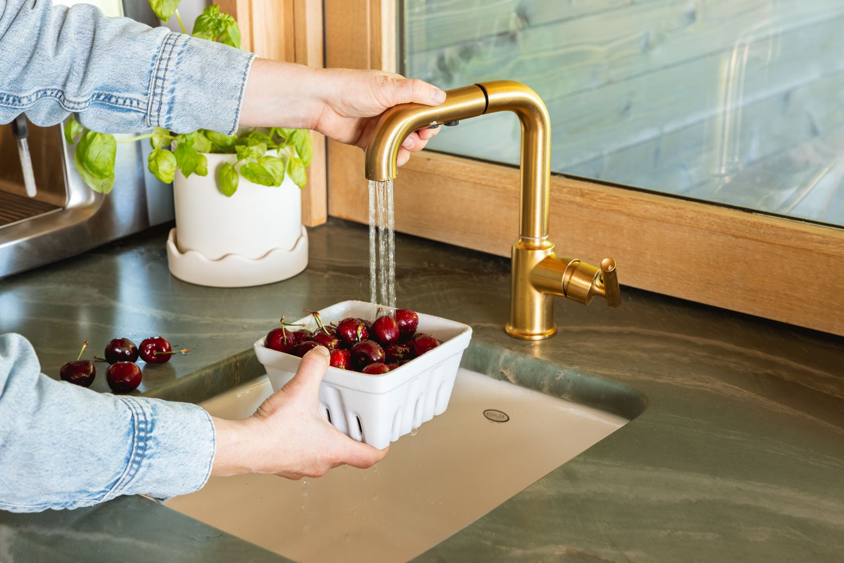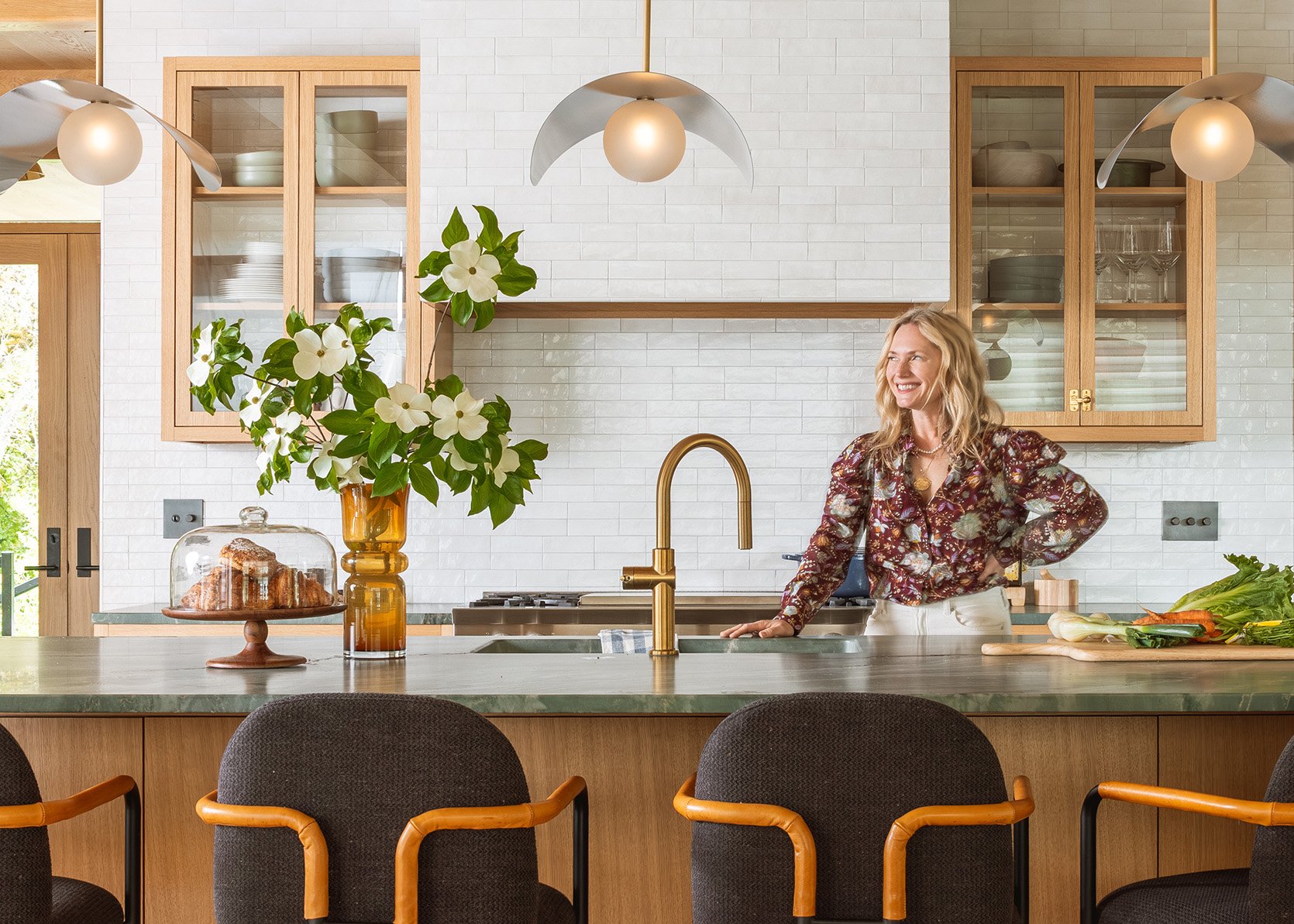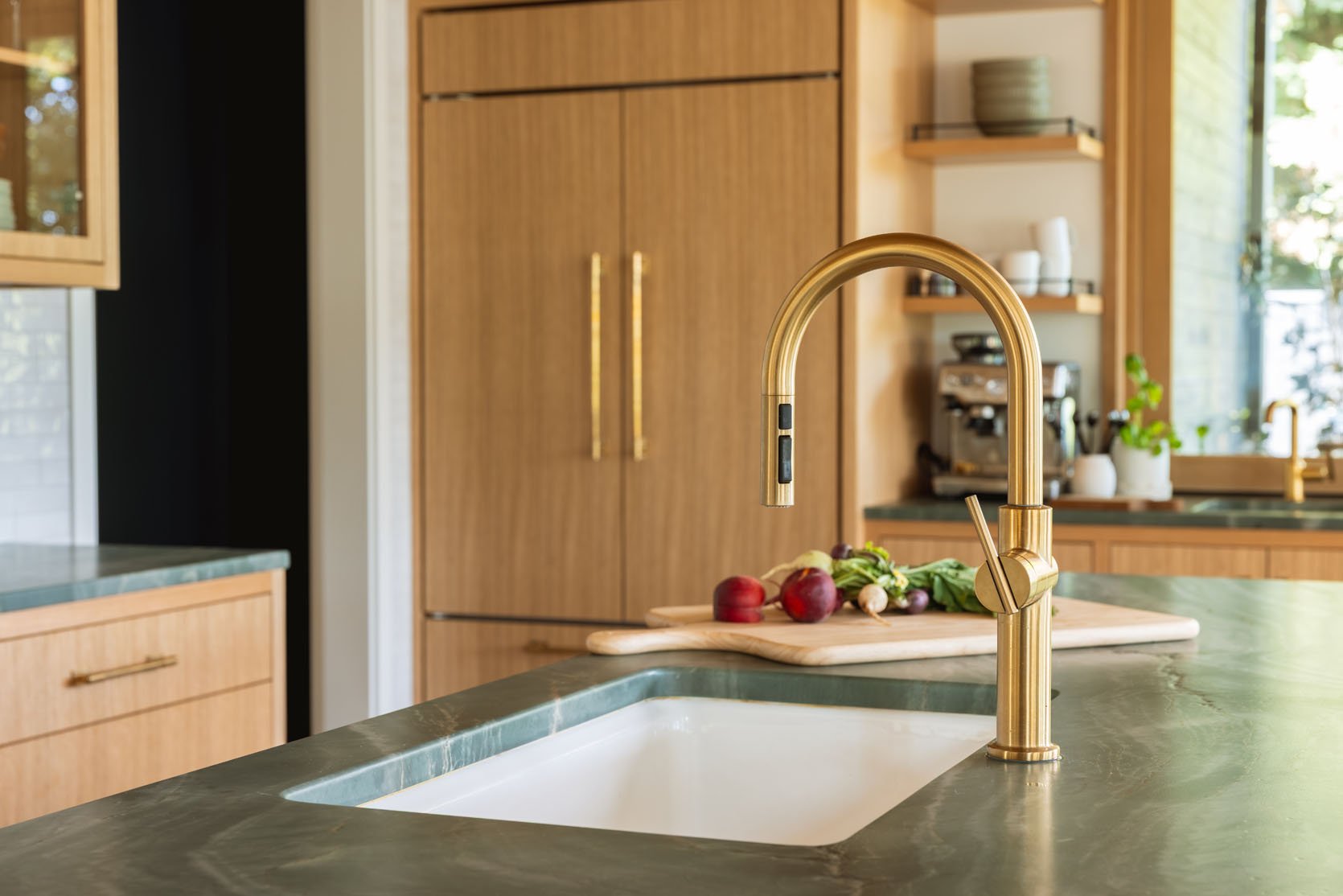 The kitchen faucet is so gorgeous. It’s Kohler, in the same Vibrant Brushed Moderne Brass finish, single-hole pull-down. It can have a regular water flow or a more shower-like spray. It’s a one-and-done faucet for those who want a lot of function in a really simple shape.