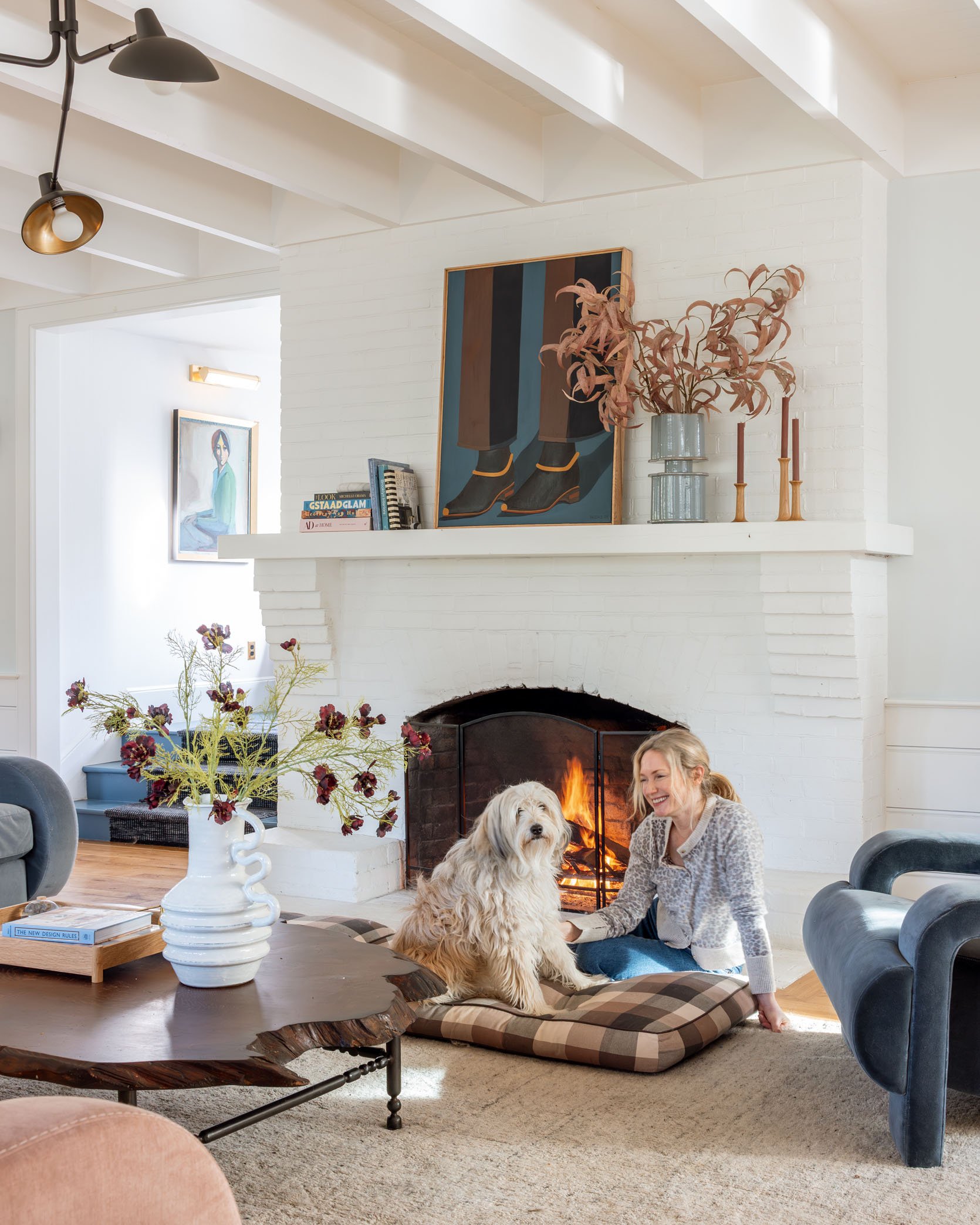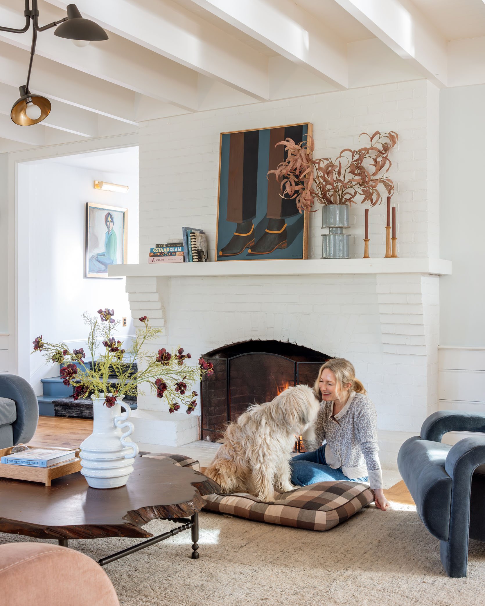 While this fireplace certainly wants a big horizontal piece, once I styled it out, I thought that it looked pretty darn great. It draws your eye, obviously pops off the white, and again, the color palette works perfectly. And a quick update – with all the lighter furniture (the double Barbs – blue and pink), I don’t want to paint the fireplace right now. The whole room (with the initial Scandinavian eclectic intent from years ago) really just flows so nicely and feels so light and airy and happy.