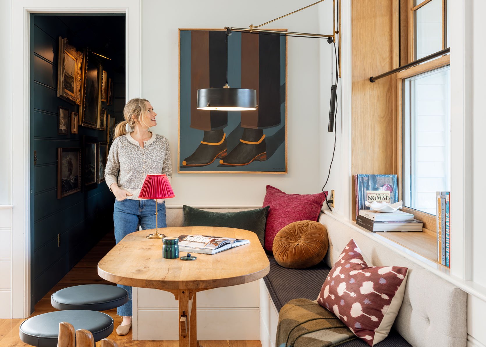 It’s best over the mantel. I really dislike it in the dining nook because that lamp blocks it. There is also a whole lot going on in that dining nook which distracts from this painting. It is also very large, so you want to be able to see it full on from further back, you can’t do that in the stairs. You love it, put it center stage on the mantel. Also I don’t think it needs a picture light, there is plenty of light in there to see it with.