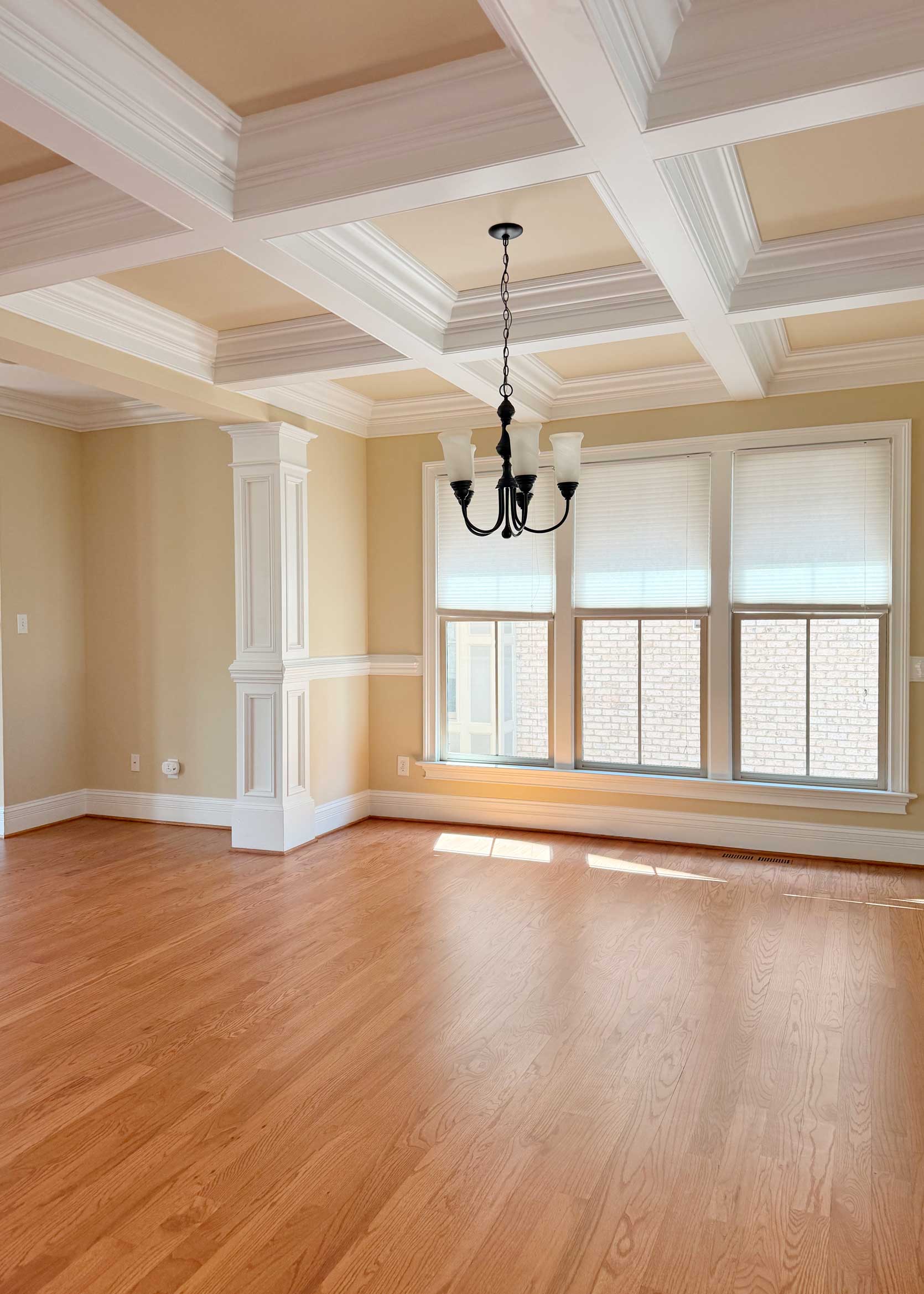 Let’s start in the dining room. While I’ve never had coffered ceilings on my “must have” list, I do really appreciate woodwork, so this was a big, exciting moment for me. It’s all quite traditional, which is a considerable change from our two homes in Los Angeles. I can see our Christmas tree in the corner, and the fireplace flickering during the holidays. The space is LARGE, and I’m excited to get a table with more seats so I can feed more people!