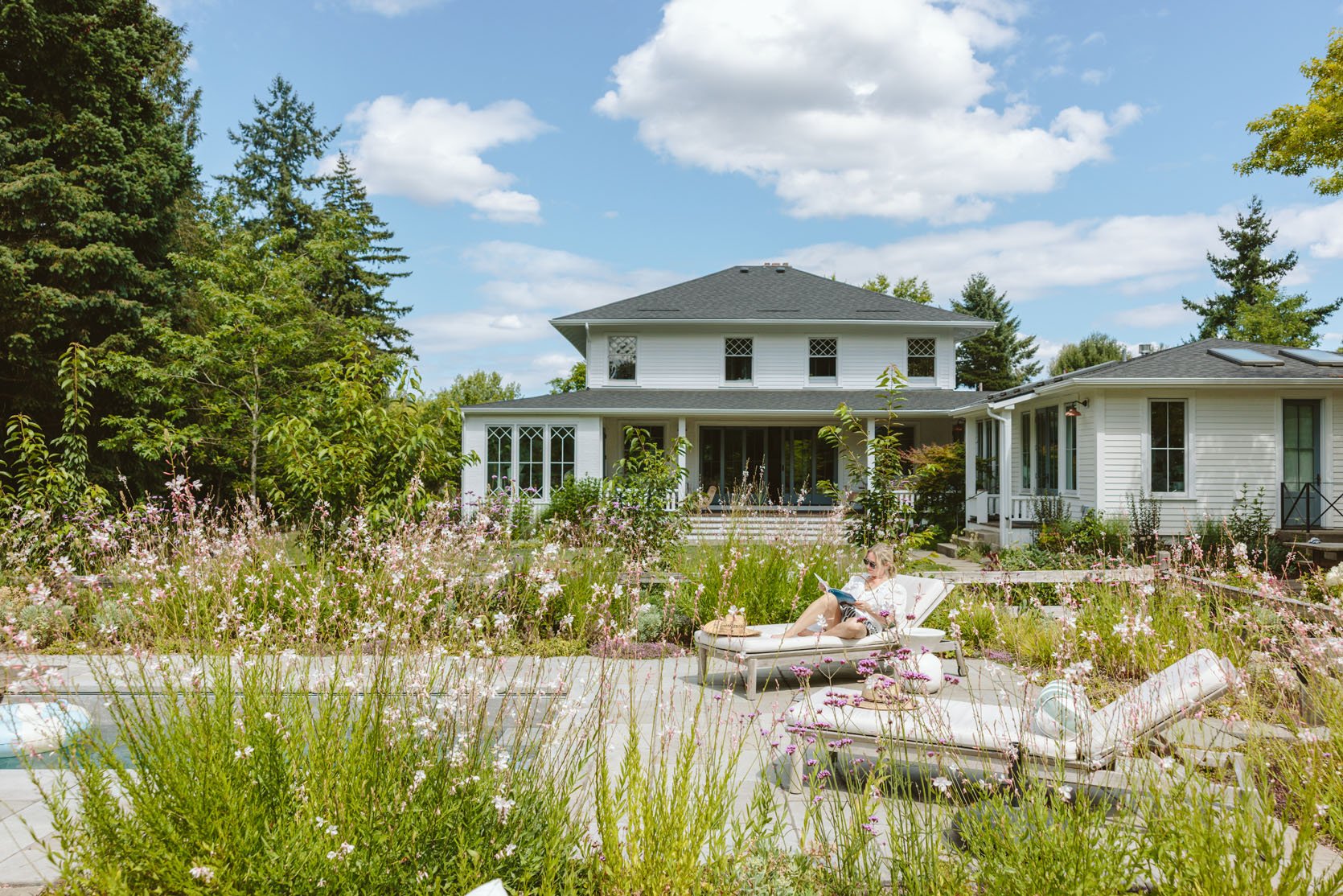 When we did the area around the pool three years ago, I asked Cali for a plant plan that would show the first summer (because we needed to reveal our Soake pool, so we needed instant prettiness), and I LOVE these wildflowers (I forget what they are called). But we always knew that by year 3/4, they would become super tall and potentially messy (which they were last summer). It looks dreamy in this shot, but compared to the rest of the yard, it feels like a different vibe now. And yet in the winter, they are super cut back.