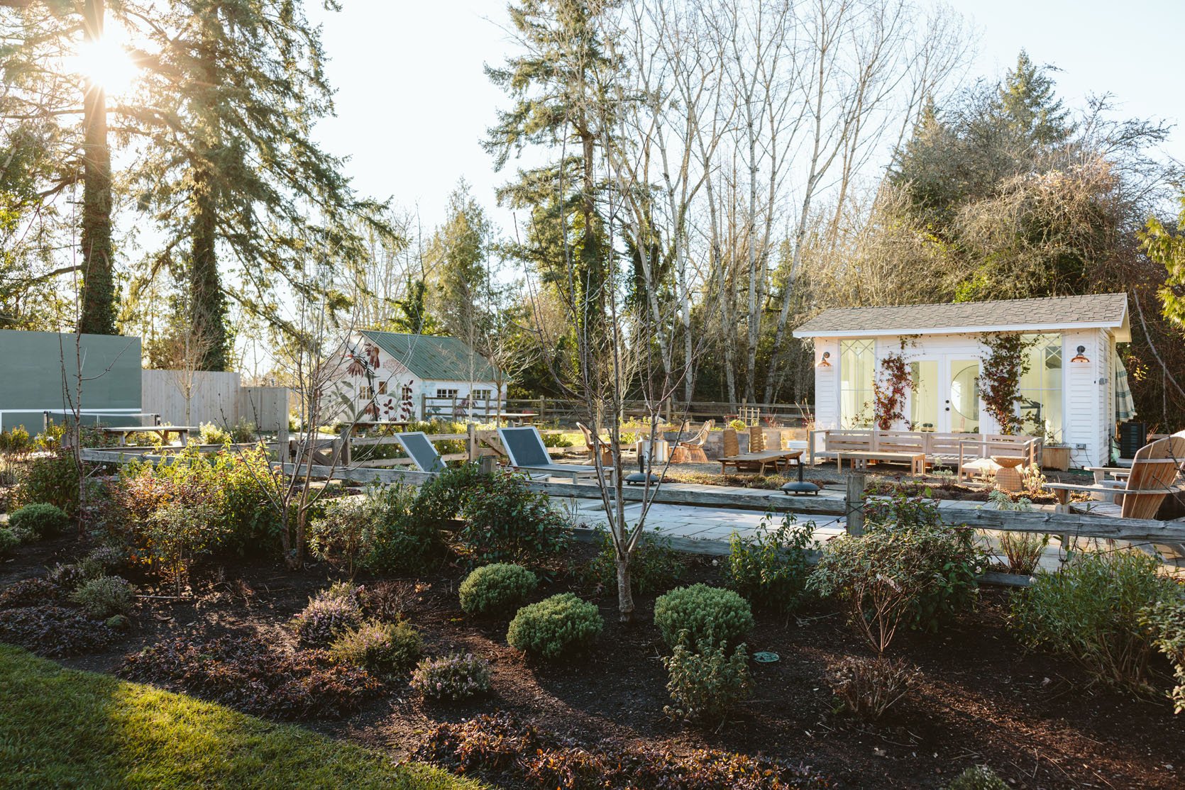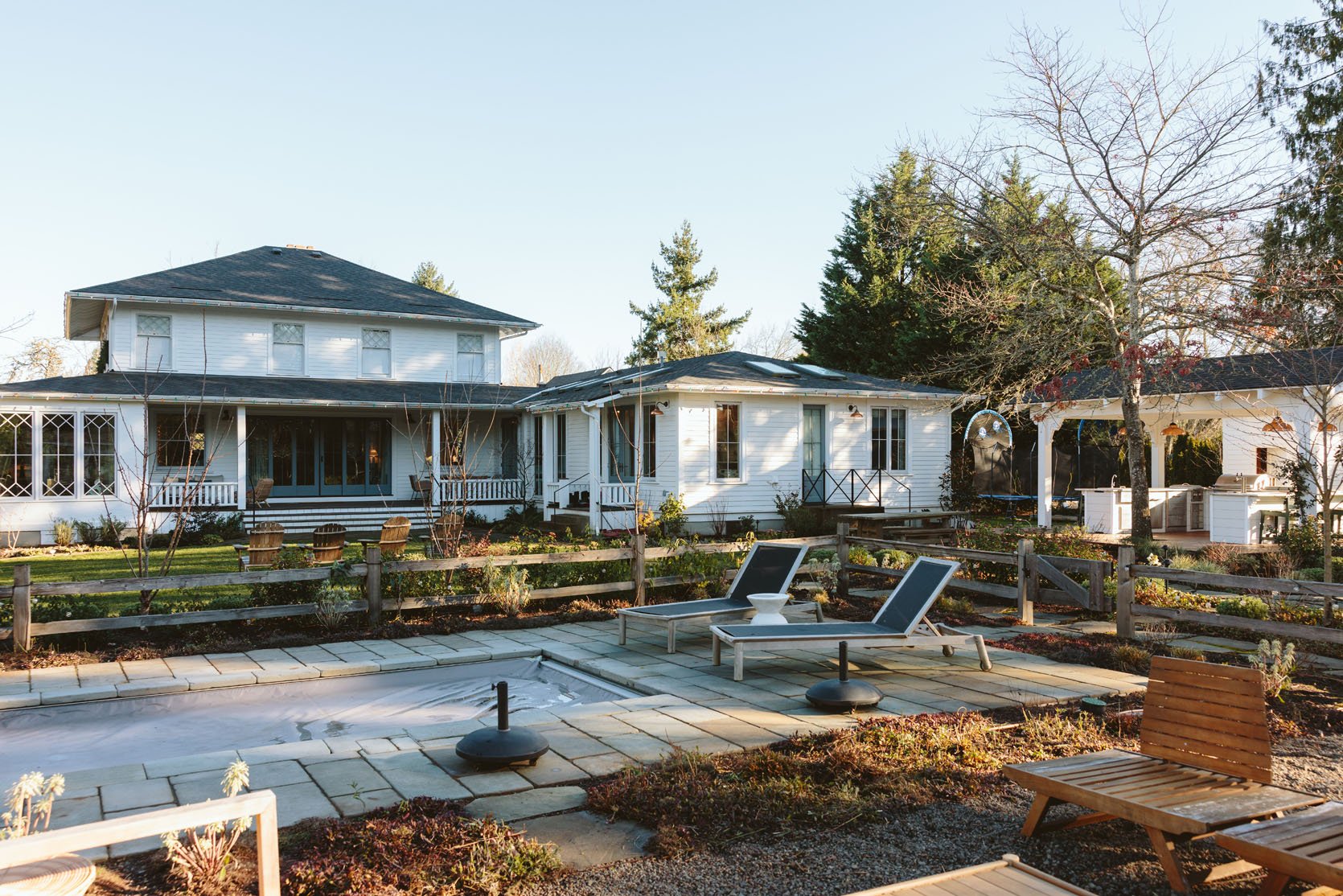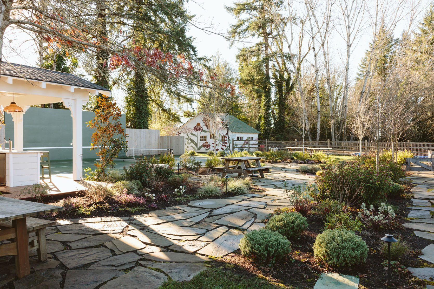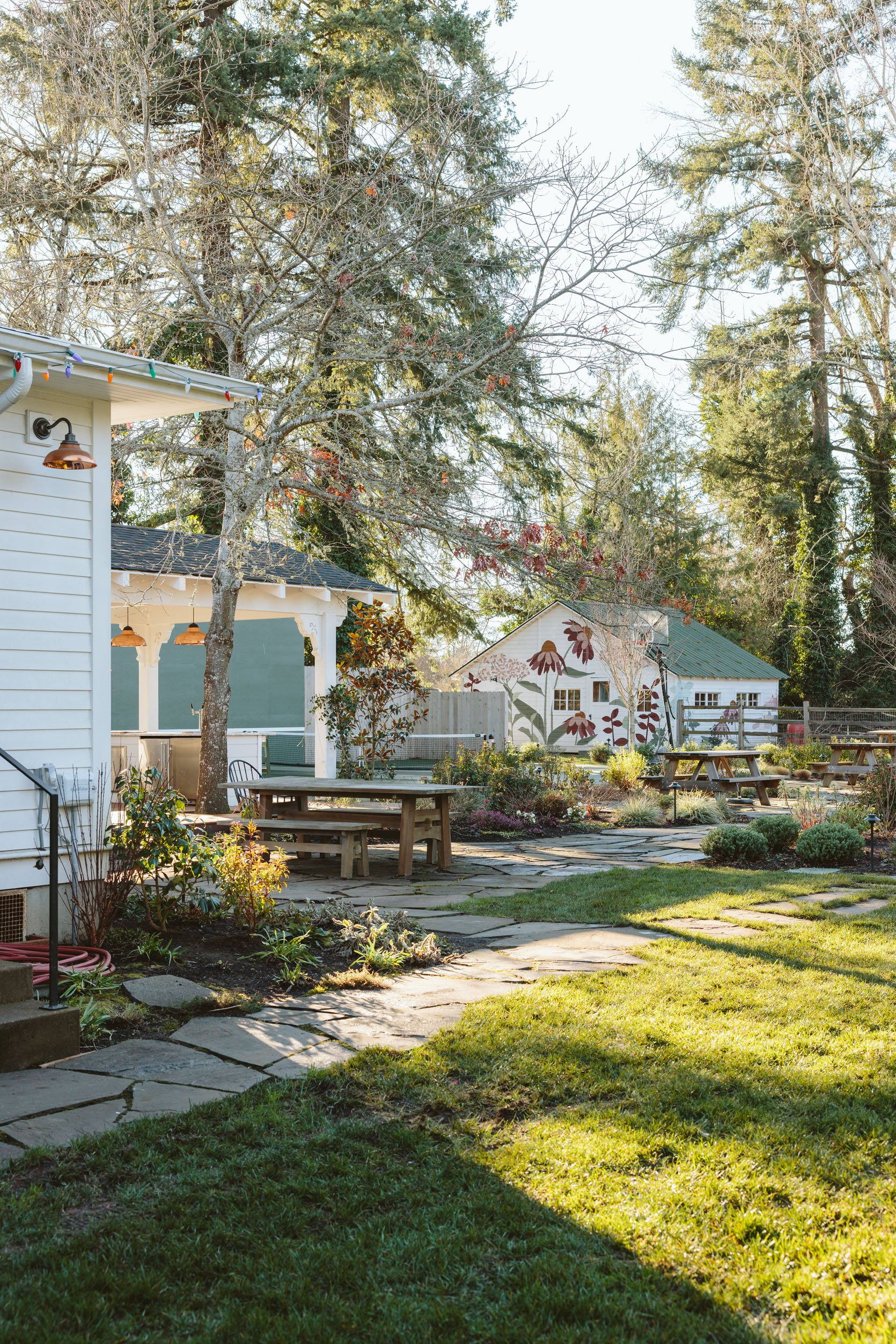 I think you’d agree that we don’t get to see enough of the non-perfectly beautiful but super important stuff on the internet that helps inform our design decisions. I had no idea how important having evergreens would be until we lived here through a couple of winters. It’s so gray, wet, and dark in the winter, and if you only have perennials (the showiest flowers, the pretty wildflowers, and generally more my vibe), then the winter looks even sadder. So when Dennis’ 7 Dees reconfigured the sports court and thus added a bunch of landscaping last year, a huge part of the brief was “green, something pretty, year-round”. I was willing to sacrifice and lose some of my favorite varietals for year-round interest. Not like fir trees and boxwood everywhere necessarily, but enough plants that left us with happy visual interest and not just cut-back grasses or lamb’s ears all winter. They agreed, and I trusted them, but it wasn’t until January that I could really see what it would look like, and boy, was I relieved to see that it is indeed so pretty. Now, is it as pretty of a photo tour as summer? Nope. And we didn’t style it at all (or even move our dumb umbrella stands). But I hope it can help you make some decisions, or at least feel seen that you aren’t the only one with a maybe less beautiful yard during the darker months.
