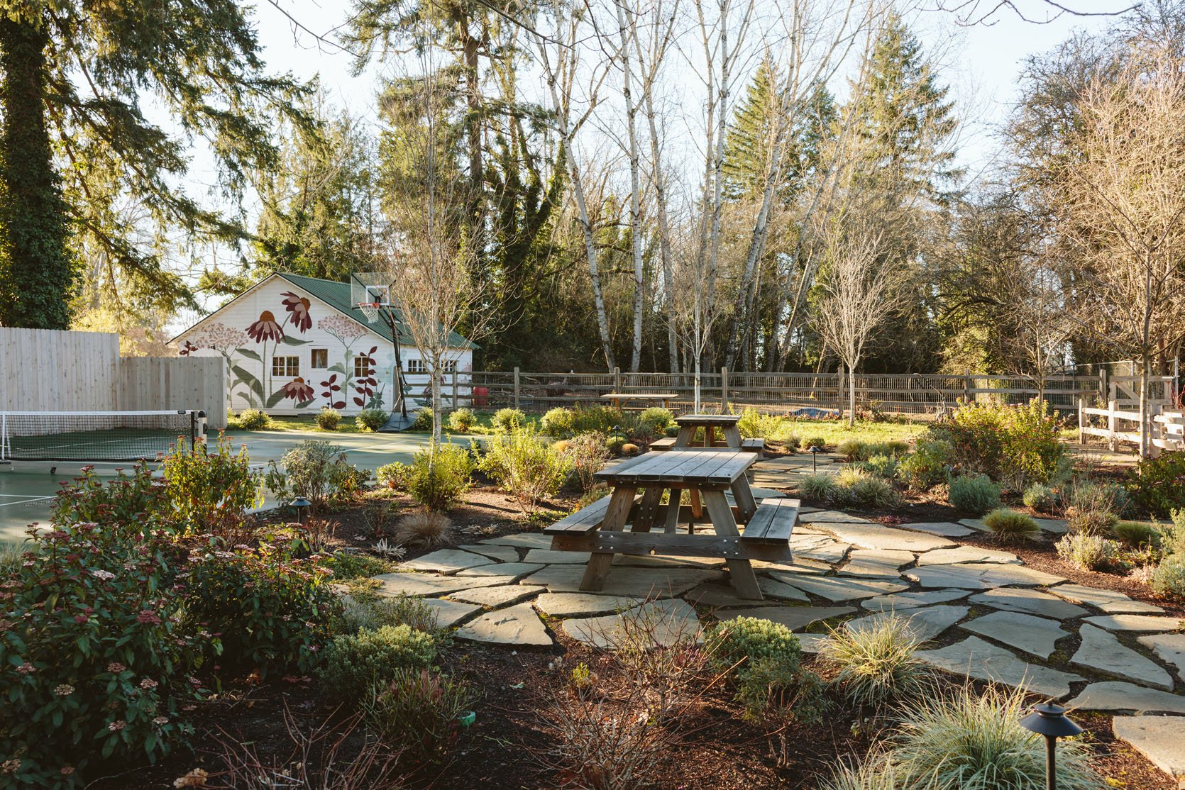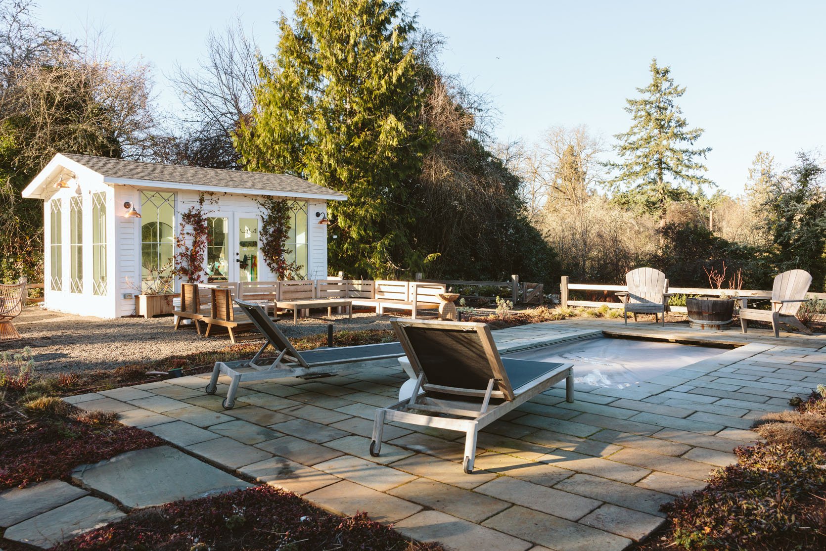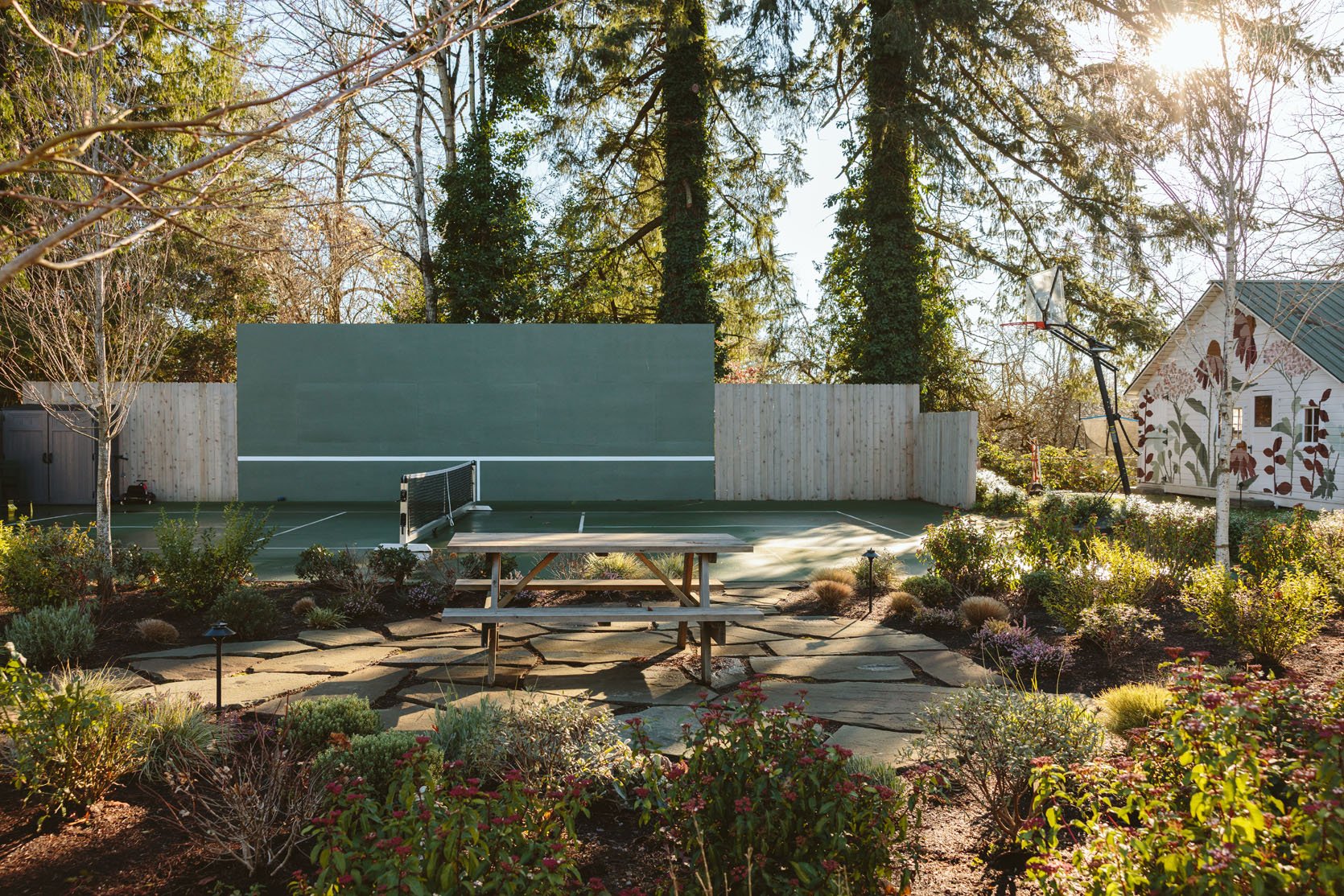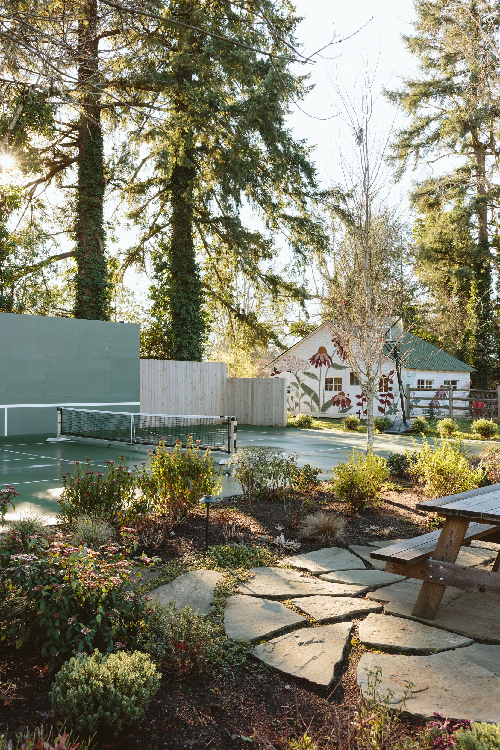 I think you’d agree that we don’t get to see enough of the non-perfectly beautiful but super important stuff on the internet that helps inform our design decisions. I had no idea how important having evergreens would be until we lived here through a couple of winters. It’s so gray, wet, and dark in the winter, and if you only have perennials (the showiest flowers, the pretty wildflowers, and generally more my vibe), then the winter looks even sadder. So when Dennis’ 7 Dees reconfigured the sports court and thus added a bunch of landscaping last year, a huge part of the brief was “green, something pretty, year-round”. I was willing to sacrifice and lose some of my favorite varietals for year-round interest. Not like fir trees and boxwood everywhere necessarily, but enough plants that left us with happy visual interest and not just cut-back grasses or lamb’s ears all winter. They agreed, and I trusted them, but it wasn’t until January that I could really see what it would look like, and boy, was I relieved to see that it is indeed so pretty. Now, is it as pretty of a photo tour as summer? Nope. And we didn’t style it at all (or even move our dumb umbrella stands). But I hope it can help you make some decisions, or at least feel seen that you aren’t the only one with a maybe less beautiful yard during the darker months.