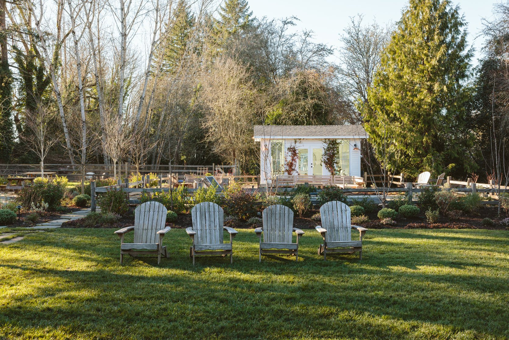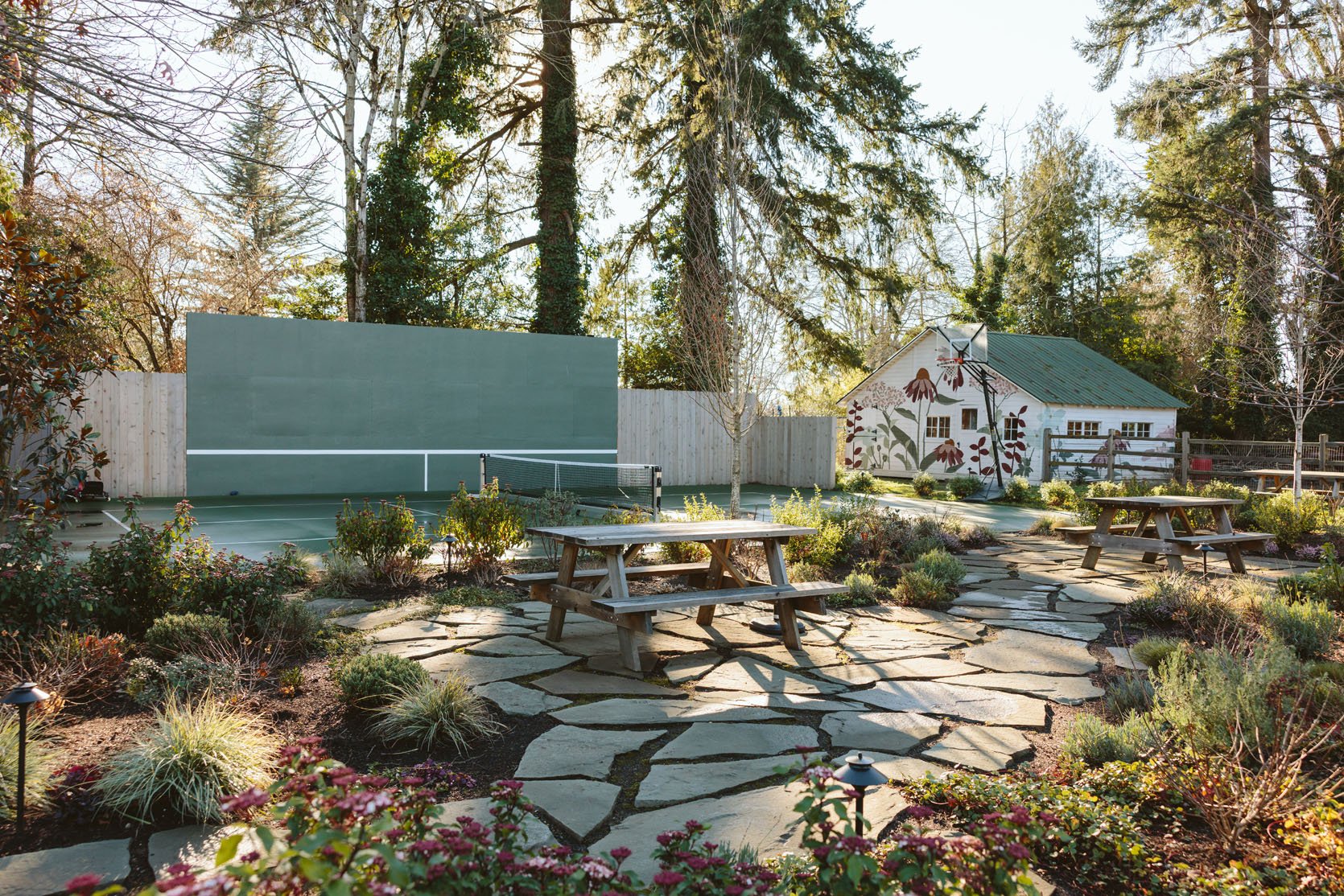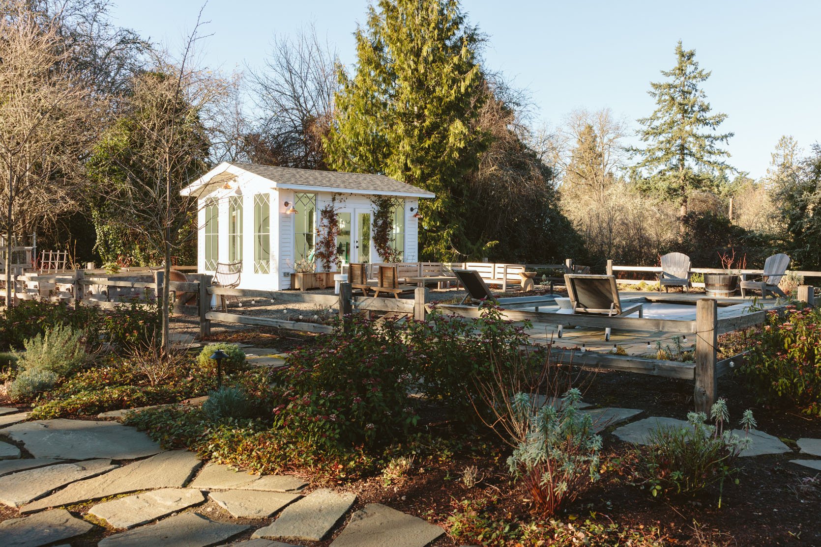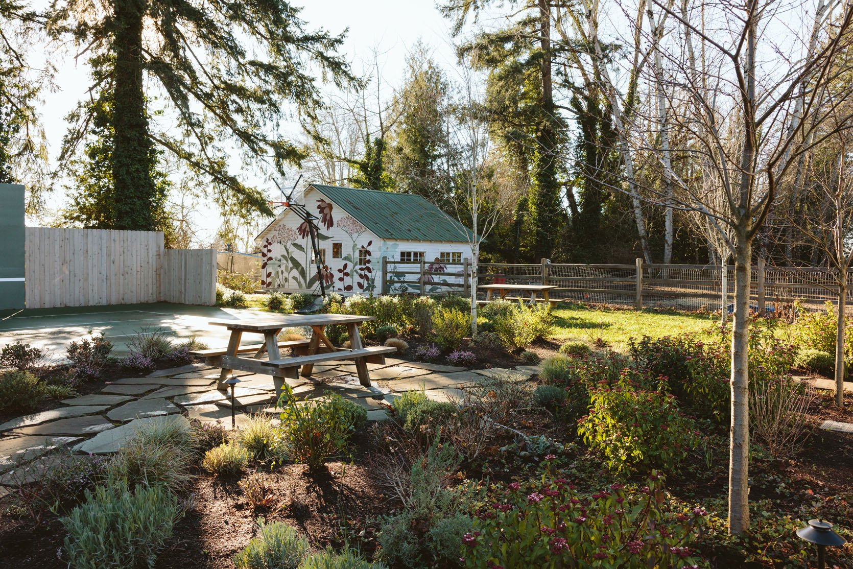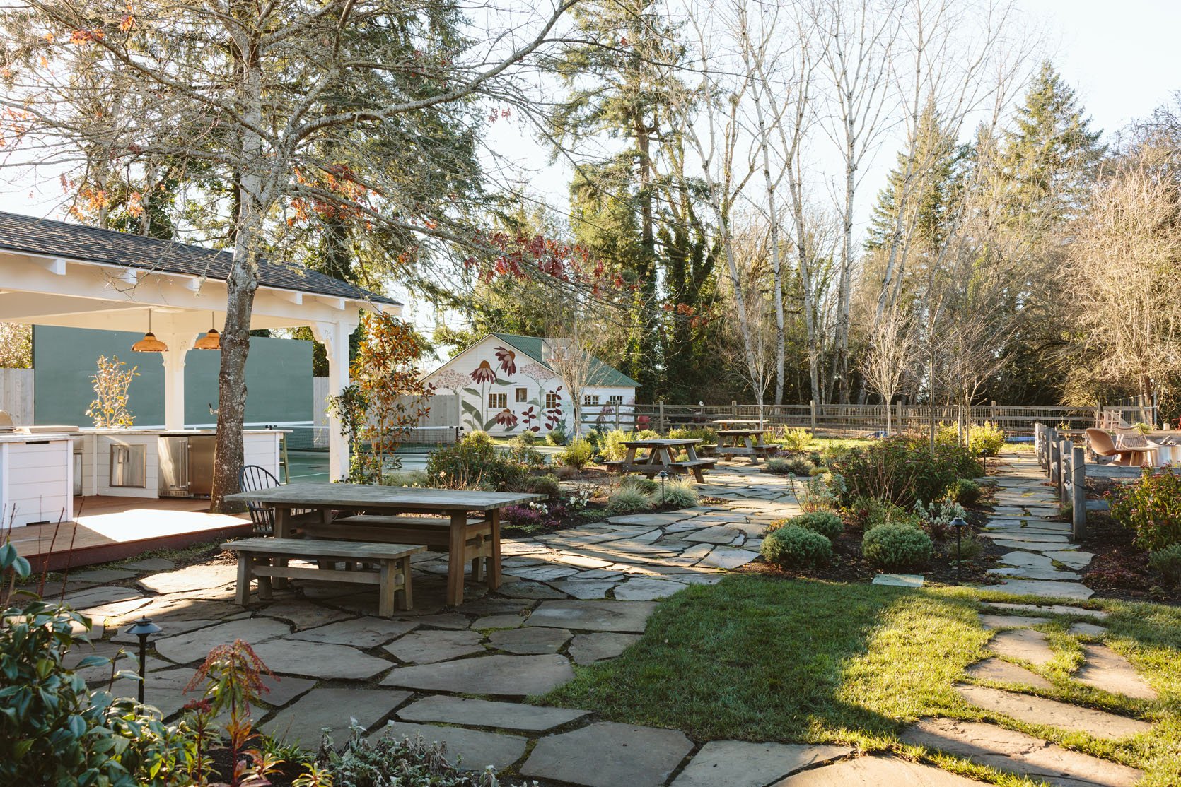 I think you’d agree that we don’t get to see enough of the non-perfectly beautiful but super important stuff on the internet that helps inform our design decisions. I had no idea how important having evergreens would be until we lived here through a couple of winters. It’s so gray, wet, and dark in the winter, and if you only have perennials (the showiest flowers, the pretty wildflowers, and generally more my vibe), then the winter looks even sadder. So when Dennis’ 7 Dees reconfigured the sports court and thus added a bunch of landscaping last year, a huge part of the brief was “green, something pretty, year-round”. I was willing to sacrifice and lose some of my favorite varietals for year-round interest. Not like fir trees and boxwood everywhere necessarily, but enough plants that left us with happy visual interest and not just cut-back grasses or lamb’s ears all winter. They agreed, and I trusted them, but it wasn’t until January that I could really see what it would look like, and boy, was I relieved to see that it is indeed so pretty. Now, is it as pretty of a photo tour as summer? Nope. And we didn’t style it at all (or even move our dumb umbrella stands). But I hope it can help you make some decisions, or at least feel seen that you aren’t the only one with a maybe less beautiful yard during the darker months.