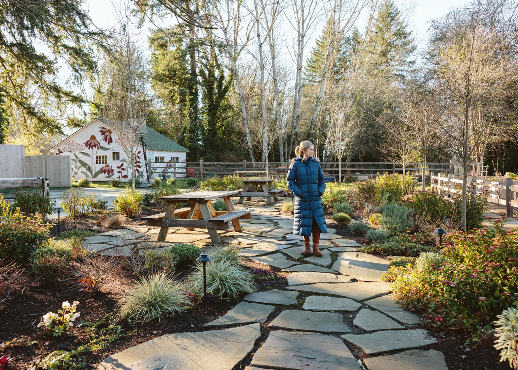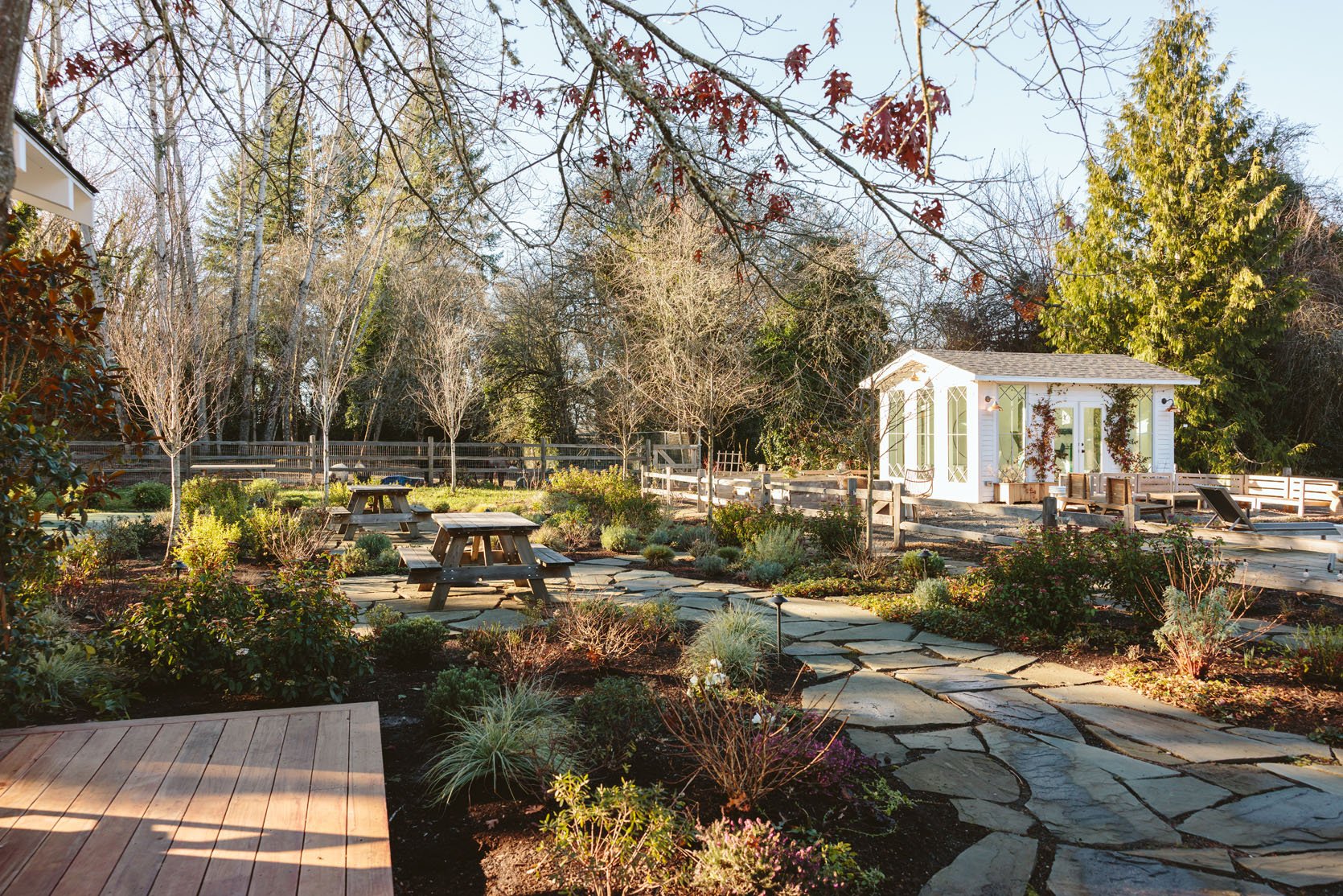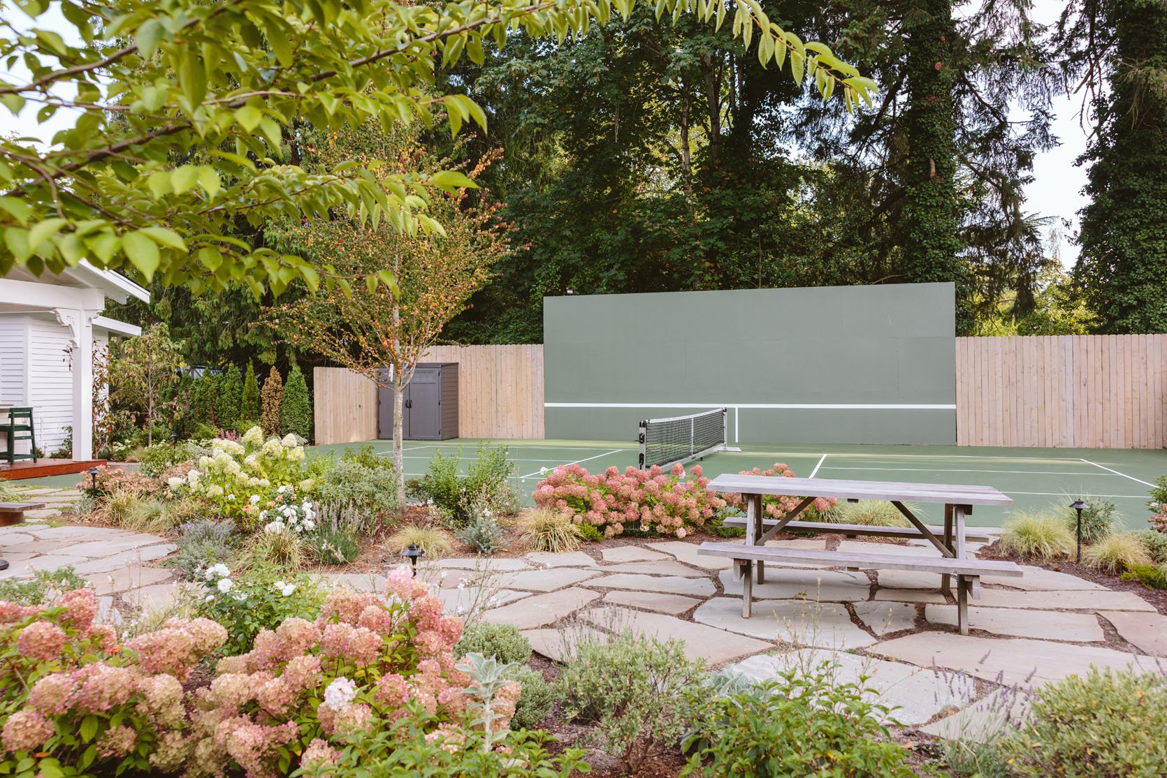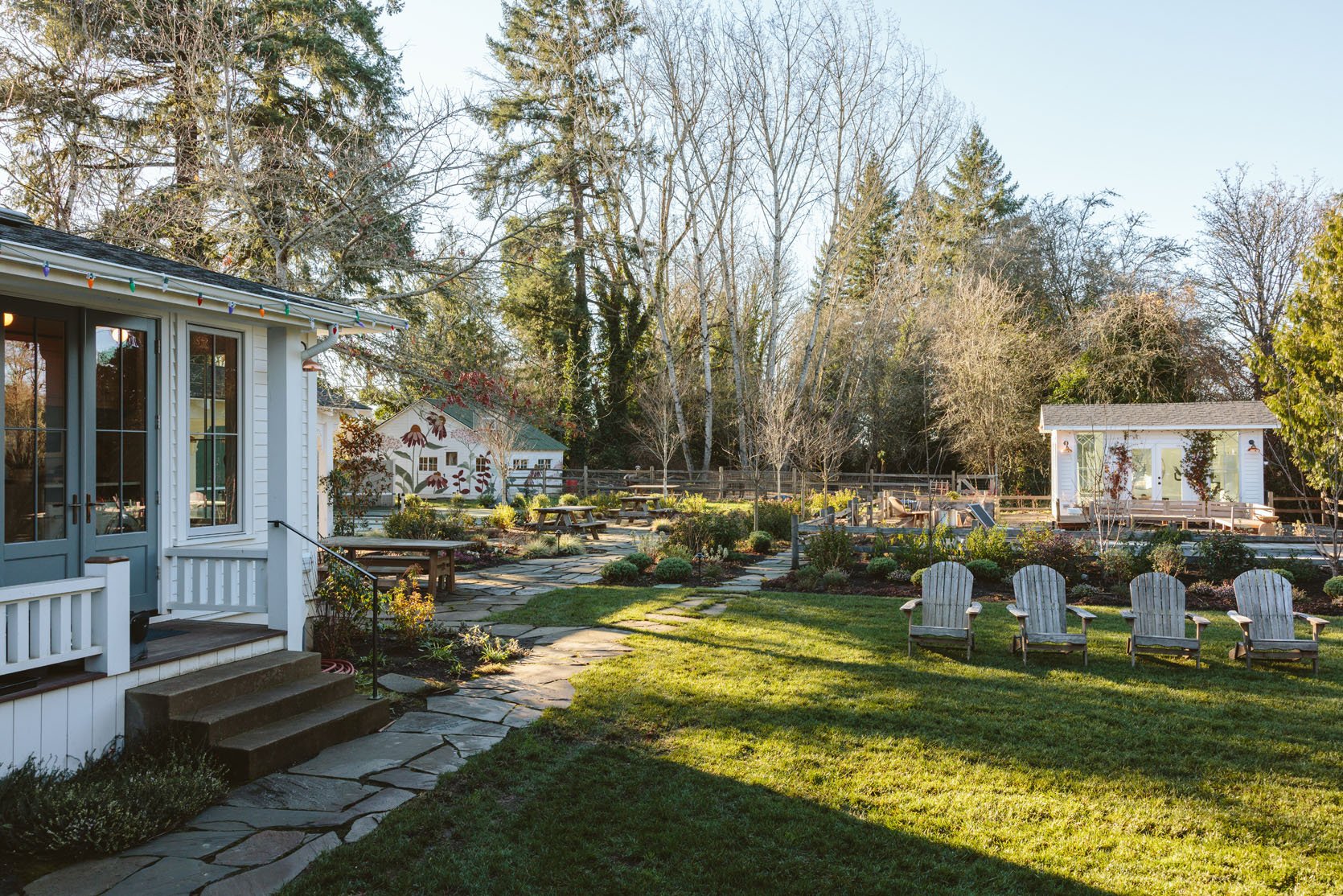I think you’d agree that we don’t get to see enough of the non-perfectly beautiful but super important stuff on the internet that helps inform our design decisions. I had no idea how important having evergreens would be until we lived here through a couple of winters. It’s so gray, wet, and dark in the winter, and if you only have perennials (the showiest flowers, the pretty wildflowers, and generally more my vibe), then the winter looks even sadder. So when Dennis’ 7 Dees reconfigured the sports court and thus added a bunch of landscaping last year, a huge part of the brief was “green, something pretty, year-round”. I was willing to sacrifice and lose some of my favorite varietals for year-round interest. Not like fir trees and boxwood everywhere necessarily, but enough plants that left us with happy visual interest and not just cut-back grasses or lamb’s ears all winter. They agreed, and I trusted them, but it wasn’t until January that I could really see what it would look like, and boy, was I relieved to see that it is indeed so pretty. Now, is it as pretty of a photo tour as summer? Nope. And we didn’t style it at all (or even move our dumb umbrella stands). But I hope it can help you make some decisions, or at least feel seen that you aren’t the only one with a maybe less beautiful yard during the darker months.
