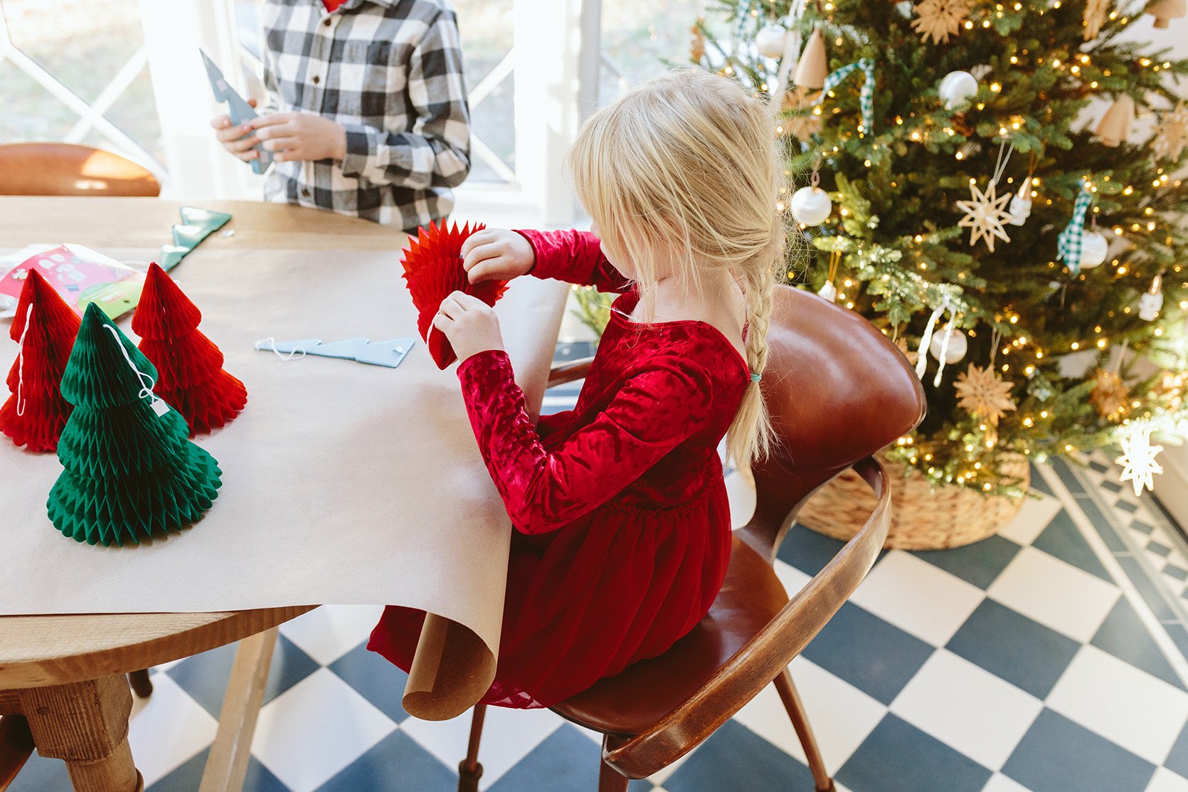 I think the modern-day paper tree was inspired by these party favors that Elliot is playing with (the high-end ones aren’t made out of crepe paper and can last year after year), I have many from years ago that are still in great shape.