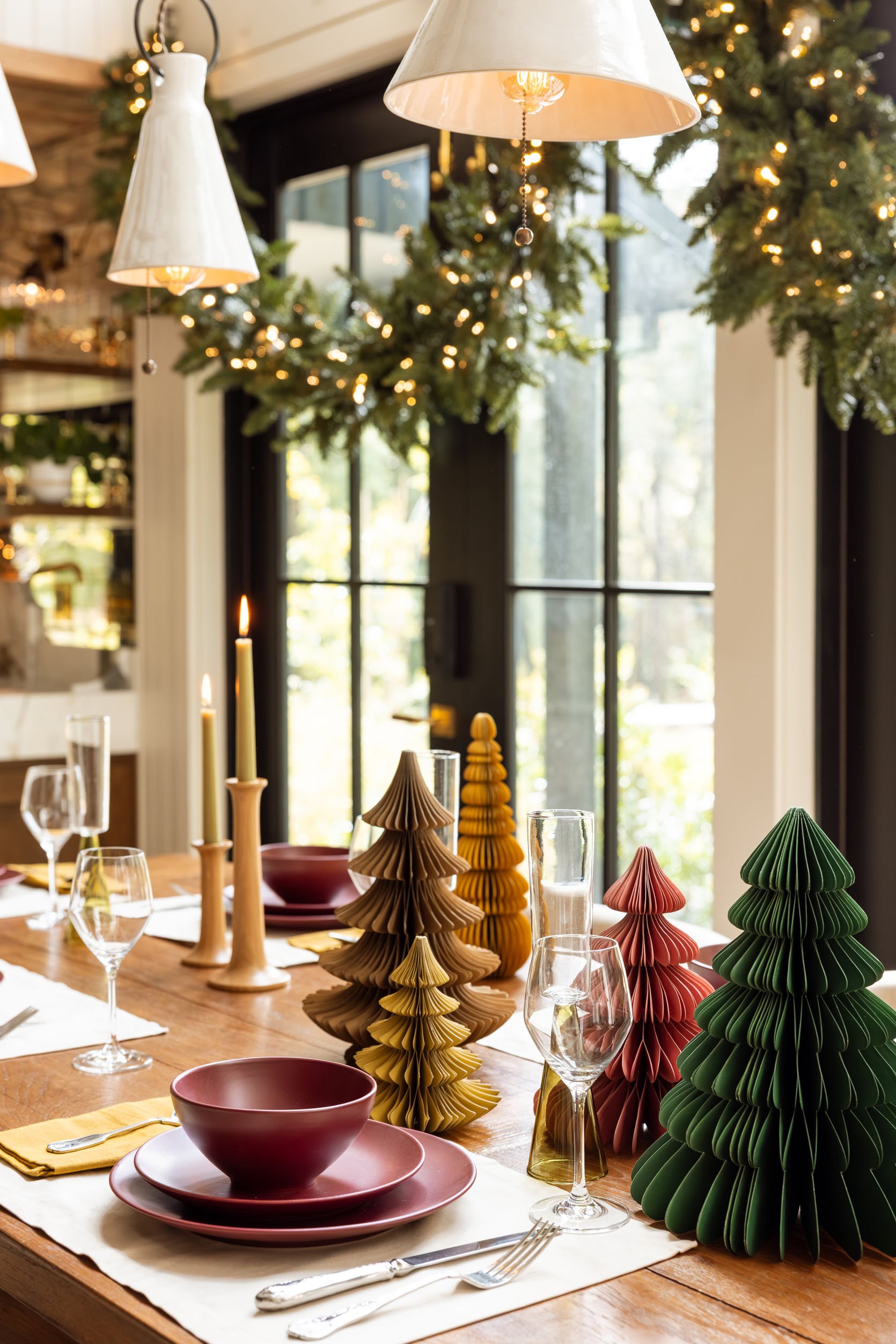 Now, to your holiday inventory that might make your life easier. Folding paper tree is hero #1. These open up for high impact, different shapes, and instant decor. And then fold down to fit in a tiny box.
