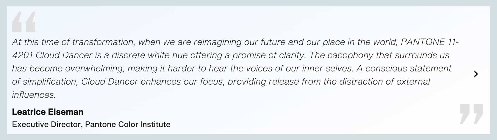 PANTONE 11-4201 Cloud Dancer to be exact: “A lofty white that serves as a symbol of calming influence in a society rediscovering the value of quiet reflection.” Hmm…interesting choice of words.