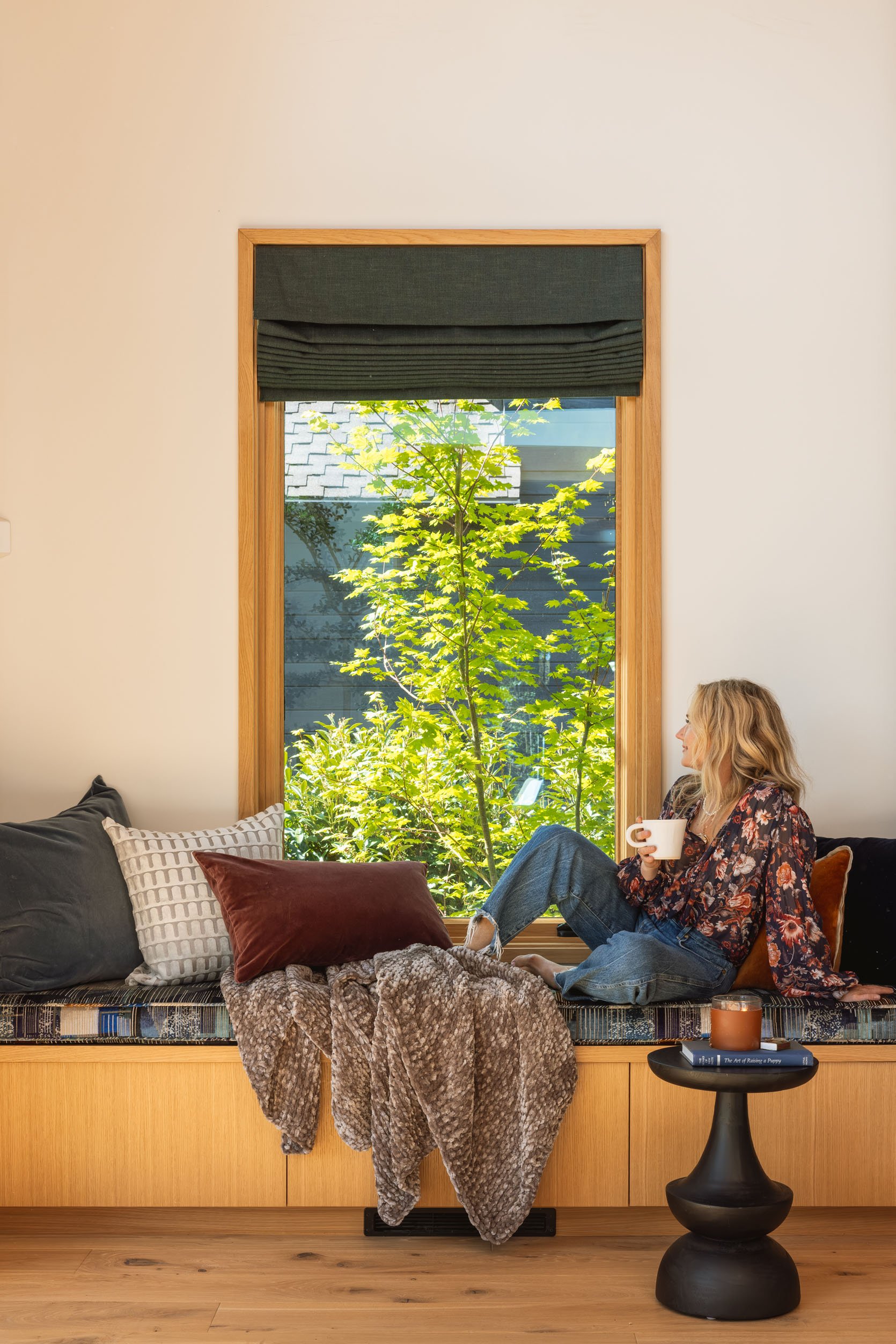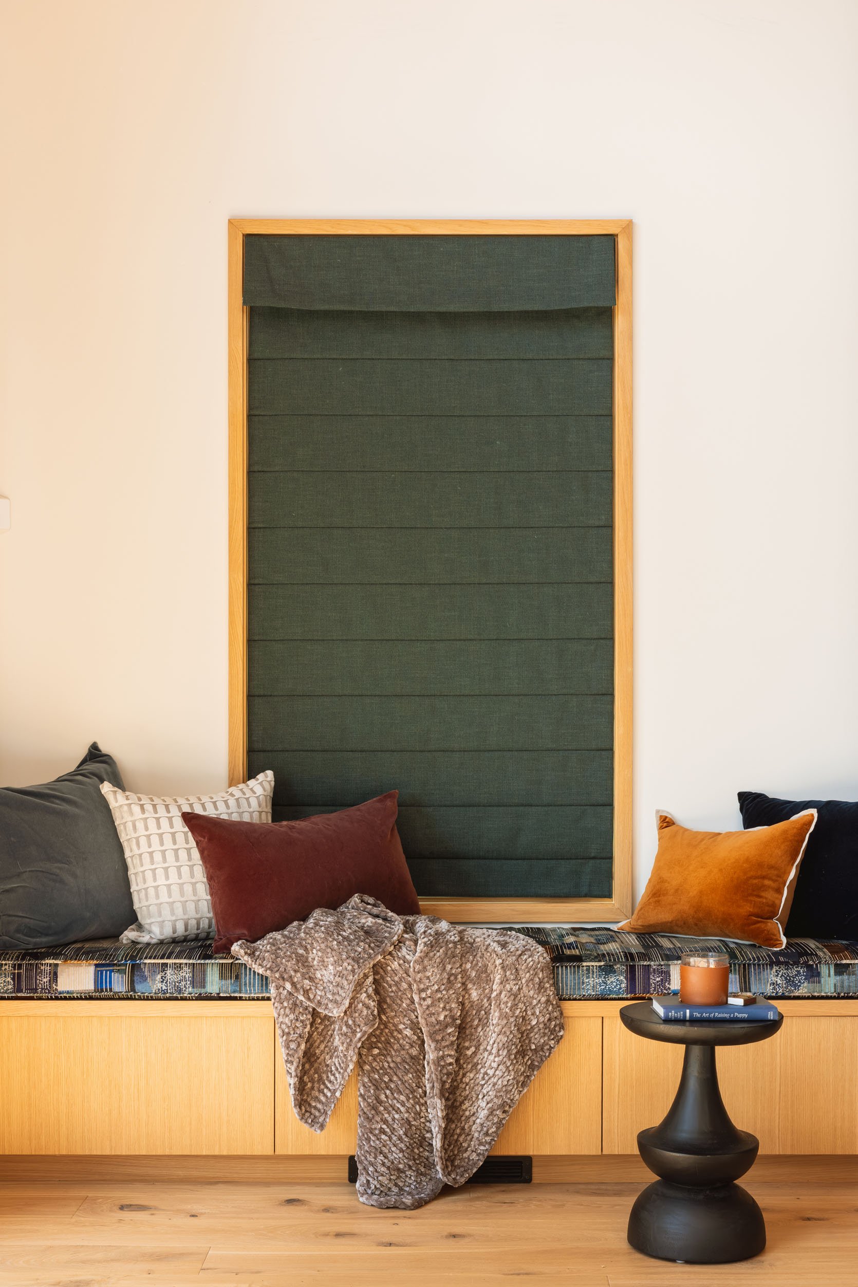 Roman Shades | Pollack Fabric | Bench Pillows, left to right: Relaxed Washed Organic Velvet | Cut Velvet Archways Pillow | Italian Velvet Pillow | Classic Cotton Velvet Pillow | Italian Velvet Pillow | Throw Blanket | Side Table