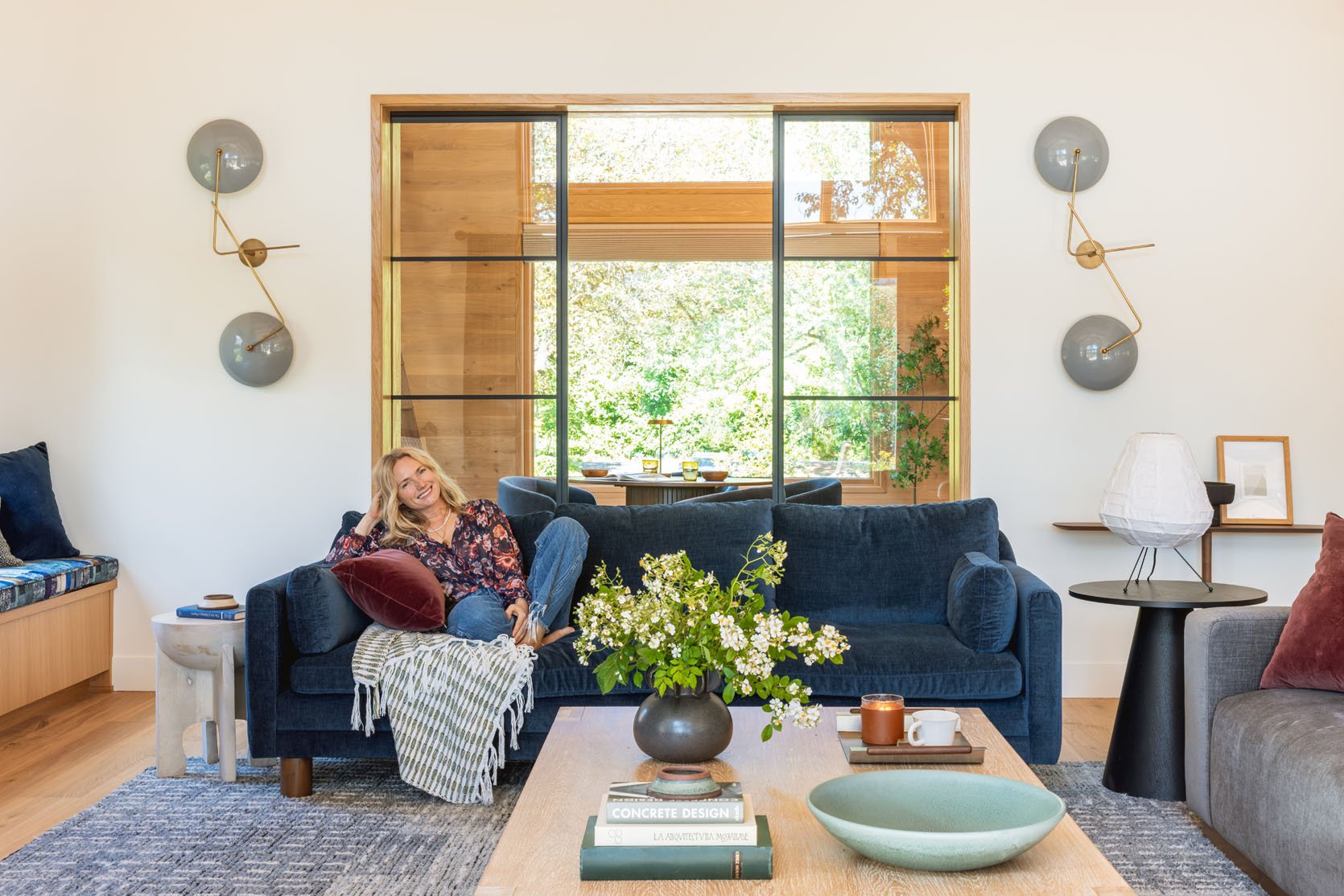 Looking back towards the game room, you have a lady who is seemingly very comfortable on her sofa (perhaps because it’s rated one of the most comfy sofas in the world??). I love those Blueprint sconces that act as sculptures and the glass doors that create a really cool architectural element. Shout out to the $30 World Market lamp (don’t ever accuse me of being a design snob – I’m picky, but not snobby).