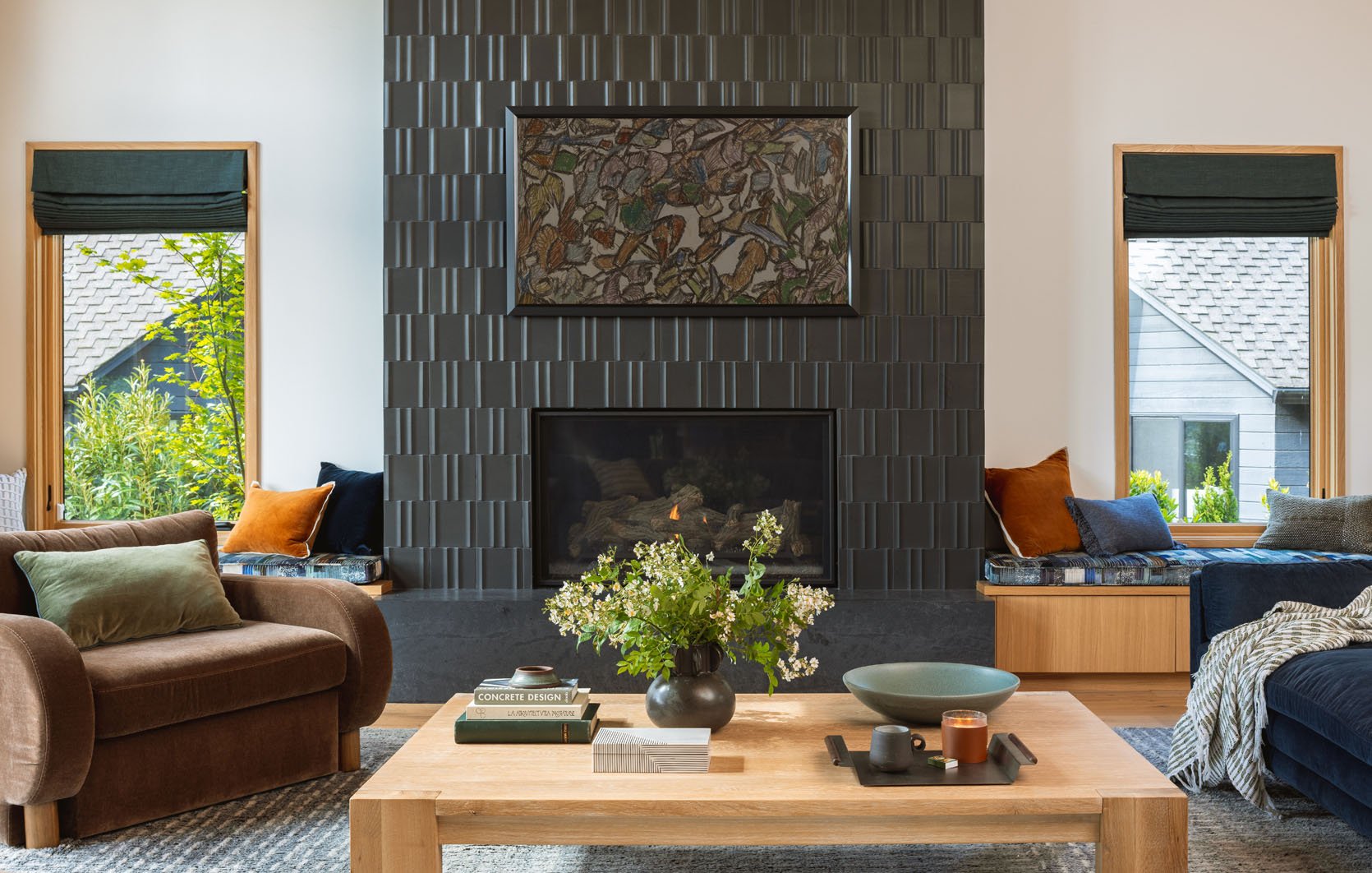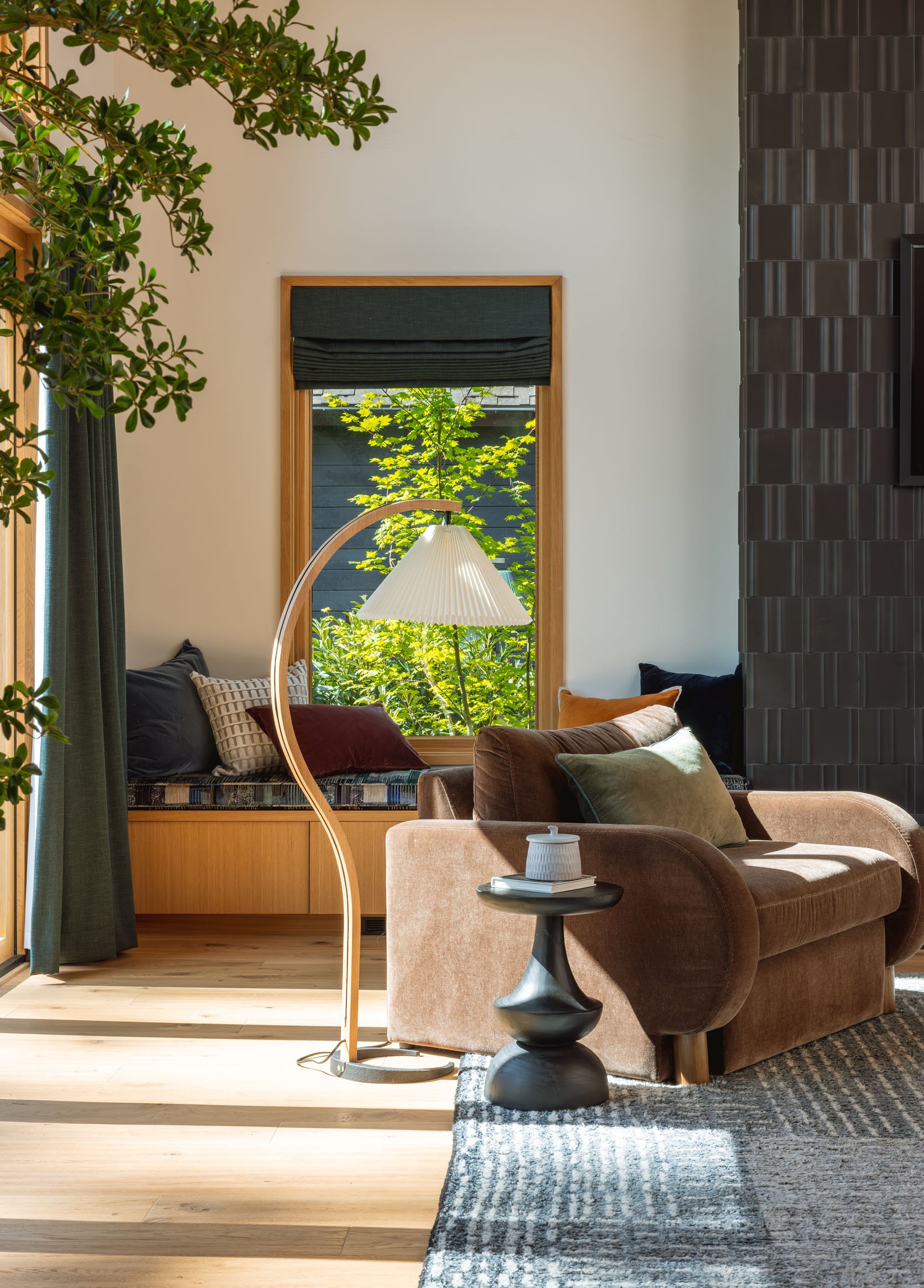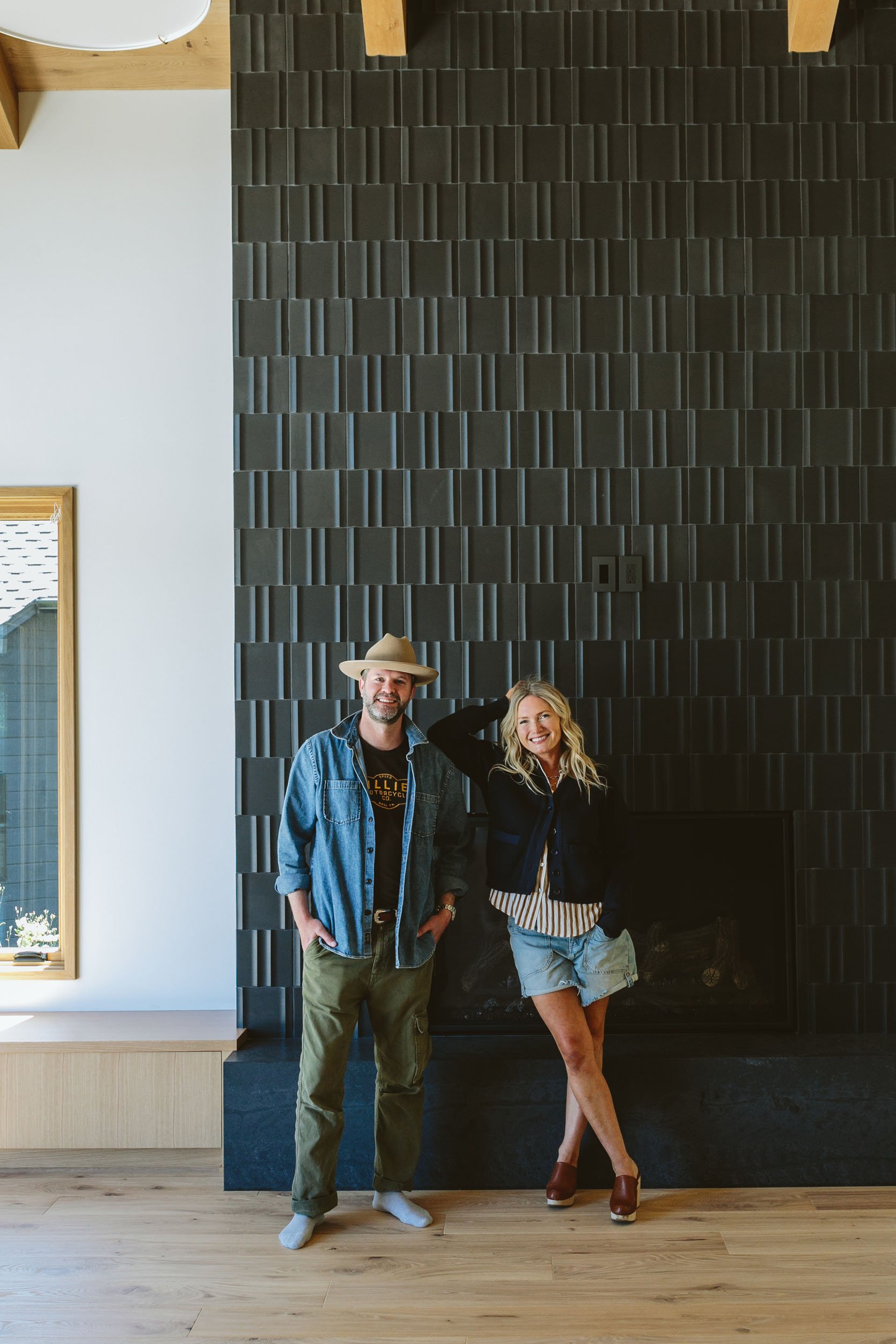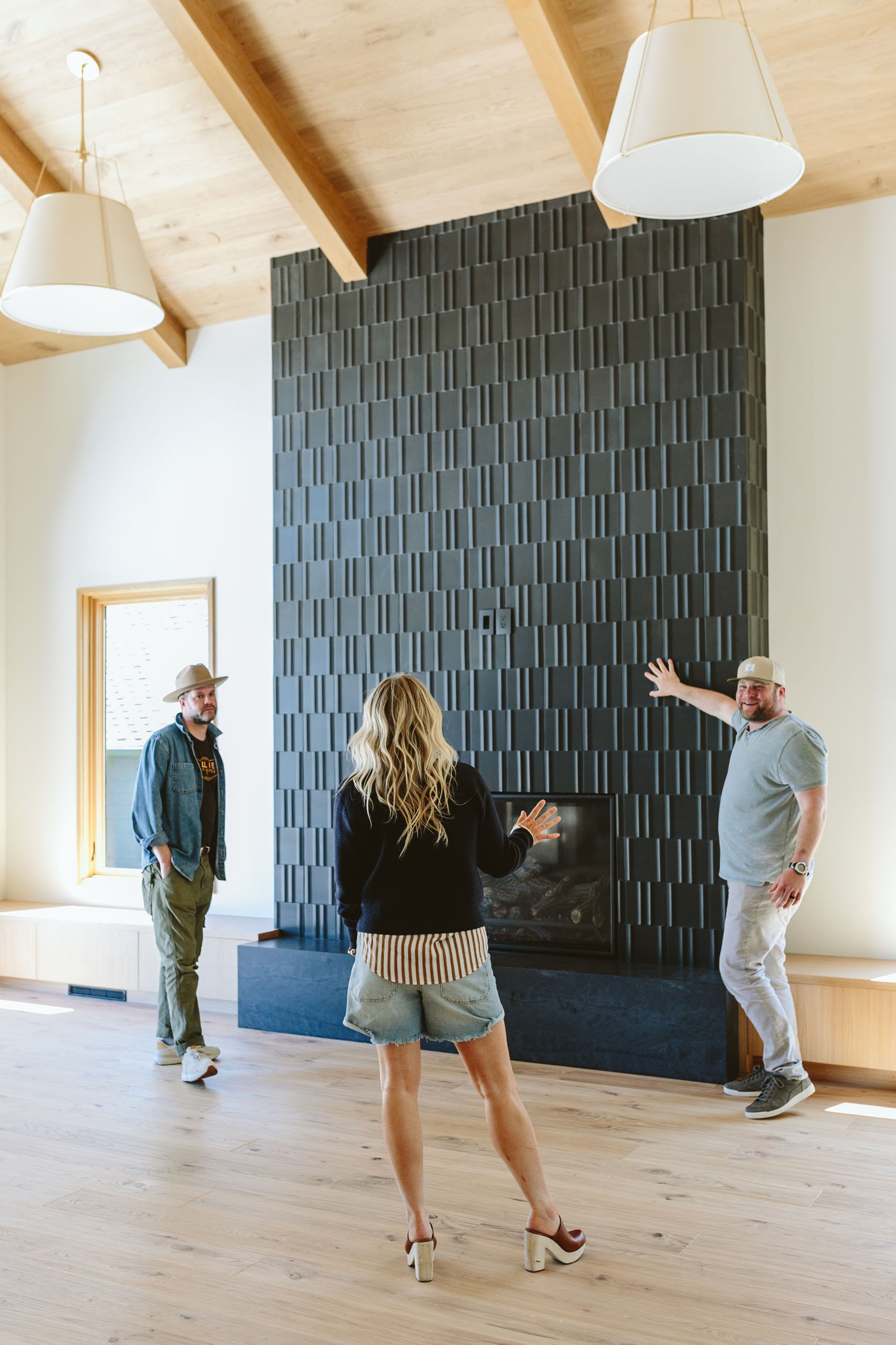 Ken/Katie, Max, and I all went to Ann Sacks, who was partnering with me on this home, to choose the fireplace tile, and we were extremely drawn to this 3-dimensional, incredible tile. We knew that it would be high impact but quiet (Ken and Katie don’t love flashy design) while catching the light in a way that added a pattern and texture. It’s truly excellent. Now, the reason we chose black was because we knew that they wanted to hang a TV in here. We seriously debated the green, but I felt strongly that if they were going to hang a TV on it, it needed to be black so as not to break it up visually as much.