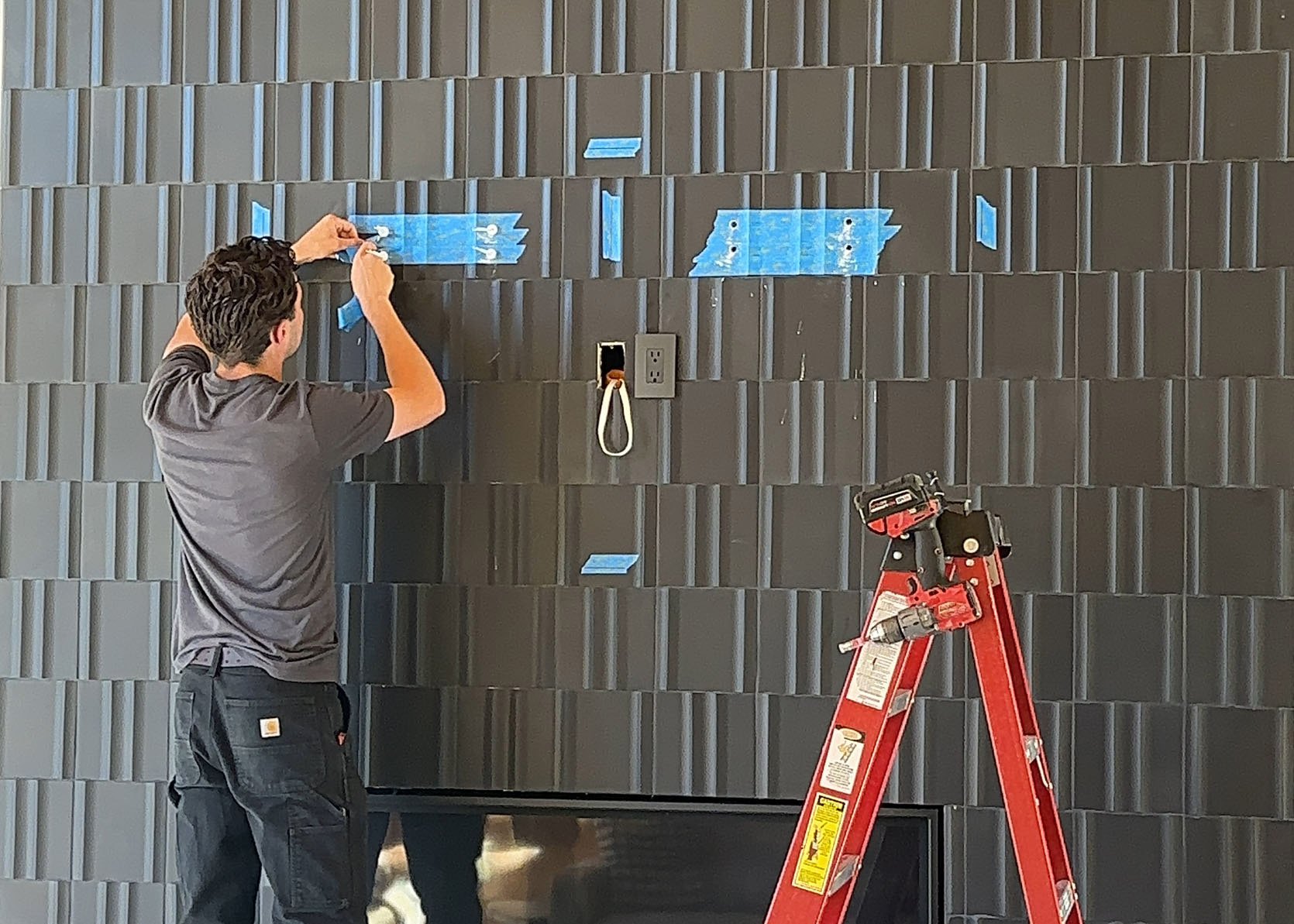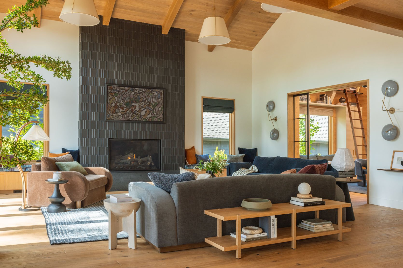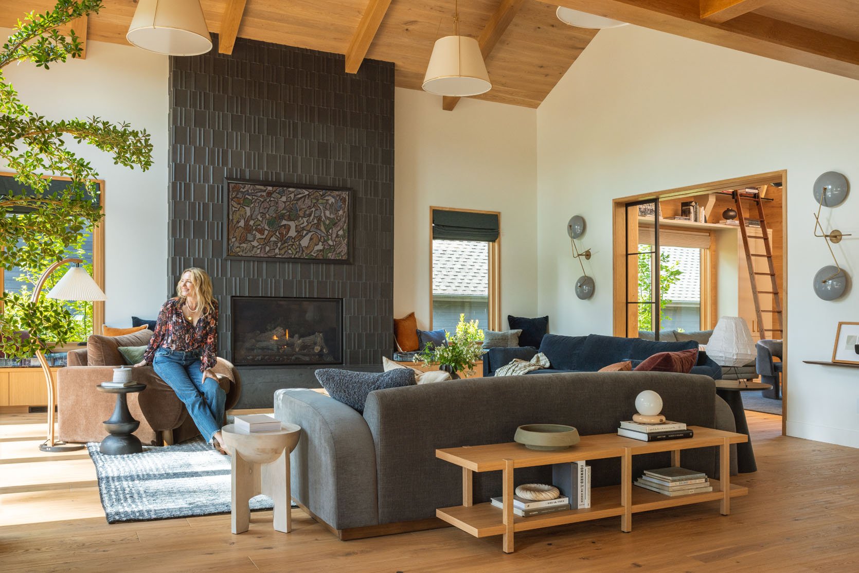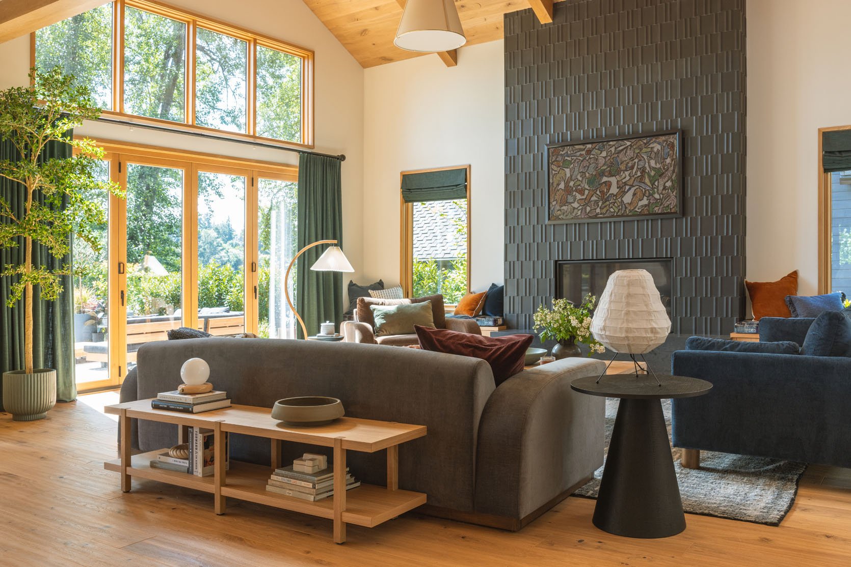 Ken/Katie, Max, and I all went to Ann Sacks, who was partnering with me on this home, to choose the fireplace tile, and we were extremely drawn to this 3-dimensional, incredible tile. We knew that it would be high impact but quiet (Ken and Katie don’t love flashy design) while catching the light in a way that added a pattern and texture. It’s truly excellent. Now, the reason we chose black was because we knew that they wanted to hang a TV in here. We seriously debated the green, but I felt strongly that if they were going to hang a TV on it, it needed to be black so as not to break it up visually as much.