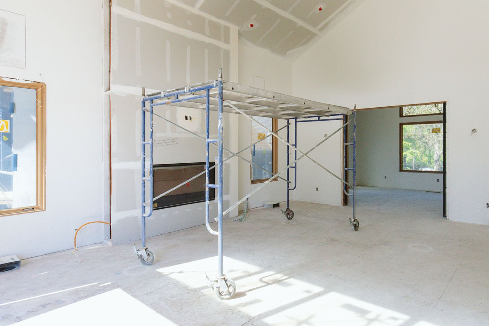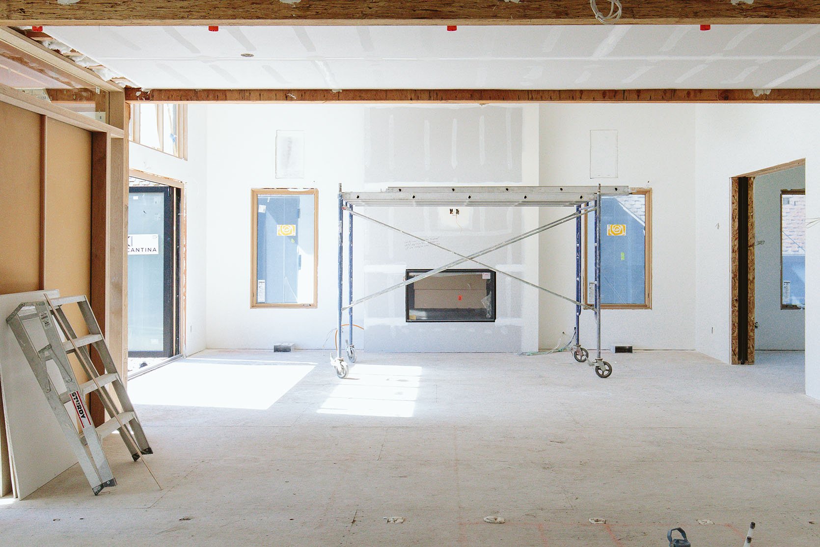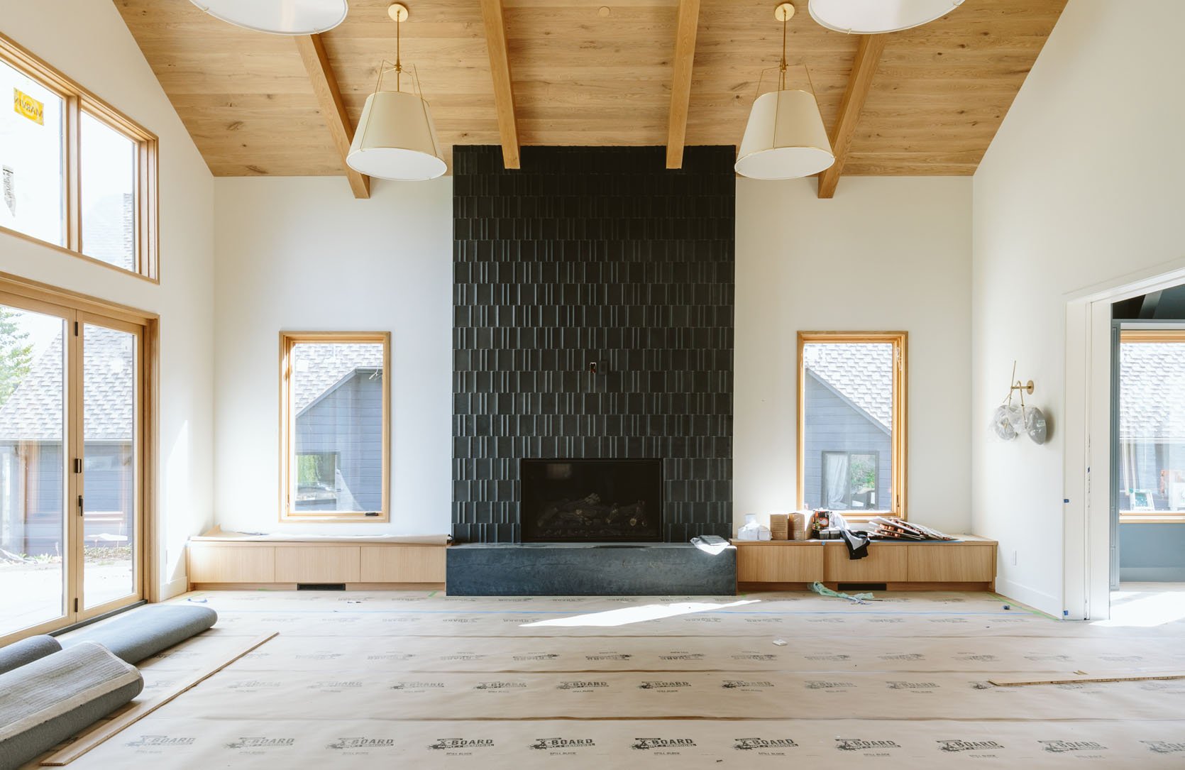 My biggest design decisions were the fireplace tile and the lighting. The ceiling lights were chosen because they were the perfect scale for the room and they gave off the light that we wanted, while being stylistically simple. While having really high ceilings might not be your everyday relatable problem, if you should find yourself so lucky, make sure that your lighting is scaled to the size of the ceiling and you aren’t staring up at a bulb searing your eyeballs. These look like hanging lamps, with warm fabric shades that give off a lot of light (there are four of them after all), but never harsh on your eyes because they have a diffuser underneath. And the fact that we could adjust the drop to help bring the ceiling down (making it feel warmer, more intimate) sold us. They aren’t distracting. They don’t pull your eye too much. They are, quite literally, the perfect choice (she pats herself on the back here).