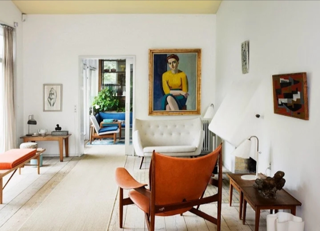 Someone was asking about details of the amazing art on the post about the magazine article. How wonderful to find it is a collage and the artist is Sharlene Kayne. I thought it was a master study. The original painting “Portrait of Hanne Wilhelm Hansen” by Vilhelm Lundstrom hangs in Finn Juhl’s house which is now a museum (it’s a portrait of his wife).