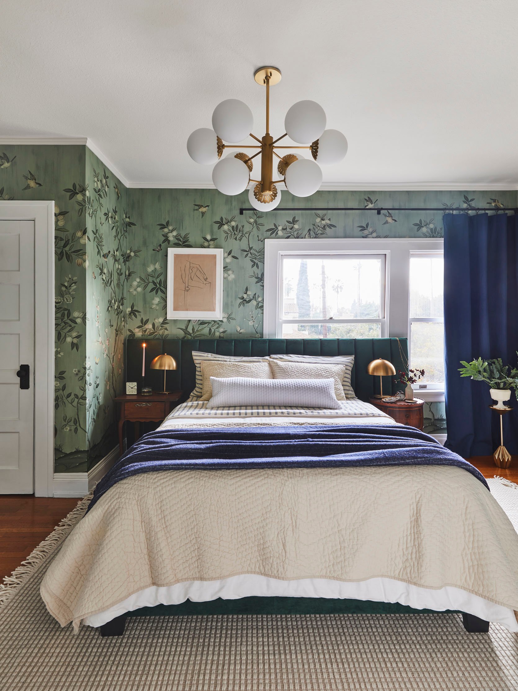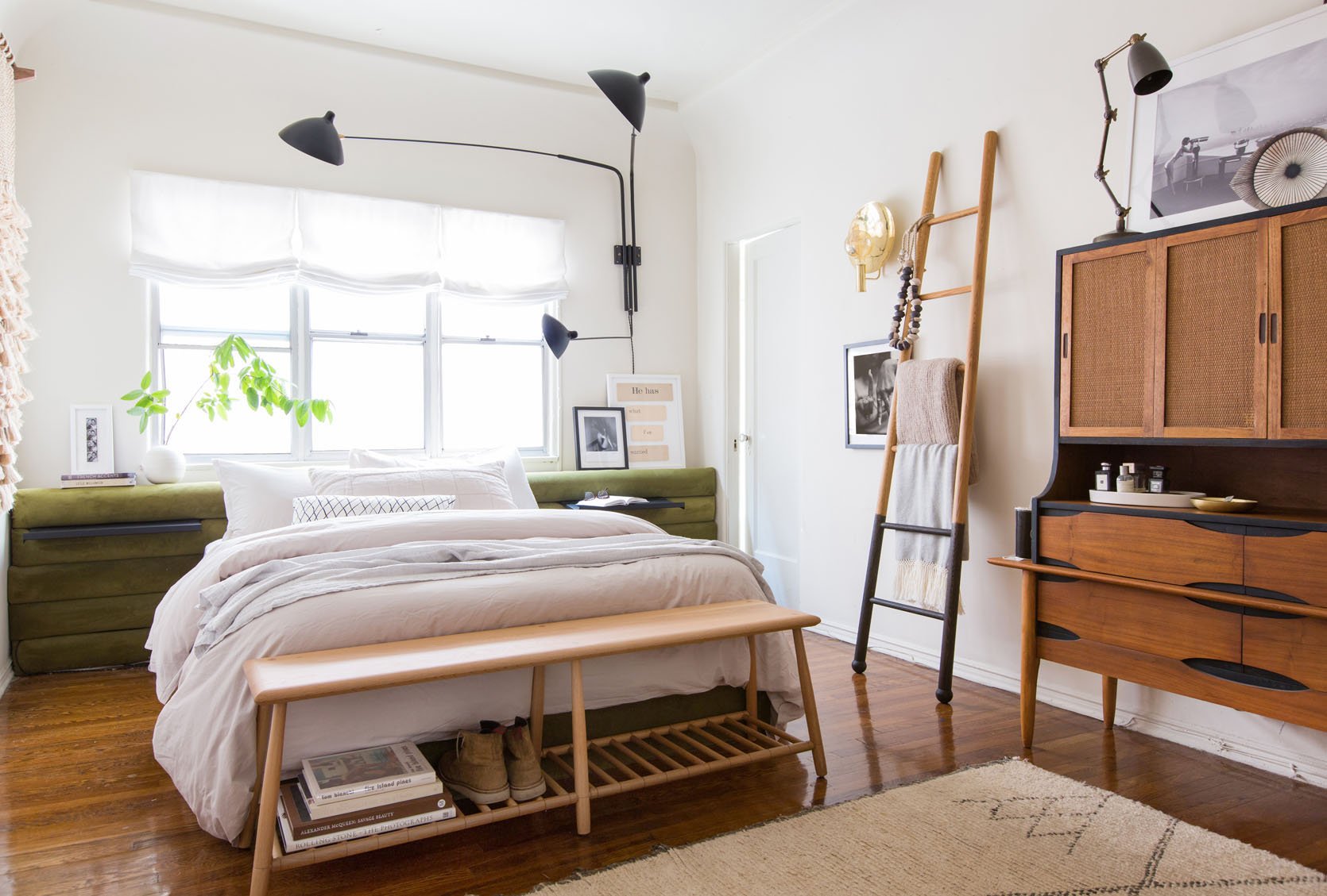 What Emily did in her old LA primary bedroom was pretty perfect. She chose a low spindle bed, which lets all the pretty light through (and as you know, she wants ALL the pretty light, all the time). But if you want an upholstered bedframe, that’s ok too! But here’s our rules of thumb for this situation: