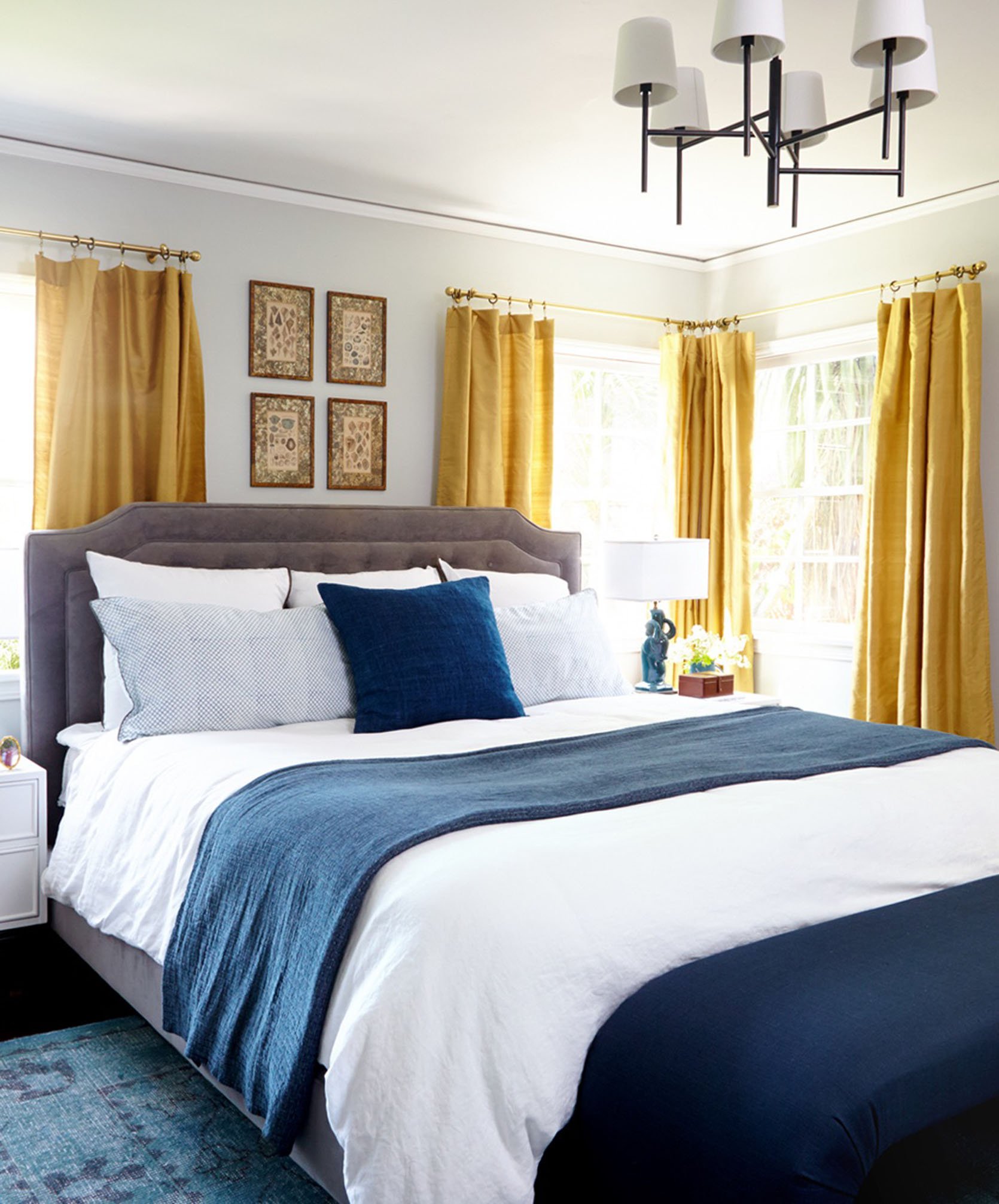 Another option, if you have enough space, is to more or less ignore the space in between the windows entirely and go more “dramatic” with a long, low headboard that spans both windows. Always make sure you’re not blocking the majority of the window, and you’ll have a stunning statement bed. But again, pull that bed far enough away from the window wall to give room for any window treatments.