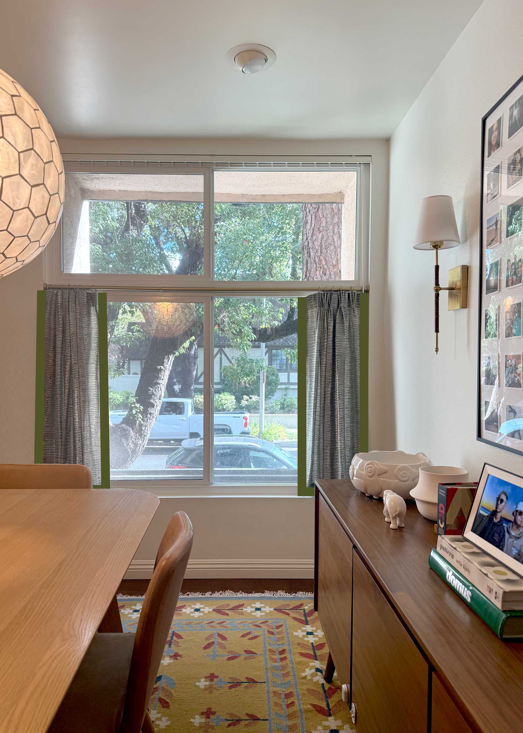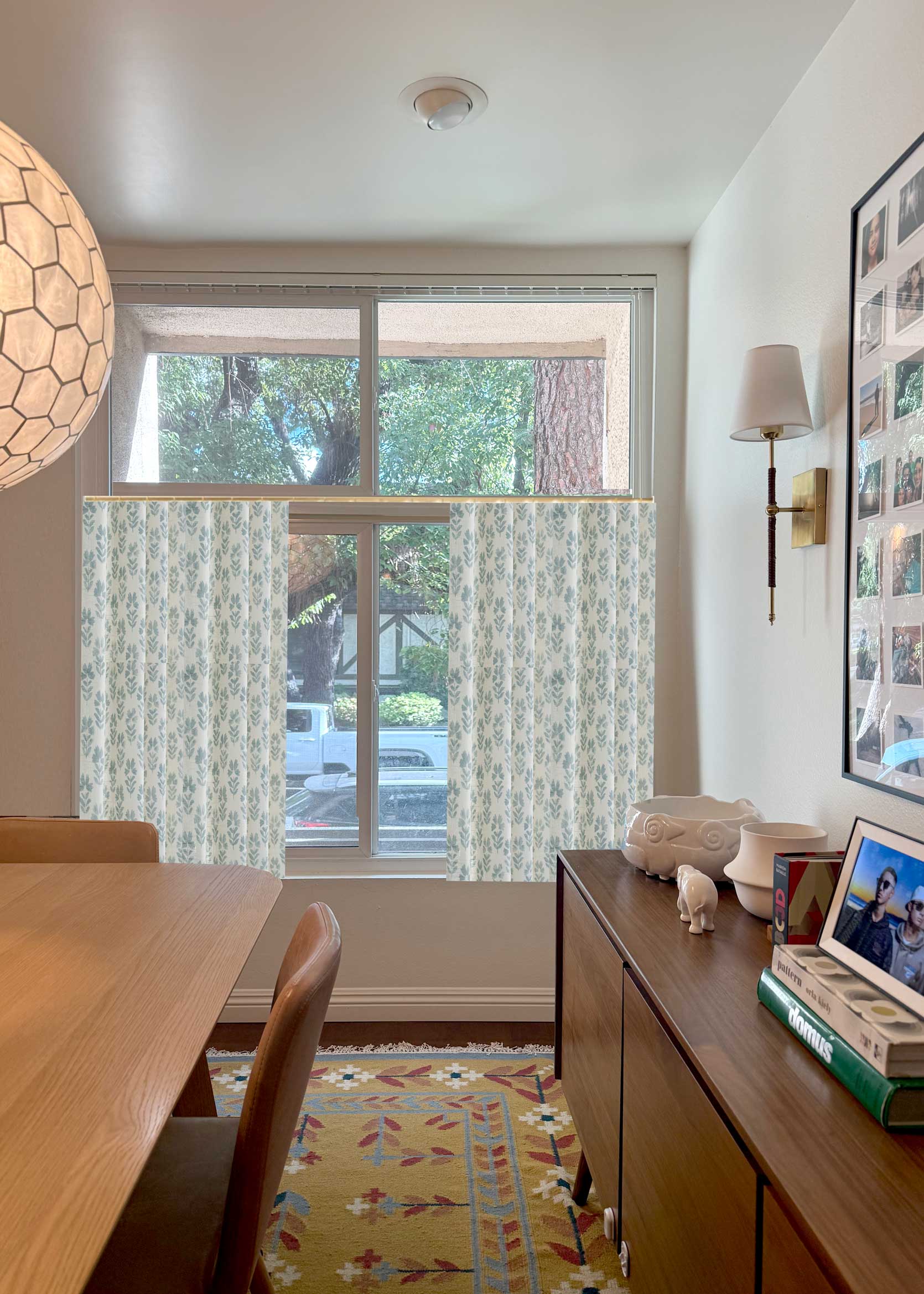 Before settling on this design years ago, I contemplated doing curtain panels, but I really wanted to try something different. Not to mention the ceiling height in my dining room is fairly low, and I thought long drapes would overpower the space that already had a ton of large-scale furniture in it. That, and our home’s perimeter consists of at least a dozen old-growth camphor and pine trees, which means that even though our windows are gargantuan, they do not let in much light. Blocking any of that sunlight, especially from the top part of the window, felt criminal.