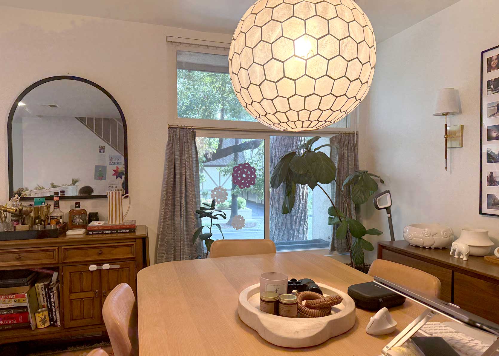 Unrelated, this is a good photo to see the space a bit better and how it typically looks. The bar is cluttered, my workspace takes up one side of the dining table, the corner is the only place we can plug in our Tineco wet mop, and there are a few plants by that window holding on for dear life. It feels busy, overly tight, but also somehow kind of boring.