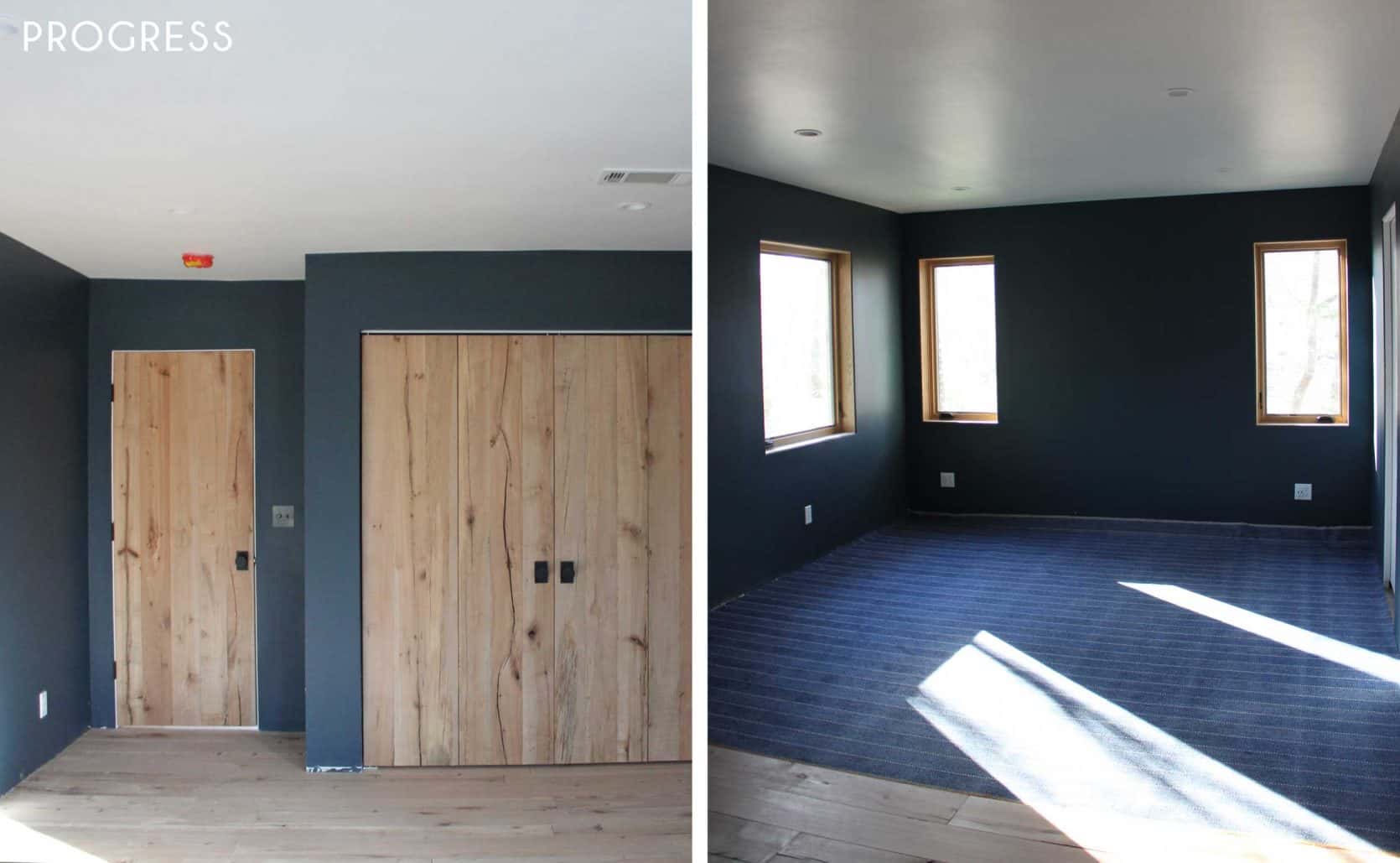 Now I didn’t choose this color (the architect William Hunter did), and it’s just so good. Certainly muted and leaning towards charcoal, this French Beret blue does have a lot of gray in it, helping it read muted, sophisticated, and wonderfully moody. We LOVED it in person so much, and it was great for this darker space (the doors lead to a covered patio) and made this smallish bedroom feel bigger. Kudos to him for doing the closets (see below) and curtains in the same color.